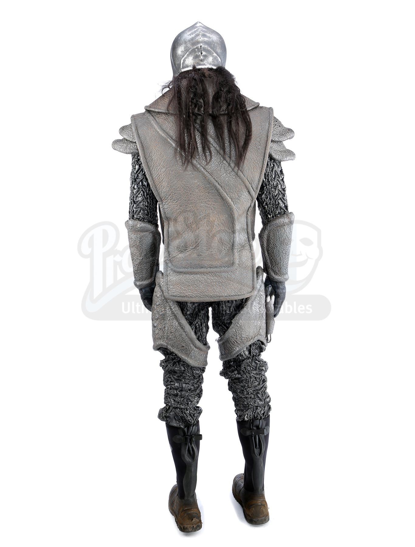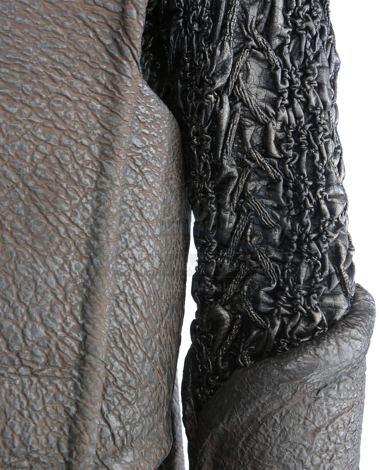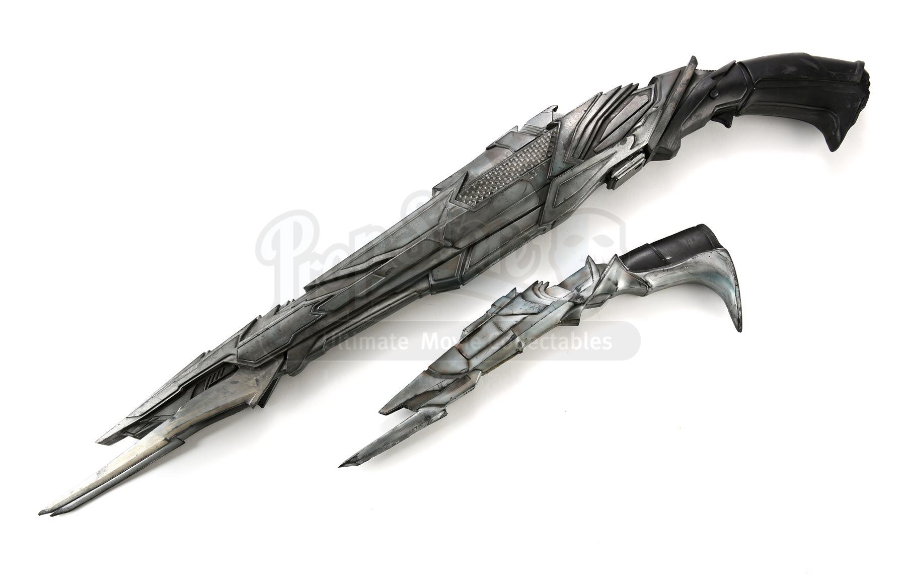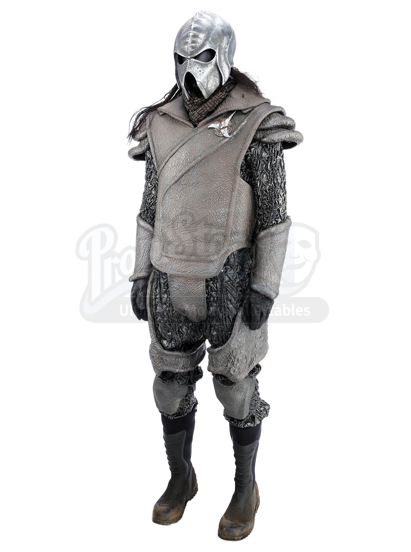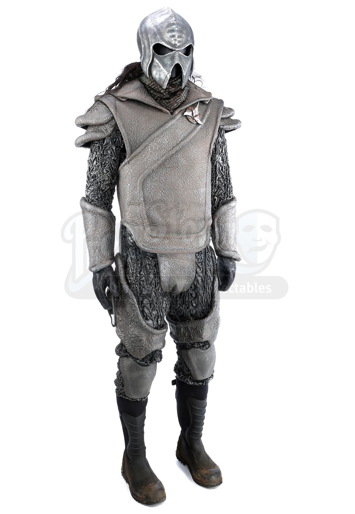 A Klingon guard uniform and disruptor weapons from Star Trek Into Darkness. Klingon guards wore their uniforms when Khan ambushed them on Kronos. Made specifically for the sequel, the costume consists of chest armor, shoulder guards with an elastic harness, a scarf, a long-sleeved shirt (extra large), an undershirt (extra large), two pairs of gloves, arm bracers, a codpiece, pants (approximate size 32), thigh guards, kneepads, a helmet, a light-up full-length Klingon disruptor, a Klingon disruptor, and a pair of boots (marked U.S. size 14).The chest armor, shoulder guards, thigh guards, kneepads, arm bracers and codpiece are all made of foam and mimic elephant hide by incorporating faux leather made of china silk and terrycloth that features a scale design. The scarf is made of a synthetic material and lined with Spandex. The long-sleeved shirt consists of glossy, textured sleeves made of faux leather stitched to a black Spandex sport shirt. The pants are made of the same textured synthetic material and include black nylon suspenders. The undershirt consists of black Spandex sport shirt. The gloves are black leather and suede. The helmet is dense urethane and is finished with metallic silver and grey and features both human and synthetic hair. Both the full-length disruptor and disruptor are painted in metallic shades of silver and are made of foam urethane. The full-length disruptor also includes green LED light panels on the sides of the body that illuminate with the push of a button. The boots are made of black neoprene and rubber, and are distressed with dirt.The costume features hand-written wardrobe labels in the long-sleeved shirt, shoulder guards, arm bracers, gloves, pants, the codpiece, thigh guards, and kneepads marked with the actor's name. The boots also have hand-written wardrobe labels marked with the name of another background actor. Also included are wardrobe tags with hand-written notes about the costume. The costume shows minor wear but remains in overall good condition.As this item contains electronic components, every effort has been made to describe them accurately; however, no guarantee or warranty is made as to functionality, lifespan or safety of those components. It is entirely incumbent on the new owner to satisfy themselves as to their safe use and maintenance.