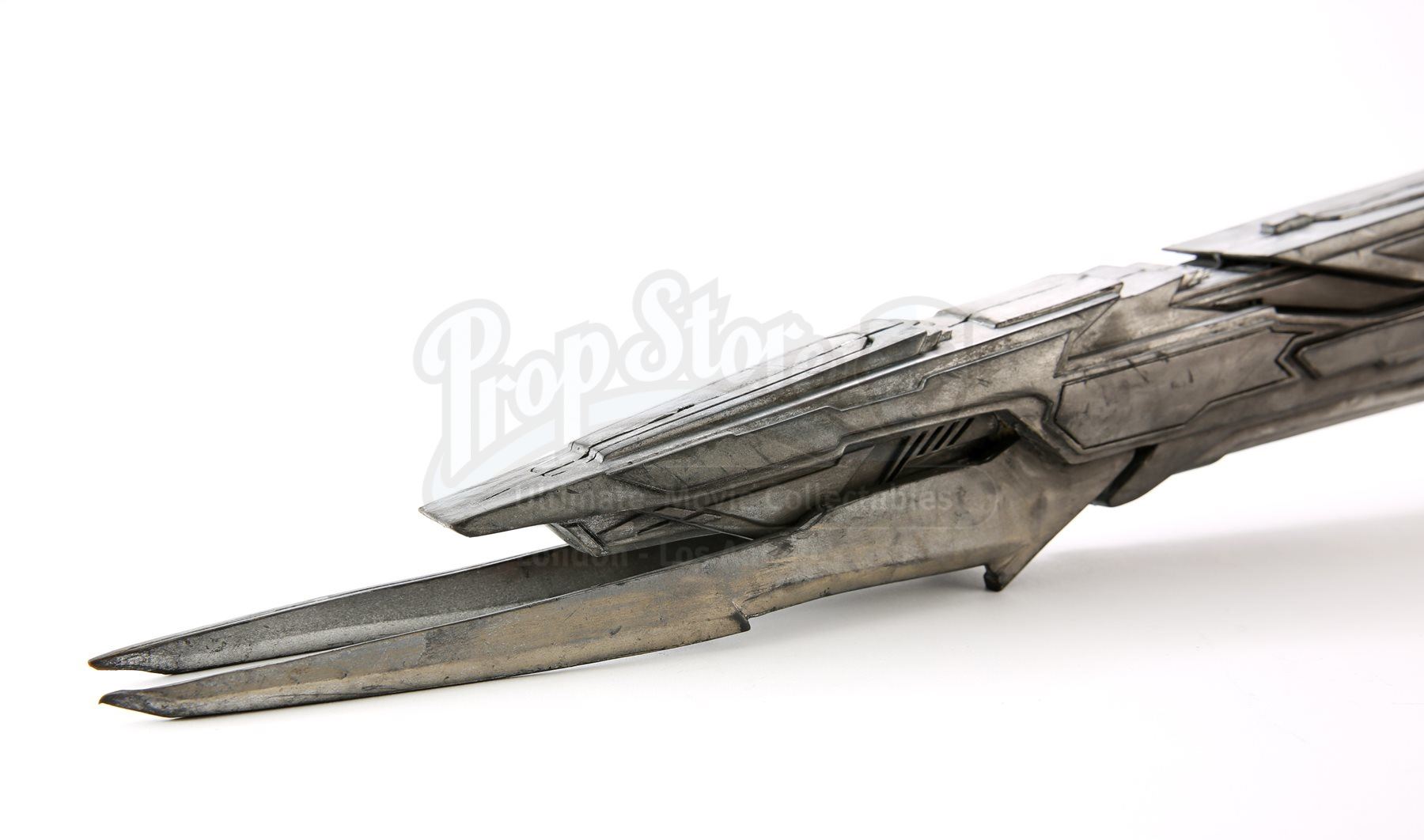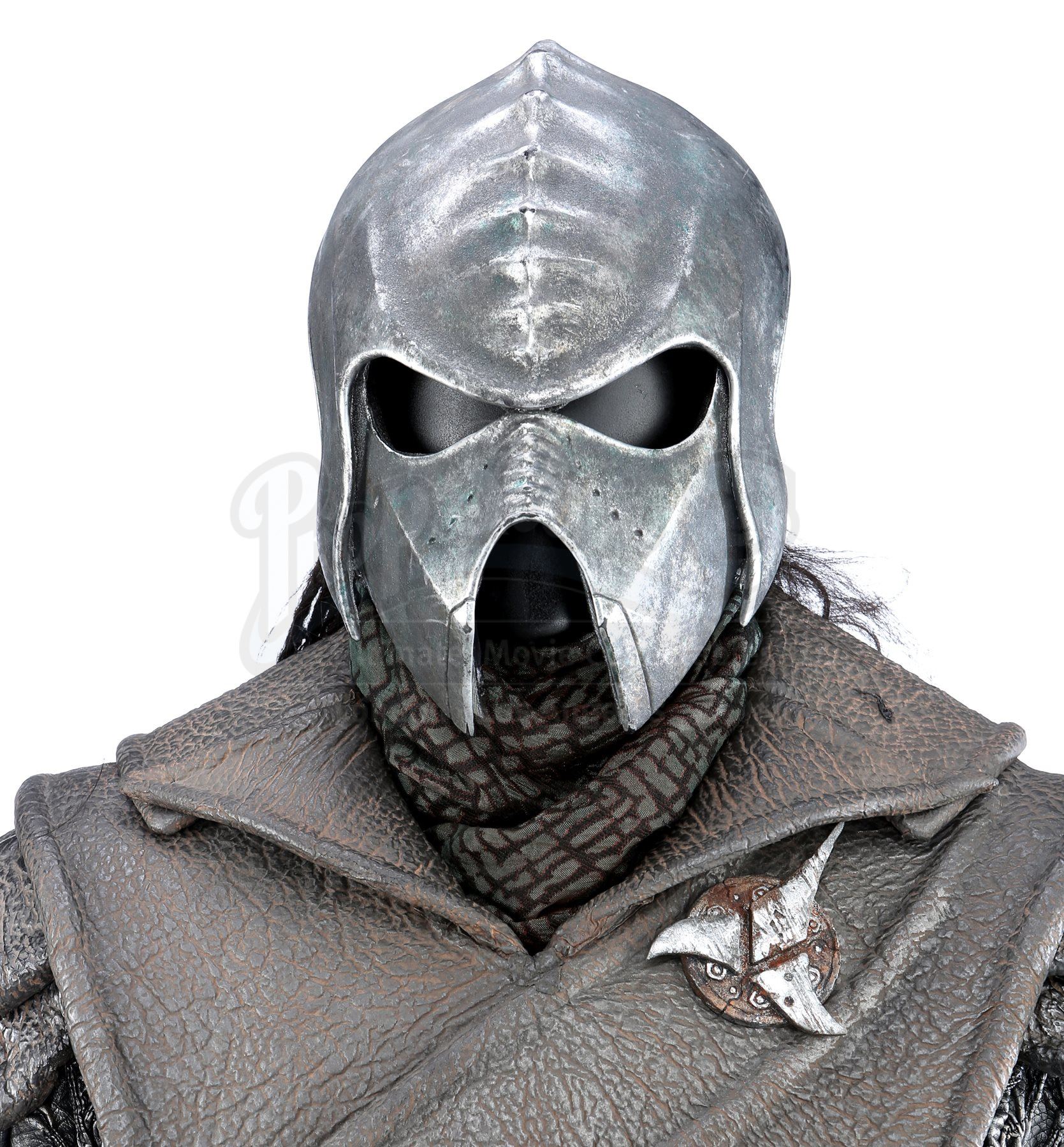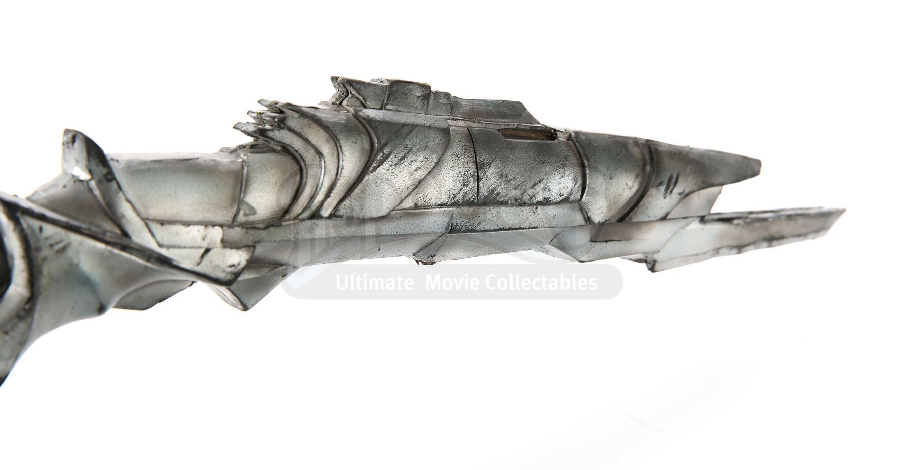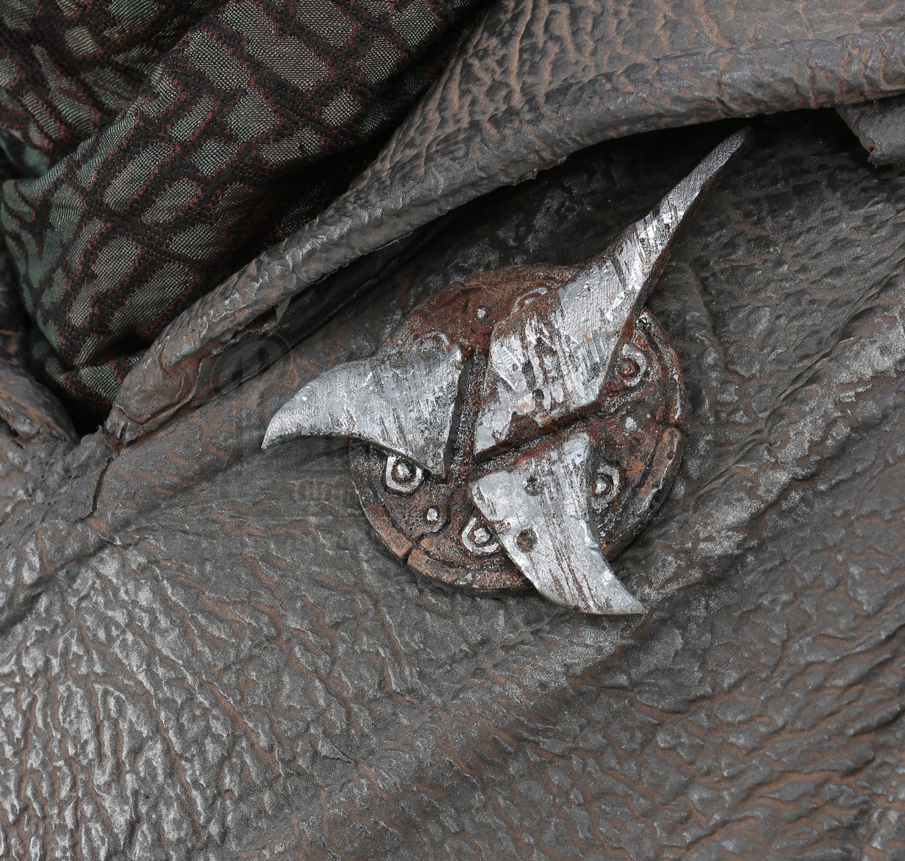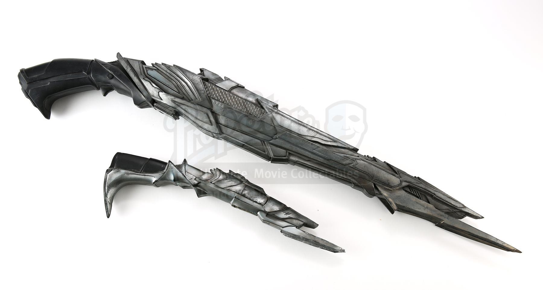 A Klingon guard uniform and disruptor weapons from Star Trek Into Darkness. Klingon guards wore their uniforms when Khan ambushed them on Kronos. Made specifically for the sequel, the costume consists of chest armor, shoulder guards with an elastic harness, a scarf, a long-sleeved shirt (extra large), an undershirt (extra large), two pairs of gloves, arm bracers, a codpiece, pants (approximate size 32), thigh guards, kneepads, a helmet, a light-up full-length Klingon disruptor, a Klingon disruptor, and a pair of boots (marked U.S. size 14).The chest armor, shoulder guards, thigh guards, kneepads, arm bracers and codpiece are all made of foam and mimic elephant hide by incorporating faux leather made of china silk and terrycloth that features a scale design. The scarf is made of a synthetic material and lined with Spandex. The long-sleeved shirt consists of glossy, textured sleeves made of faux leather stitched to a black Spandex sport shirt. The pants are made of the same textured synthetic material and include black nylon suspenders. The undershirt consists of black Spandex sport shirt. The gloves are black leather and suede. The helmet is dense urethane and is finished with metallic silver and grey and features both human and synthetic hair. Both the full-length disruptor and disruptor are painted in metallic shades of silver and are made of foam urethane. The full-length disruptor also includes green LED light panels on the sides of the body that illuminate with the push of a button. The boots are made of black neoprene and rubber, and are distressed with dirt.The costume features hand-written wardrobe labels in the long-sleeved shirt, shoulder guards, arm bracers, gloves, pants, the codpiece, thigh guards, and kneepads marked with the actor's name. The boots also have hand-written wardrobe labels marked with the name of another background actor. Also included are wardrobe tags with hand-written notes about the costume. The costume shows minor wear but remains in overall good condition.As this item contains electronic components, every effort has been made to describe them accurately; however, no guarantee or warranty is made as to functionality, lifespan or safety of those components. It is entirely incumbent on the new owner to satisfy themselves as to their safe use and maintenance.