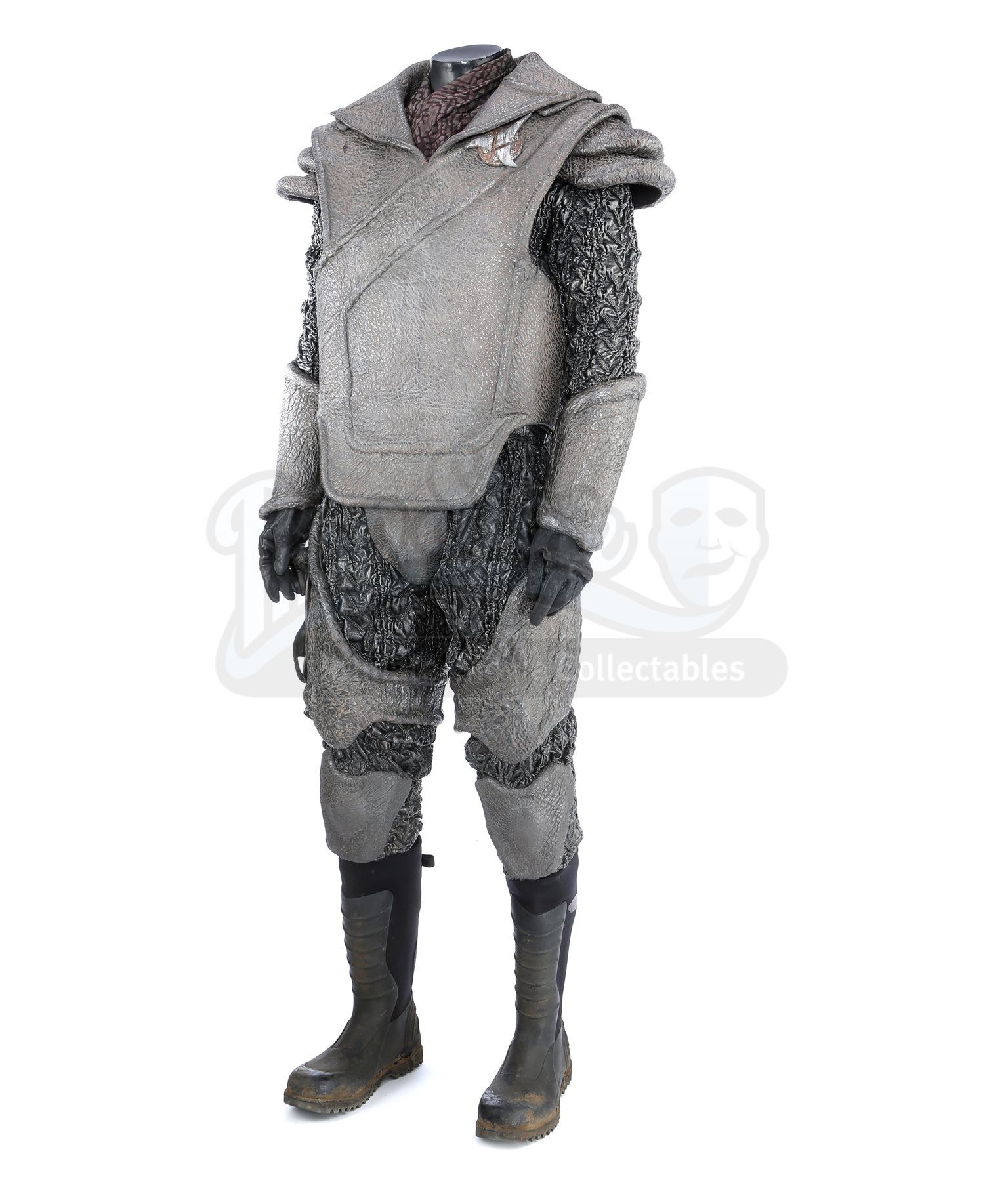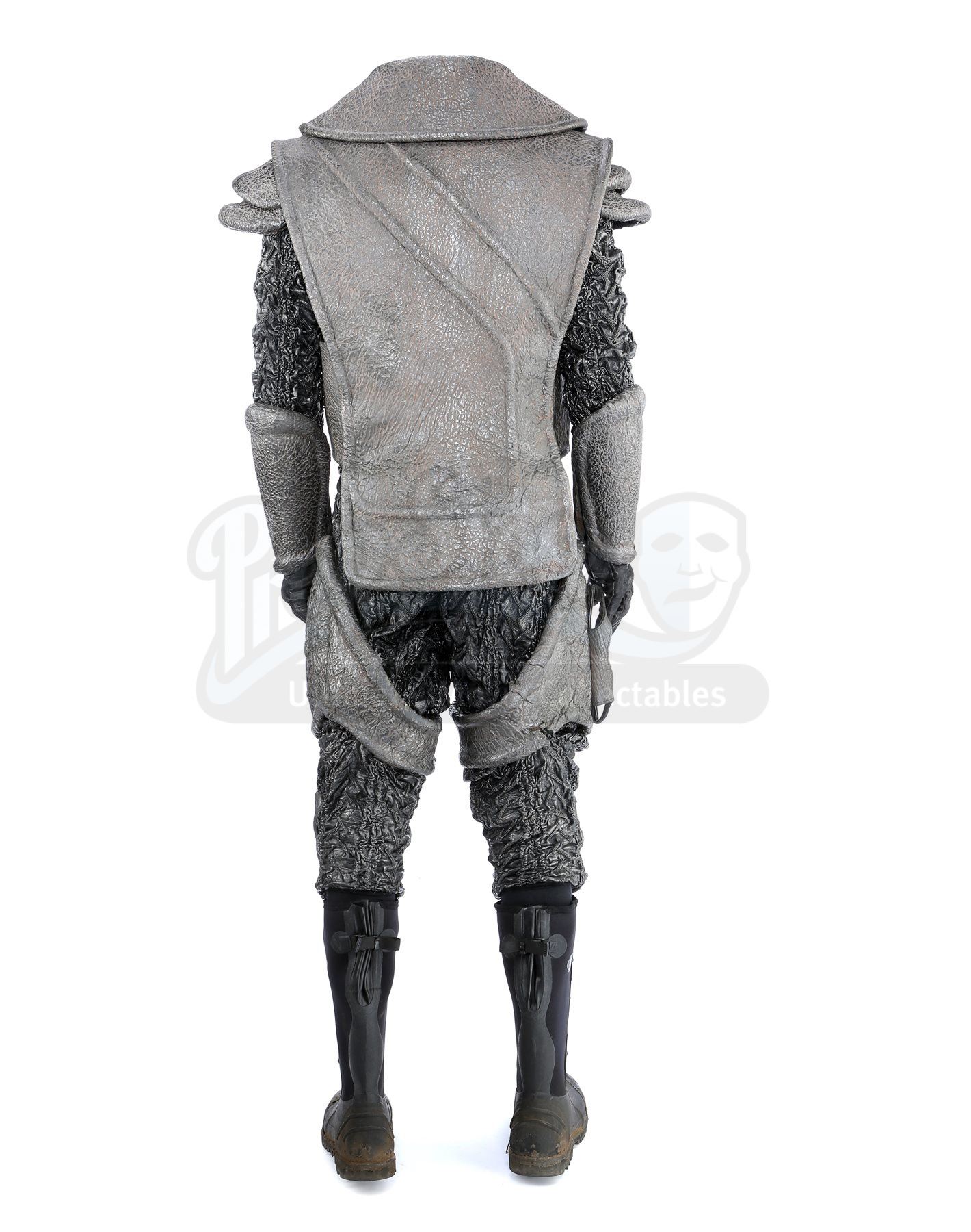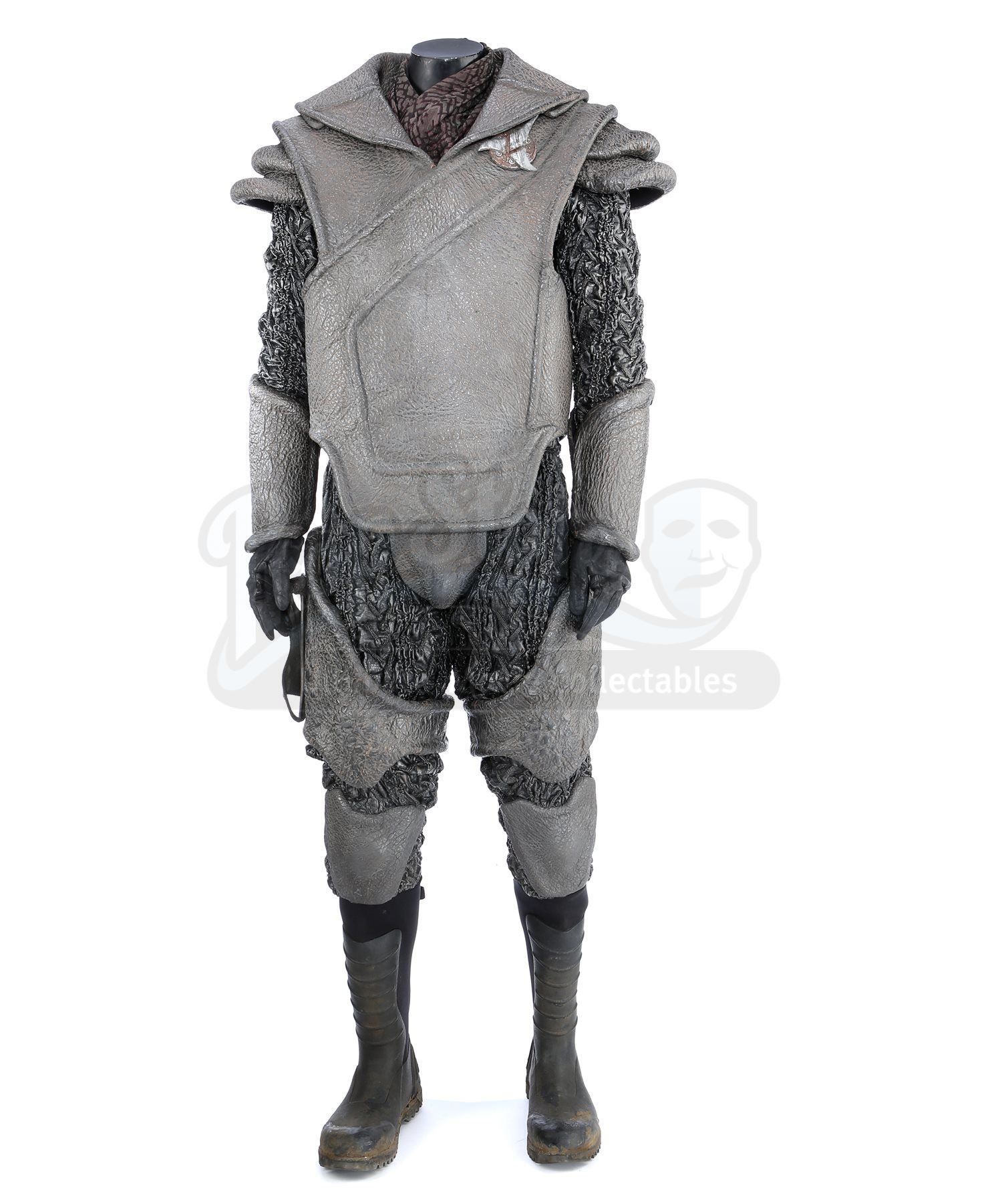 A Klingon guard uniform from Star Trek Into Darkness. Klingon guards wore their uniforms when Khan ambushed them and the Enterprise crew on Kronos. The costume consists of chest armor, shoulder guards with an elastic harness, a scarf, a long-sleeved shirt (extra large), two undershirts (extra large), a pair of gloves, arm bracers, two belts, a codpiece, pants (approximate size 35), thigh guards, kneepads and a pair of boots (marked U.S. size 14). The chest armor, shoulder guards, thigh guards, kneepads, arm bracers and codpiece are all made of foam and mimic elephant hide by incorporating faux leather made of china silk and terrycloth that features a scale design. The scarf is made of a synthetic material and lined with Spandex. The long-sleeved shirt consists of glossy, textured sleeves made of faux leather stitched to a black Spandex sport shirt. The pants are made of the same textured synthetic material and include black nylon suspenders. The undershirts consist of black Spandex sport shirts. The gloves are black leather and suede and the belt is made of black nylon. Also included is a pair of black neoprene and rubber boots that are distressed with dirt.The costume features hand-written wardrobe labels in the long-sleeved shirt, shoulder guards, scarf, one of the gloves, arm bracers, a belt, codpiece, pants, kneepads and thigh guards marked with the actor's name. The boots also have hand-written wardrobe labels marked with the name of another stunt actor. Also included are wardrobe tags with hand-written notes about the costume.Estimate: $2000 - 3000*Estimated sale price; sold without reserve.