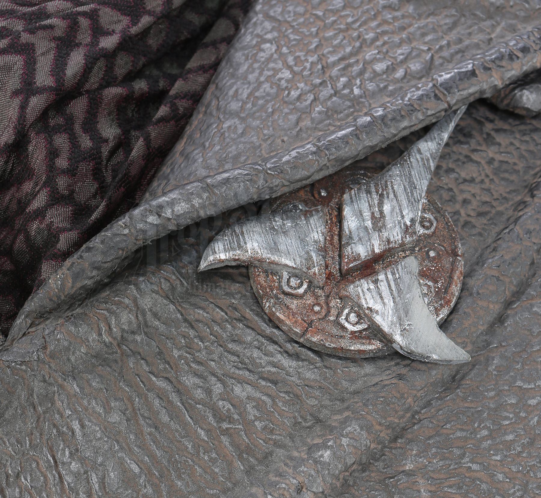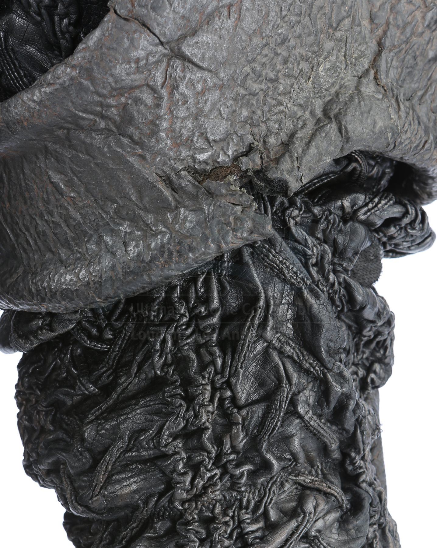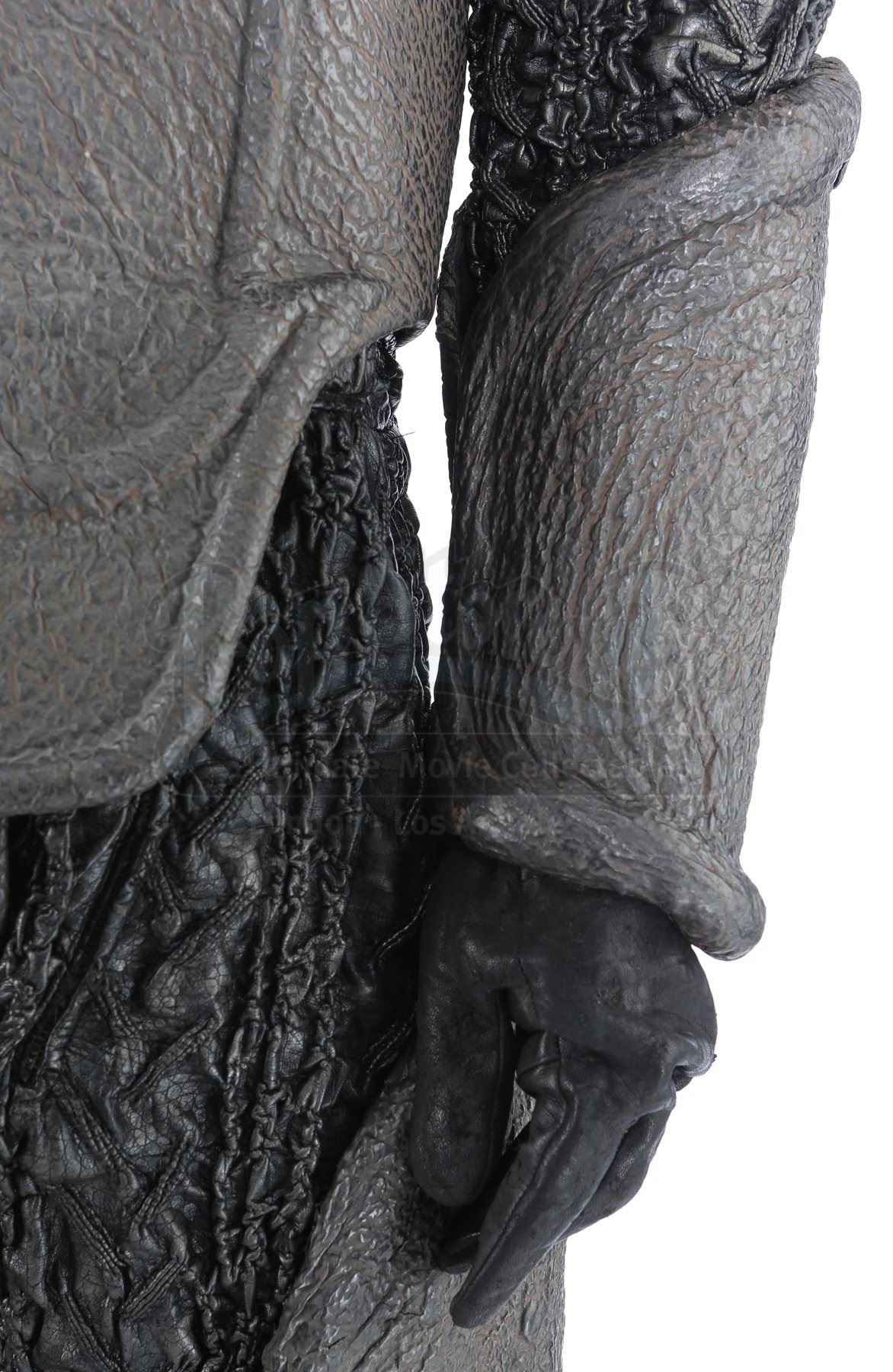 A Klingon guard uniform from Star Trek Into Darkness. Klingon guards wore their uniforms when Khan ambushed them and the Enterprise crew on Kronos. The costume consists of chest armor, shoulder guards with an elastic harness, a scarf, a long-sleeved shirt (extra large), two undershirts (extra large), a pair of gloves, arm bracers, two belts, a codpiece, pants (approximate size 35), thigh guards, kneepads and a pair of boots (marked U.S. size 14). The chest armor, shoulder guards, thigh guards, kneepads, arm bracers and codpiece are all made of foam and mimic elephant hide by incorporating faux leather made of china silk and terrycloth that features a scale design. The scarf is made of a synthetic material and lined with Spandex. The long-sleeved shirt consists of glossy, textured sleeves made of faux leather stitched to a black Spandex sport shirt. The pants are made of the same textured synthetic material and include black nylon suspenders. The undershirts consist of black Spandex sport shirts. The gloves are black leather and suede and the belt is made of black nylon. Also included is a pair of black neoprene and rubber boots that are distressed with dirt.The costume features hand-written wardrobe labels in the long-sleeved shirt, shoulder guards, scarf, one of the gloves, arm bracers, a belt, codpiece, pants, kneepads and thigh guards marked with the actor's name. The boots also have hand-written wardrobe labels marked with the name of another stunt actor. Also included are wardrobe tags with hand-written notes about the costume.Estimate: $2000 - 3000*Estimated sale price; sold without reserve.