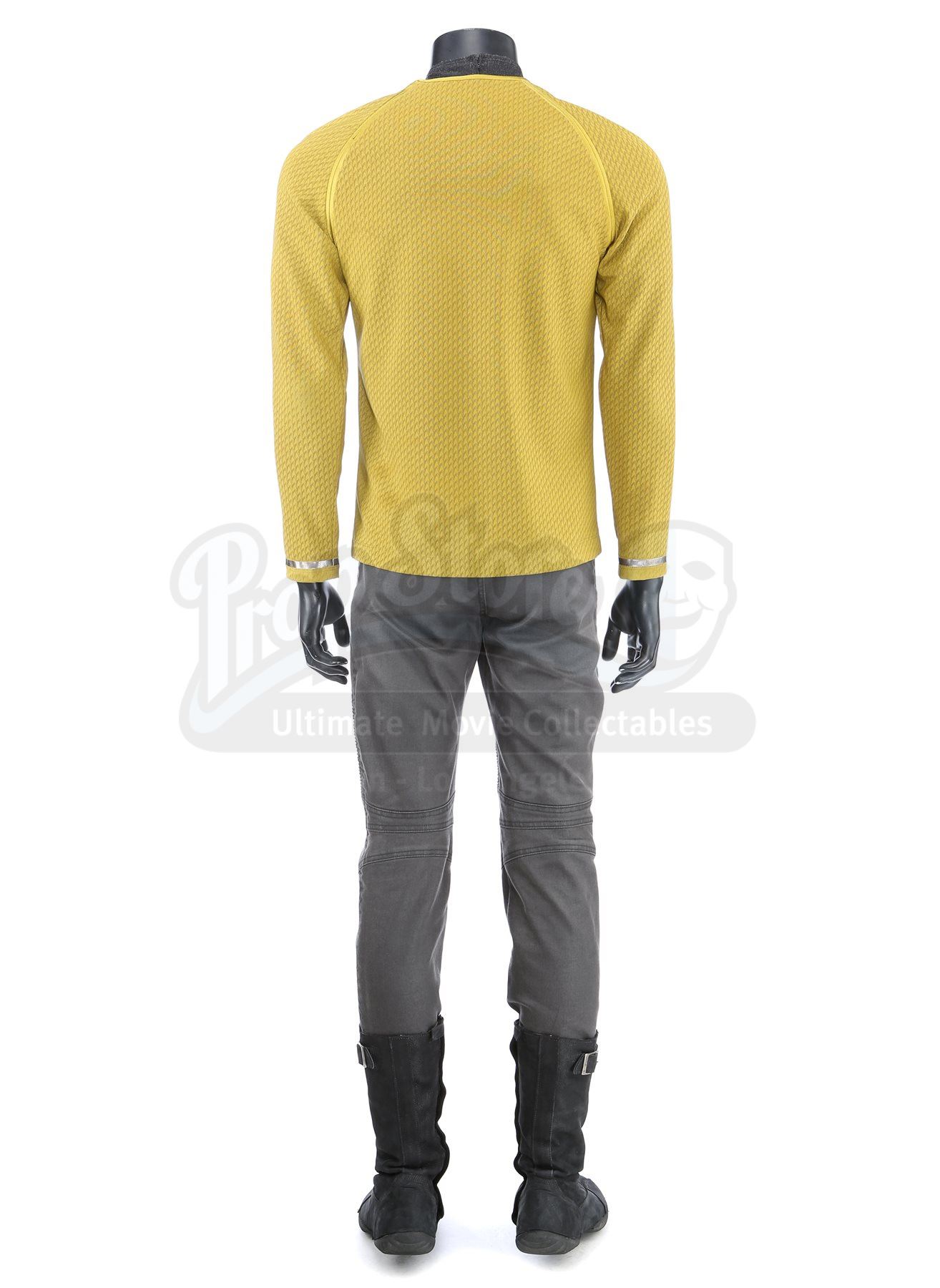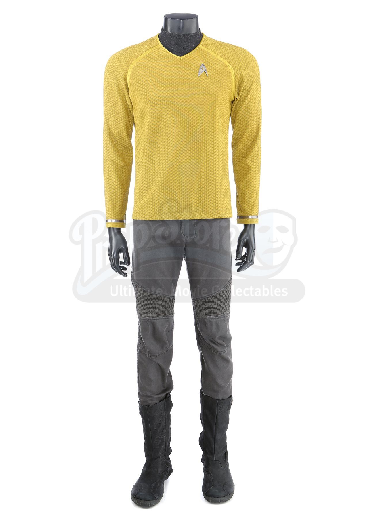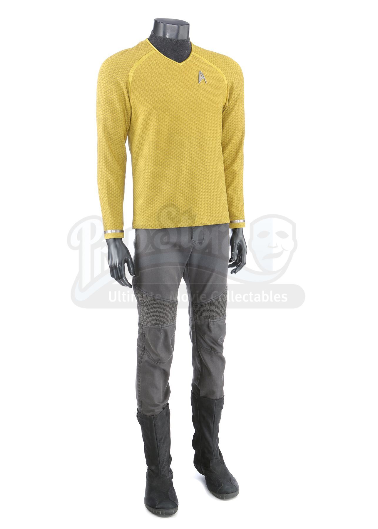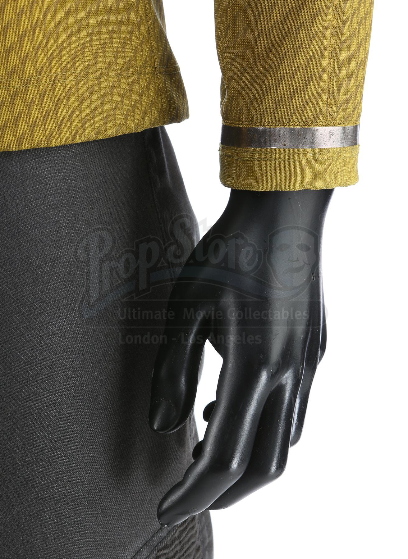 Lieutenant Sulu's Enterprise command uniform from Star Trek Into Darkness. Lieutenant Sulu wore his Enterprise command uniform while aboard the Enterprise. The uniform consists of a tunic (approximate size medium), undershirt (medium), pants (approximate size 30), and a pair of boots (marked U.S. size 9). Made specifically for the sequel, the gold tunic is made of Spandex and features a printed optical repeat Starfleet insignia pattern. The long-sleeved shirt has piping around the collar, a hidden zipper at the left shoulder, one silver band on the wrists, and a metal Starfleet command insignia (made for the sequel) on the left breast. The undershirt consists of a grey polyester collar that is stitched to the top of a sleeveless black Spandex sport shirt. The grey twill pants were made specifically for the sequel and have ribbed fabric diagonally above the knees. Also included is a pair of black suede boots with rubber soles. The boots and insignia are the proper type for the costume; they were used in the production but not specifically by this character.The costume features hand-written wardrobe labels with the tunic, undershirt, and pants all marked as "Sulu" and the boots marked with the name of the stunt actor. Also included are wardrobe tags with hand-written notes about the costume. Estimate: $3000 - 5000*Estimated sale price; sold without reserve.