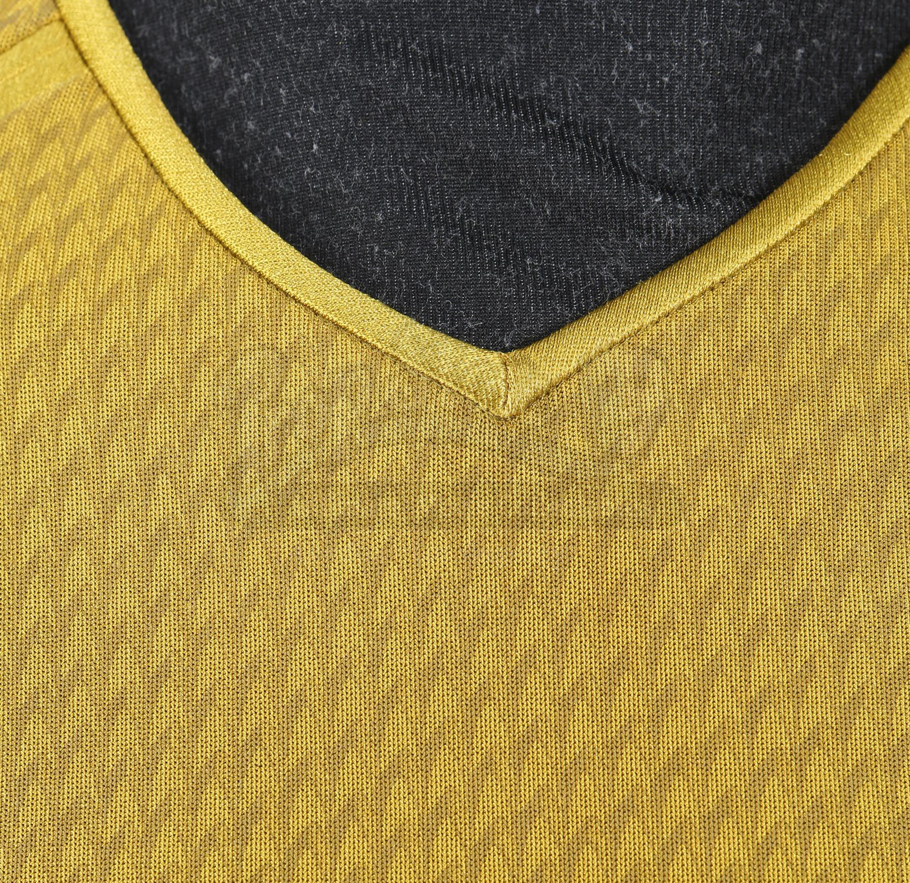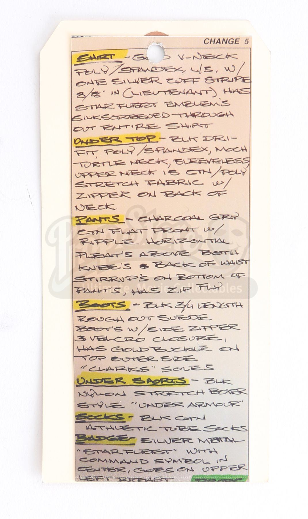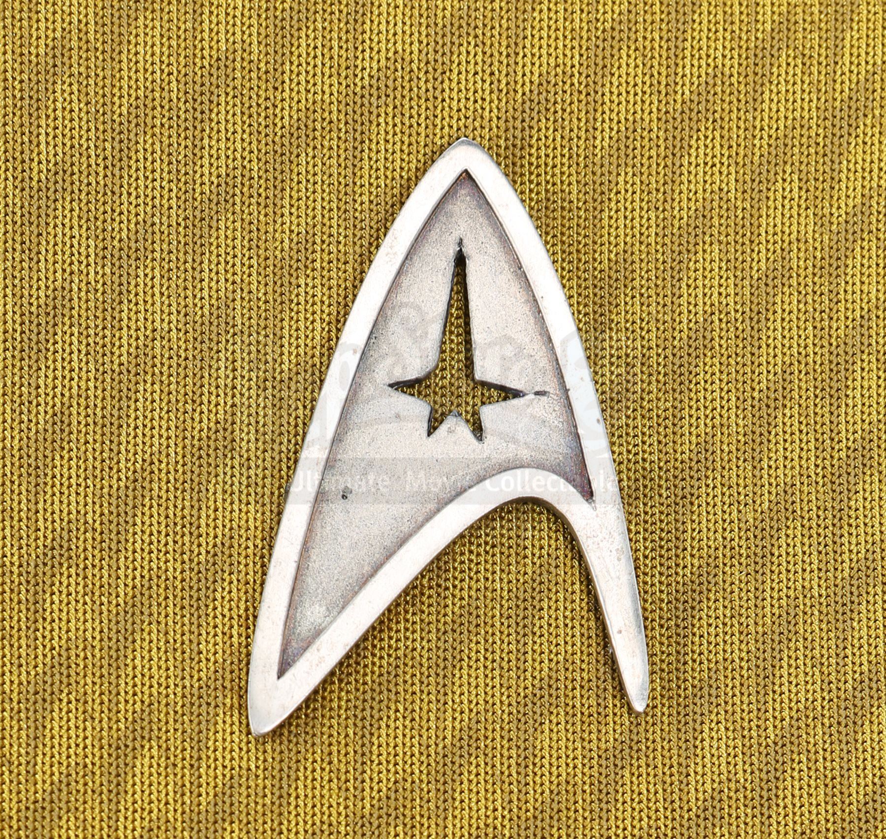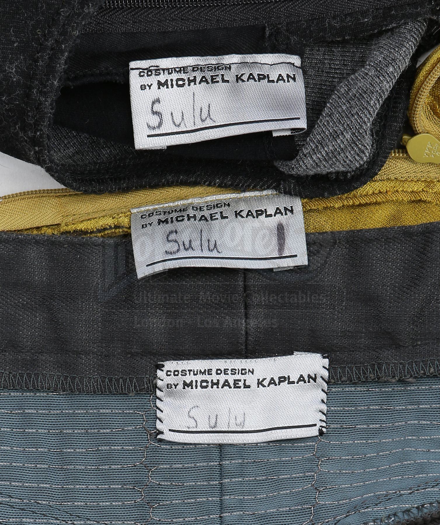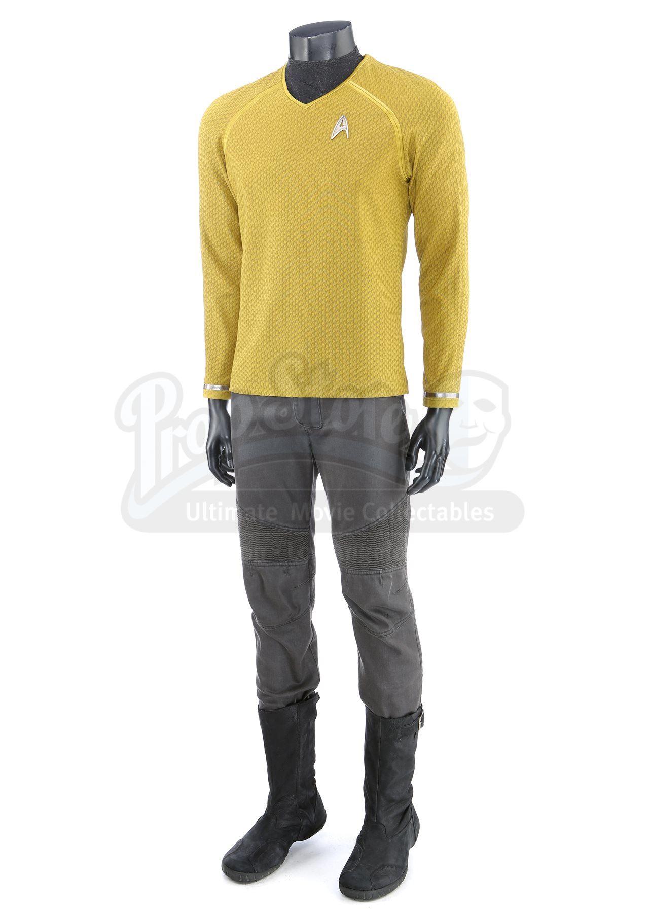 Lieutenant Sulu's Enterprise command uniform from Star Trek Into Darkness. Lieutenant Sulu wore his Enterprise command uniform while aboard the Enterprise. The uniform consists of a tunic (approximate size medium), undershirt (medium), pants (approximate size 30), and a pair of boots (marked U.S. size 9). Made specifically for the sequel, the gold tunic is made of Spandex and features a printed optical repeat Starfleet insignia pattern. The long-sleeved shirt has piping around the collar, a hidden zipper at the left shoulder, one silver band on the wrists, and a metal Starfleet command insignia (made for the sequel) on the left breast. The undershirt consists of a grey polyester collar that is stitched to the top of a sleeveless black Spandex sport shirt. The grey twill pants were made specifically for the sequel and have ribbed fabric diagonally above the knees. Also included is a pair of black suede boots with rubber soles. The boots and insignia are the proper type for the costume; they were used in the production but not specifically by this character.The costume features hand-written wardrobe labels with the tunic, undershirt, and pants all marked as "Sulu" and the boots marked with the name of the stunt actor. Also included are wardrobe tags with hand-written notes about the costume. Estimate: $3000 - 5000*Estimated sale price; sold without reserve.