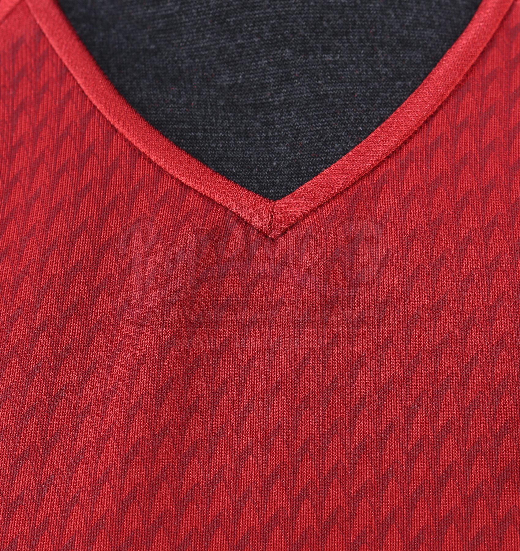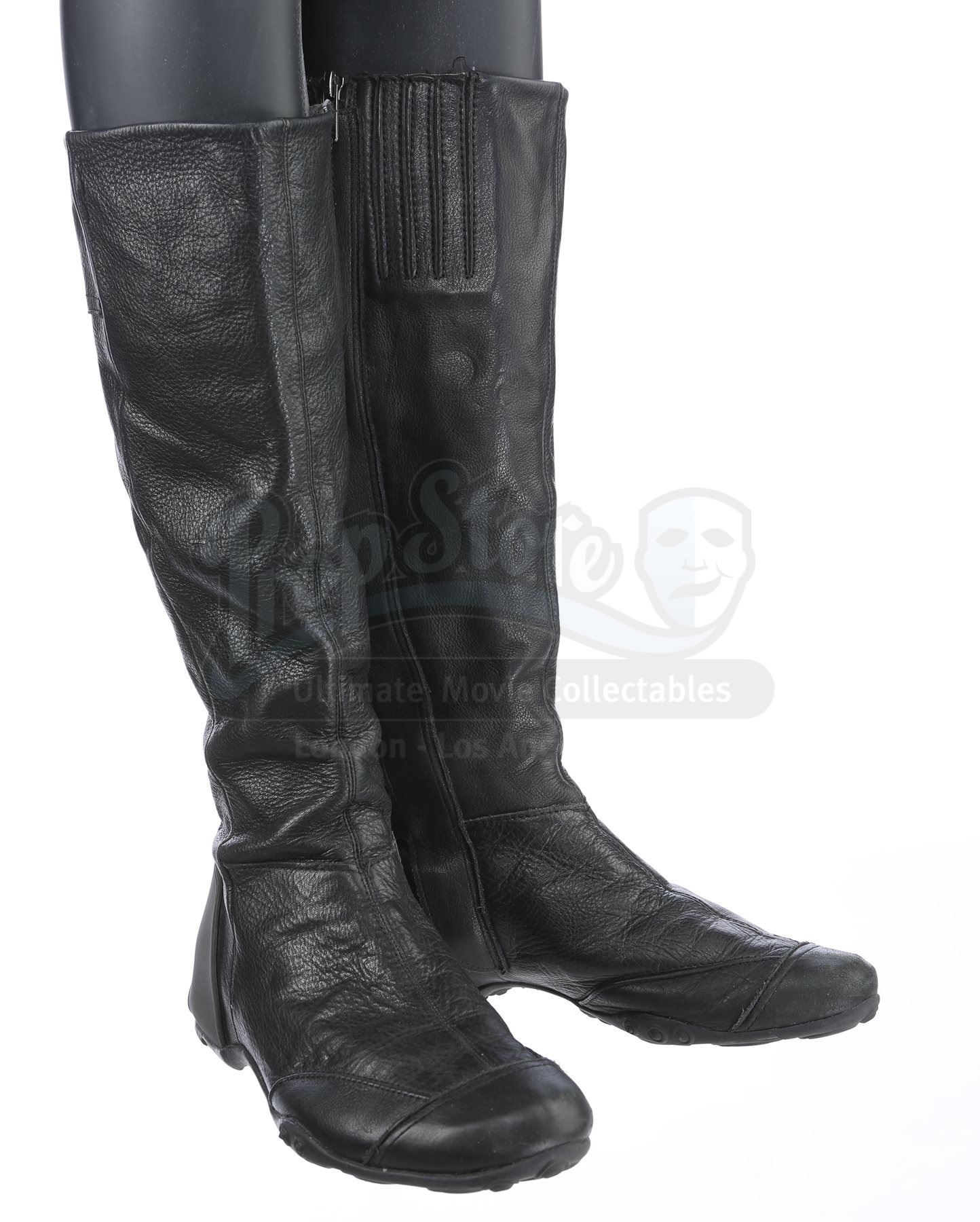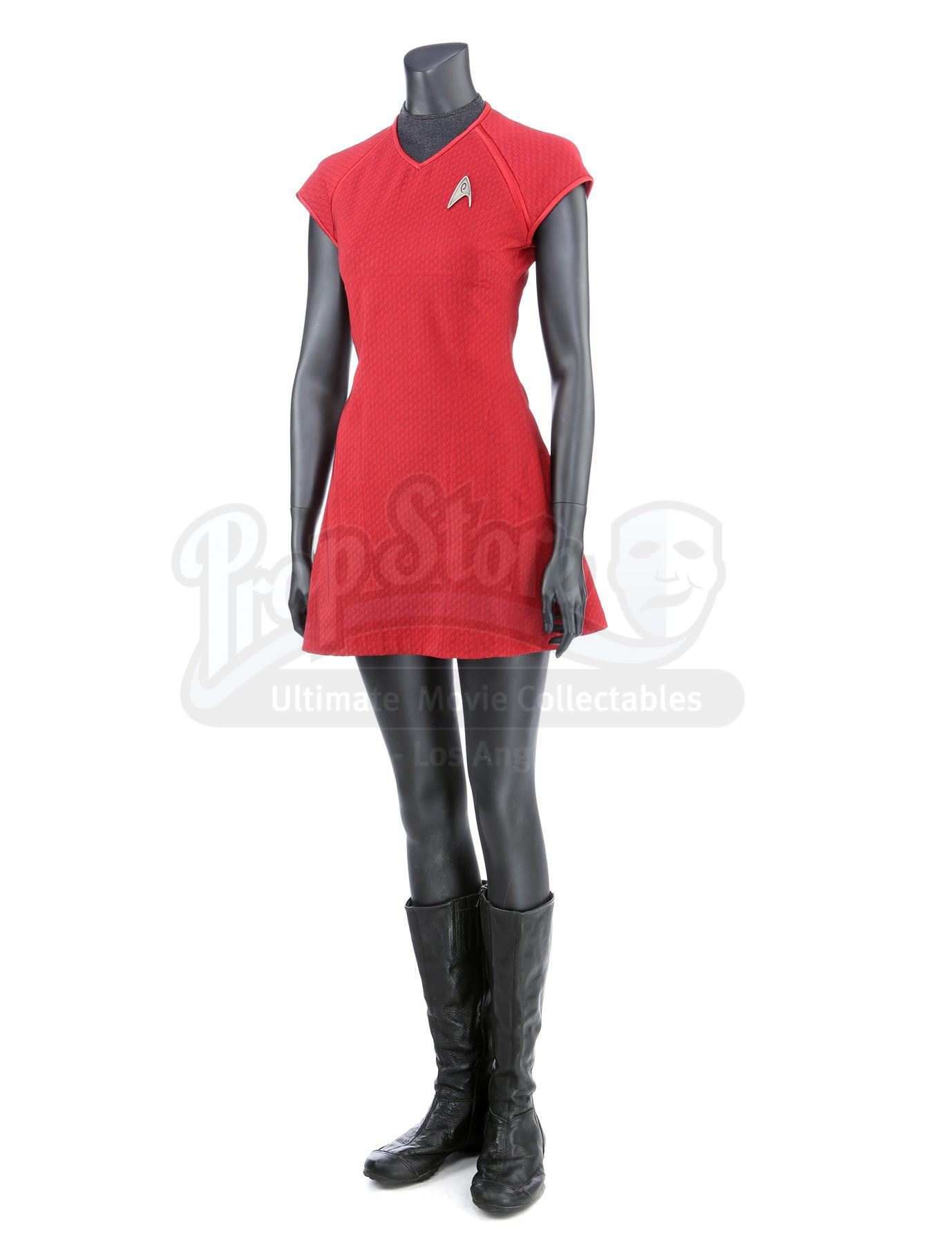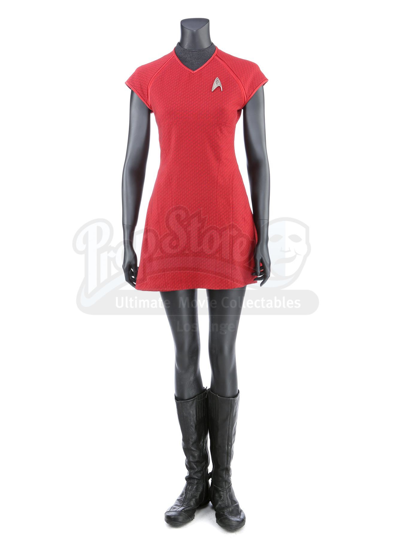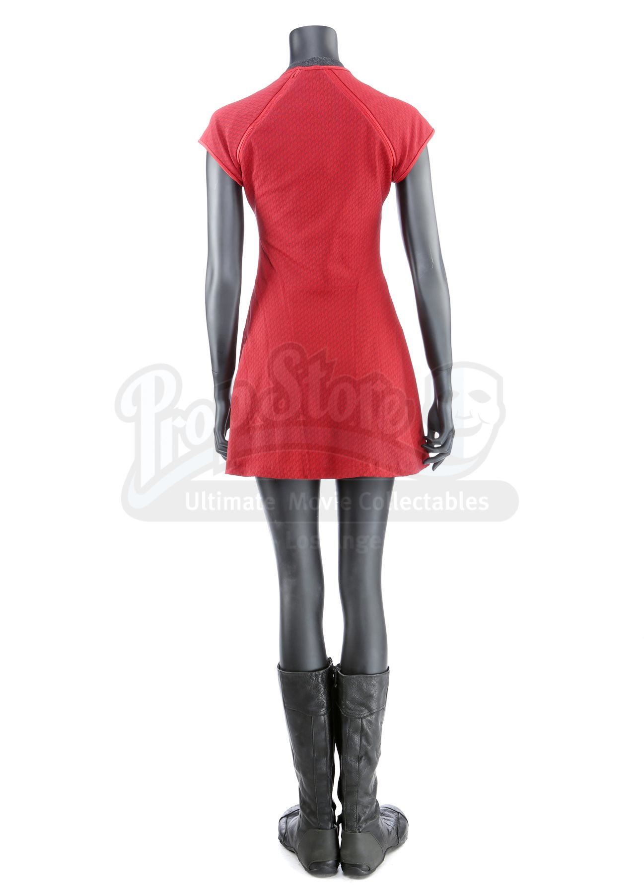 Lieutenant Uhura's Enterprise operations uniform from Star Trek Into Darkness. Uhura wore her operations uniform while aboard the Enterprise. The costume consists of a dress (approximate size extra small), an undershirt (approximate size extra small) and a pair of boots (marked size 7.5). Made specifically for the sequel, the red dress is made of Spandex and features a printed optical repeat Starfleet insignia pattern. The dress has piping around the collar, a hidden zipper at the left shoulder and features a metal Starfleet operations insignia on the left breast. The undershirt consists of a black polyester turtleneck leotard. Also included is a pair of Uhura's black leather boots with rubber soles. The insignia is the proper type for the costume, it was used in the production but not specifically by this character. The costume features hand-written wardrobe labels in the dress and undershirt both marked "Uhura". Also included is a wardrobe tag with hand-written notes about the costume.Estimate: $4000 - 6000*Estimated sale price; sold without reserve.