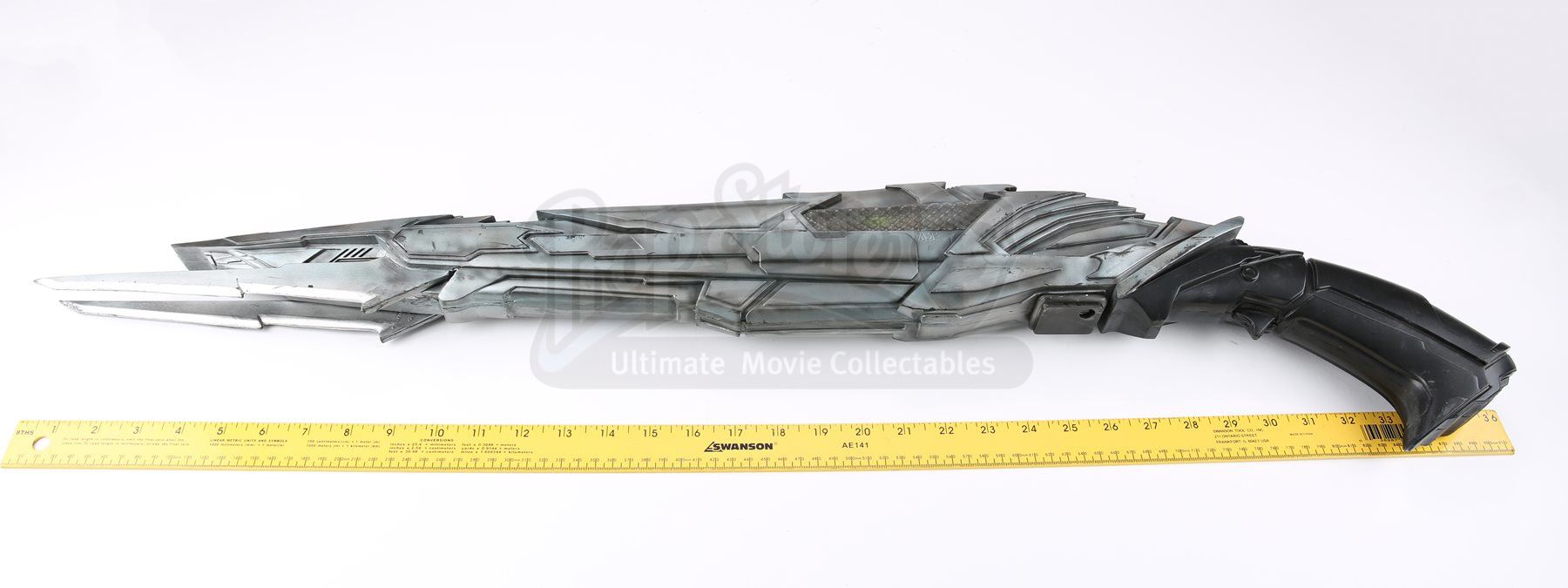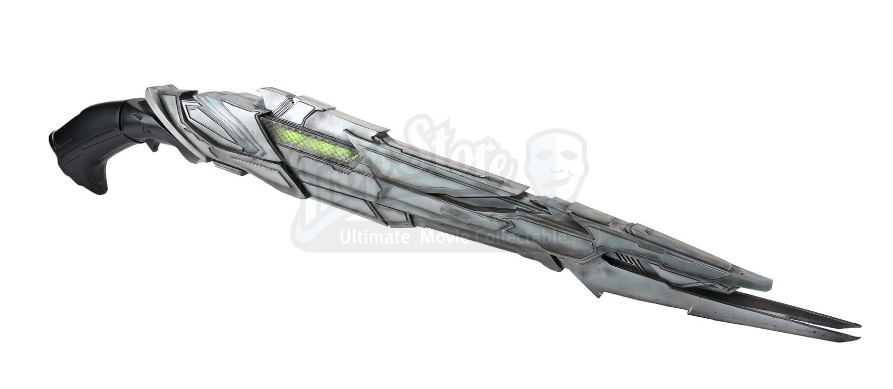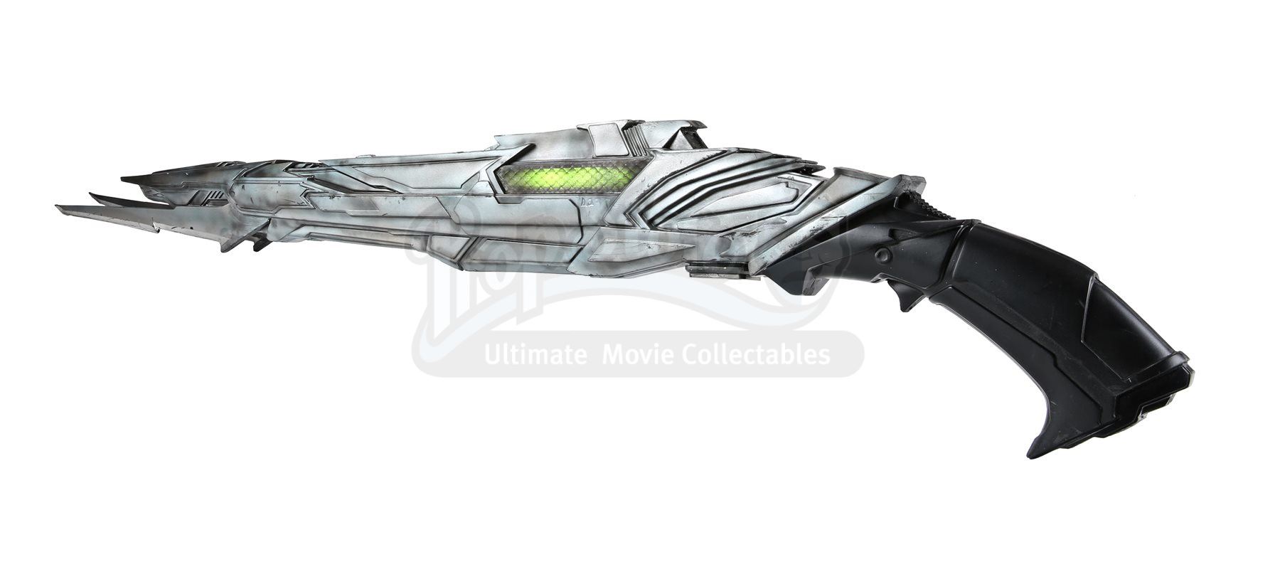 Painted in shades of metallic silver, the disruptor is made of foam urethane over an aluminum support rod and displays an intricate angular construction. The disruptor is outfitted with two rubber blades that are attached beneath the barrel. The prop includes green LED light panels on the sides of the body that illuminate with the push of a button. Dimensions: 36" x 2 ¾" x 6 ¼" (91 cm x 7 cm x 16 cm)