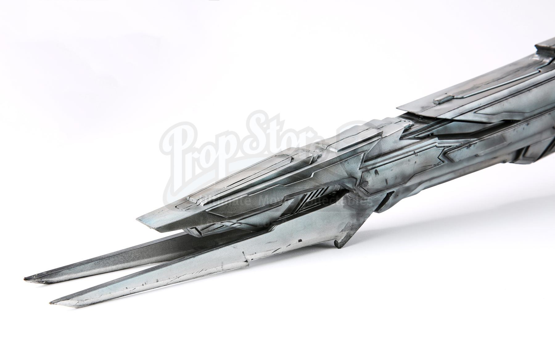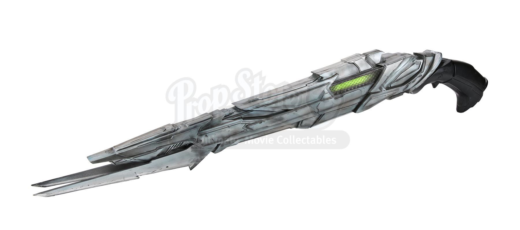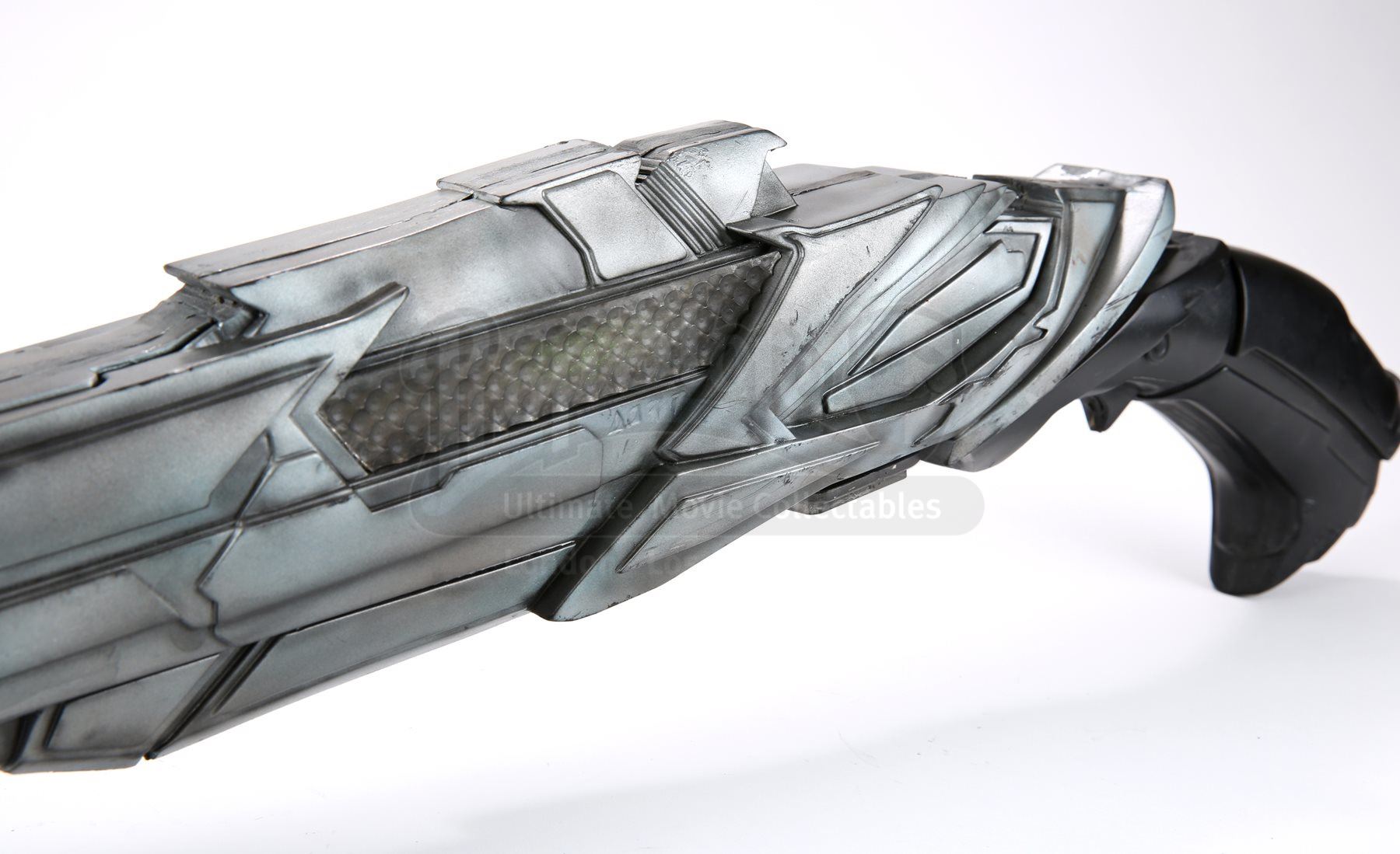 Painted in shades of metallic silver, the disruptor is made of foam urethane over an aluminum support rod and displays an intricate angular construction. The disruptor is outfitted with two rubber blades that are attached beneath the barrel. The prop includes green LED light panels on the sides of the body that illuminate with the push of a button. Dimensions: 36" x 2 ¾" x 6 ¼" (91 cm x 7 cm x 16 cm)