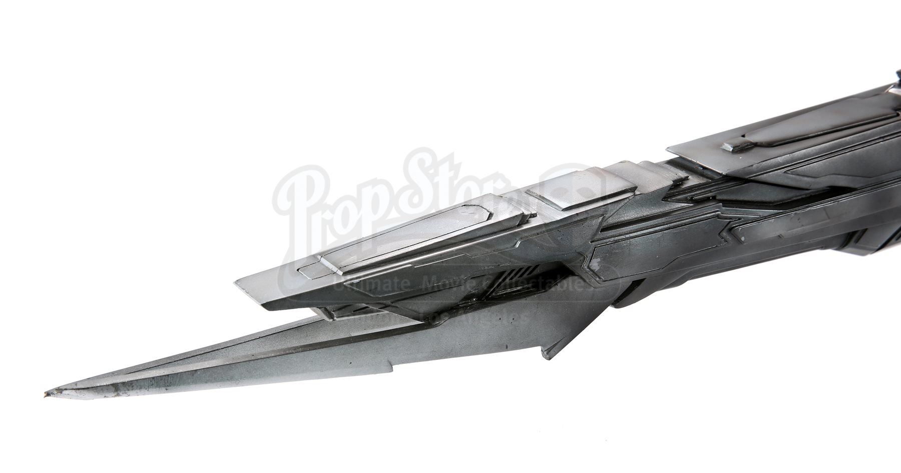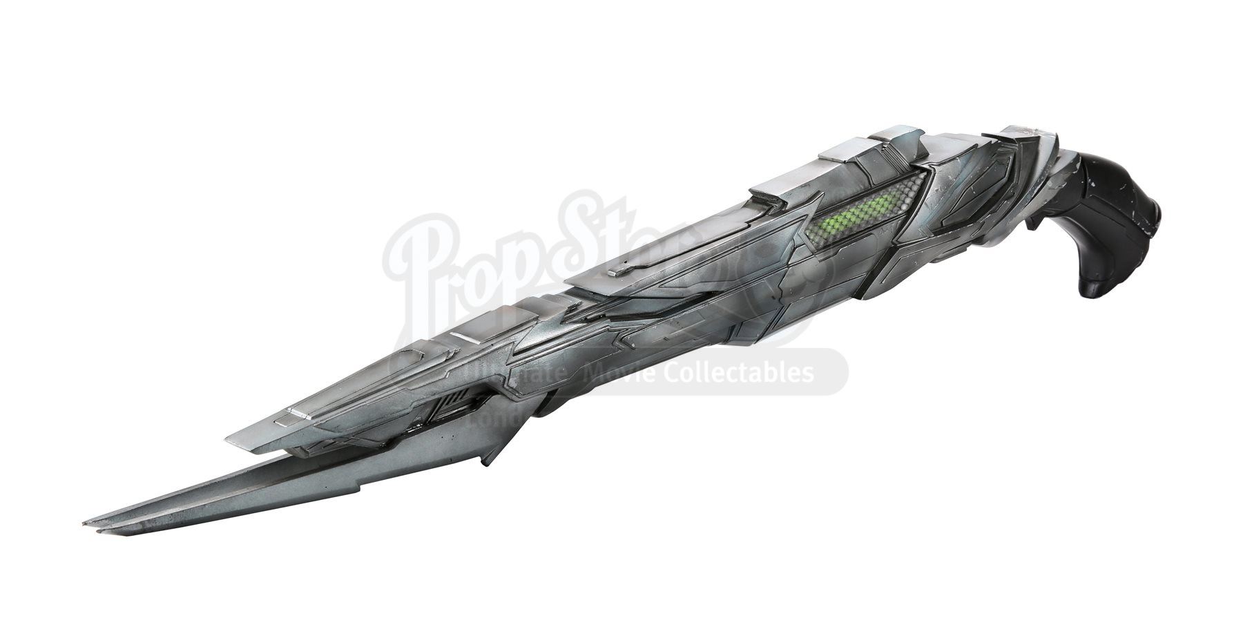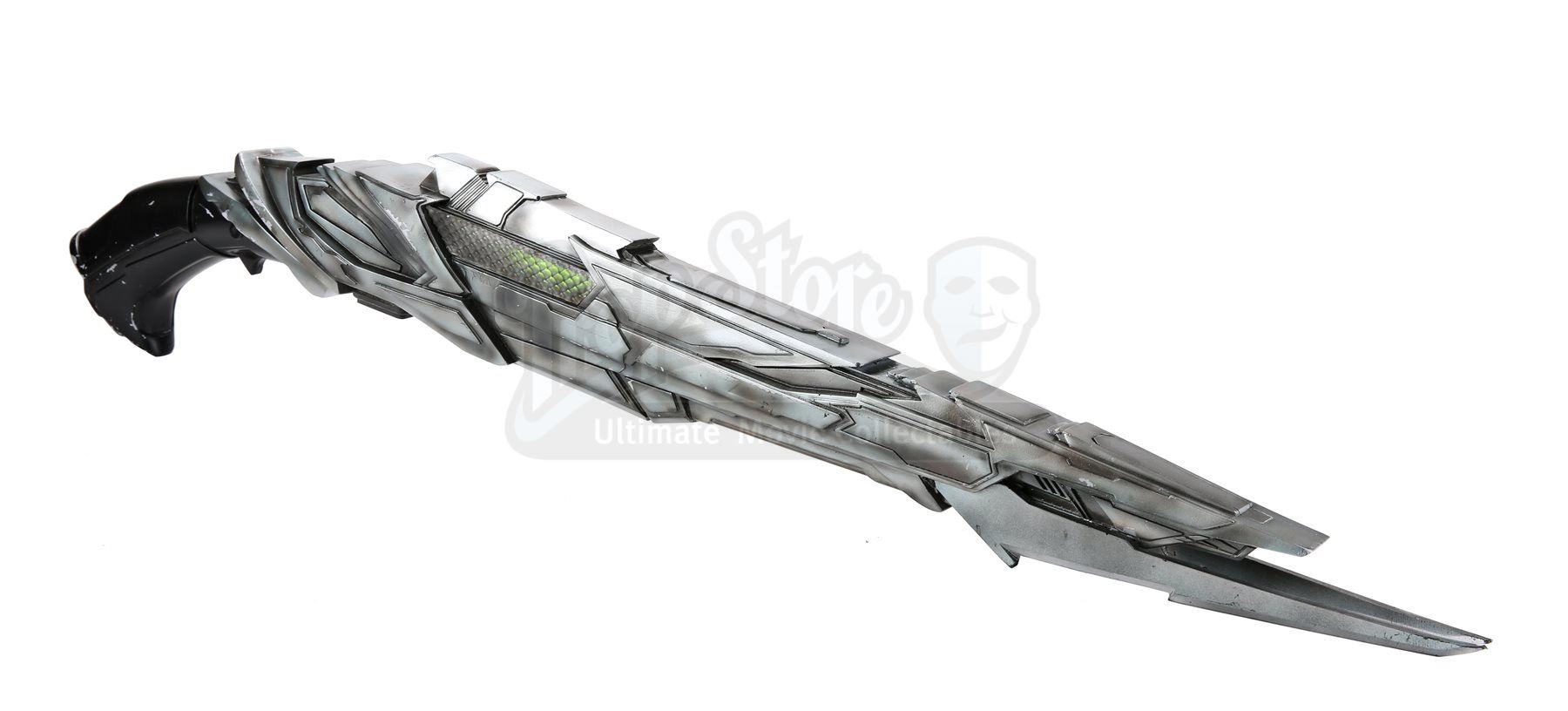 Painted in shades of metallic silver, the disruptor is made of resin and displays an intricate angular construction. The full-length disruptor is outfitted with two rubber blades that are attached beneath the barrel. The prop includes green LED light panels on the sides of the body that illuminate with the push of a button. Dimensions: 36" x 2 ¾" x 6 ½" (91 cm x 7 cm x 16.5 cm)