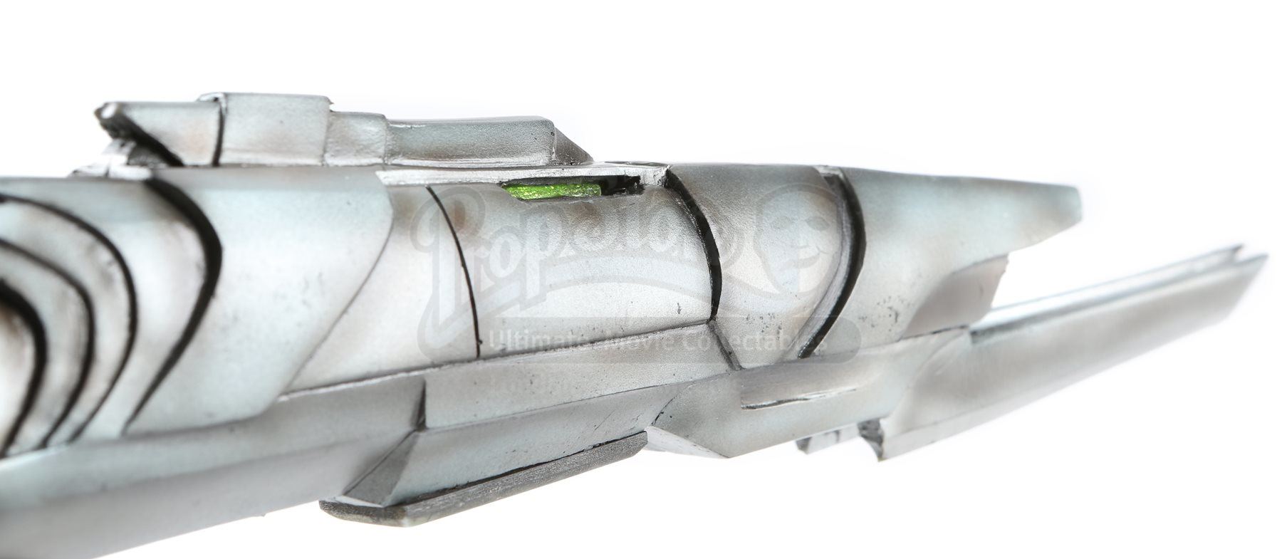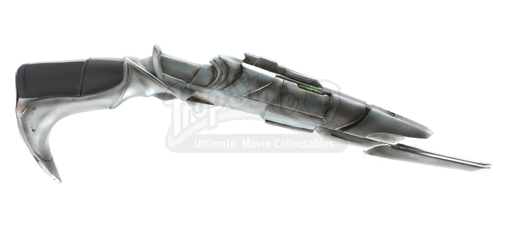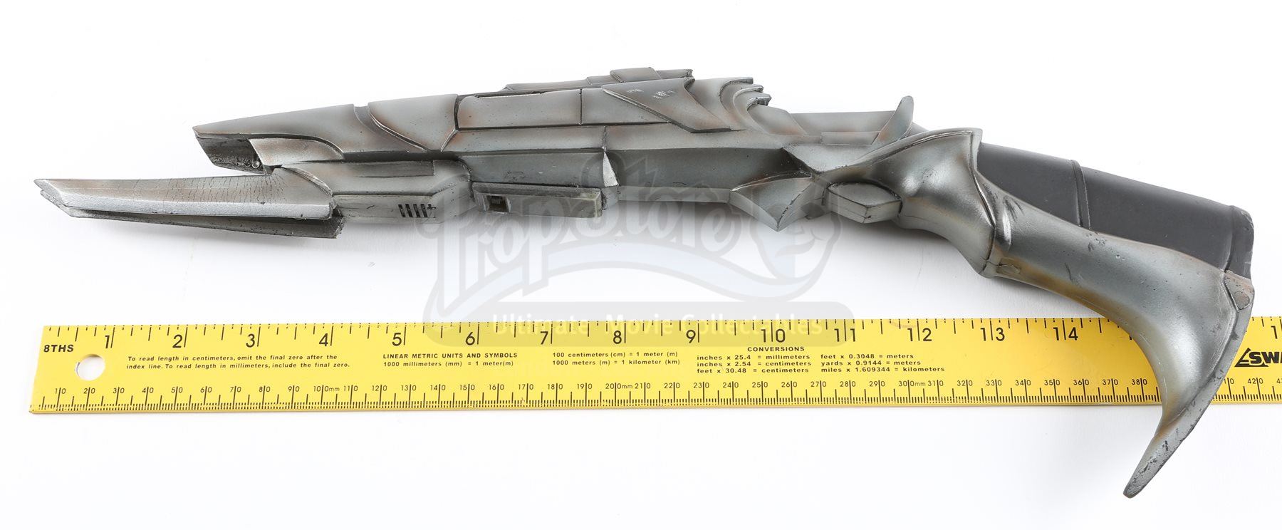 A light-up Klingon disruptor from Star Trek Into Darkness. The Klingons used their disruptors against Khan when they were ambushed on Kronos. Made of foam urethane over an aluminium support rod, the prop is painted in shades of metallic silver, includes an angular construction and features two rubber blades that are attached beneath the barrel. The disruptor also includes green LED light panels on the sides of the body with the push of a switch. Dimensions: 16" x 1 ½" x 5 ½" (41 cm x 4 cm x 14 cm) As this item contains electronic components, every effort has been made to describe them accurately; however, no guarantee or warranty is made as to functionality, lifespan or safety of those components. It is entirely incumbent on the new owner to satisfy themselves as to their safe use and maintenance.Estimate: $1500 - 2500*Estimated sale price; sold without reserve.