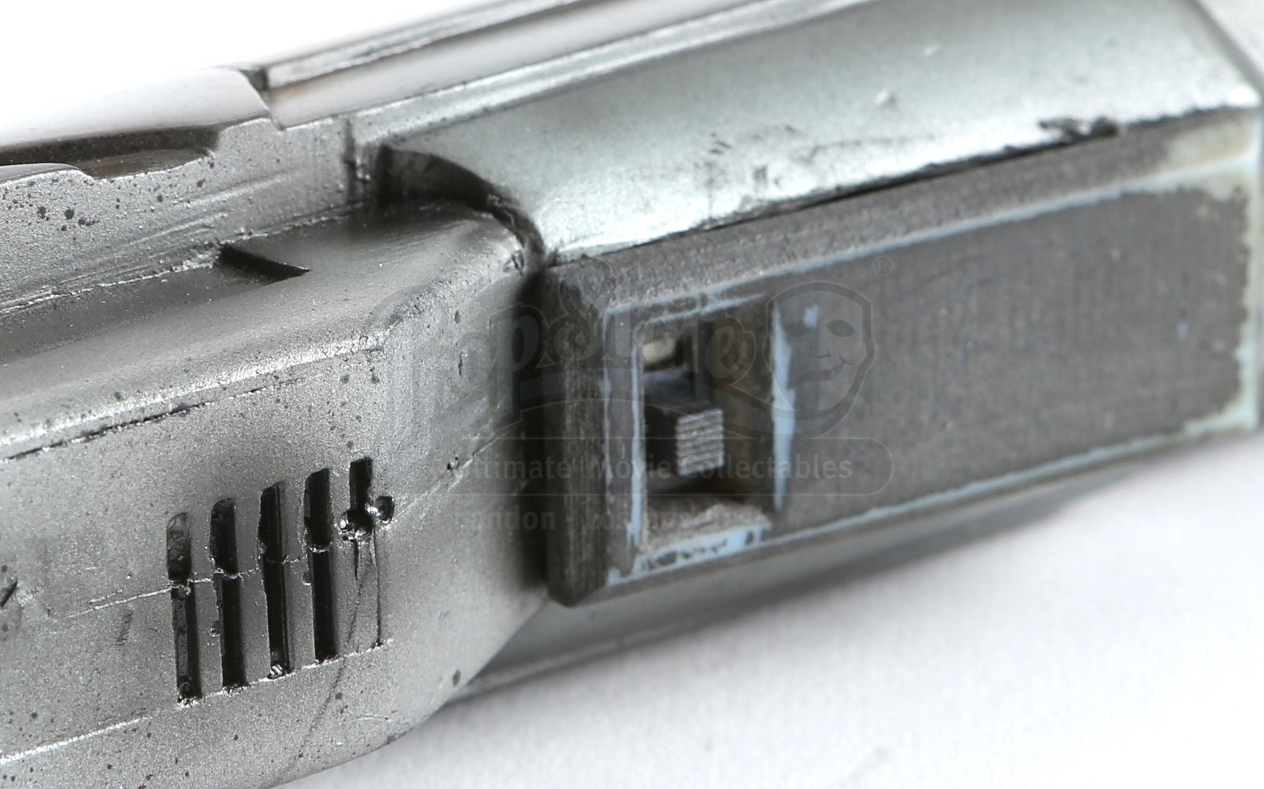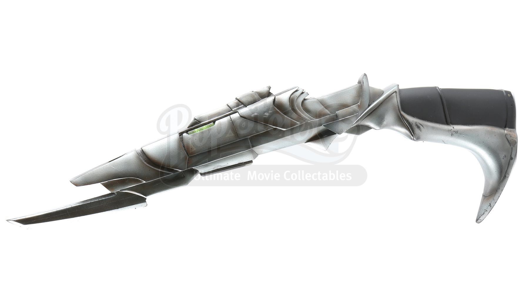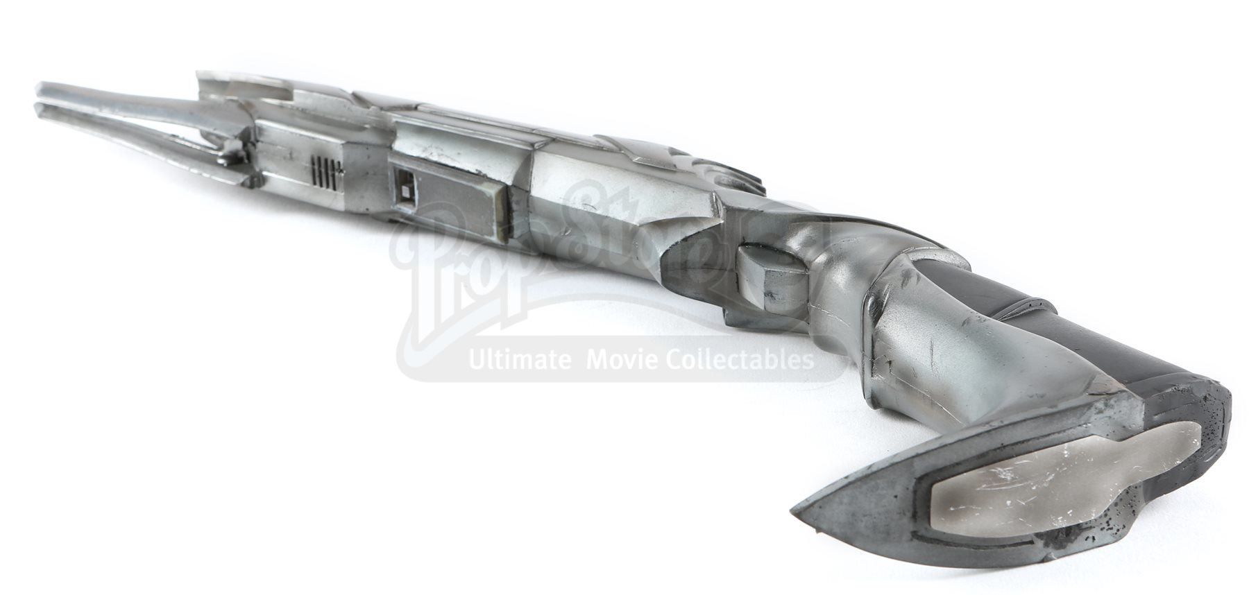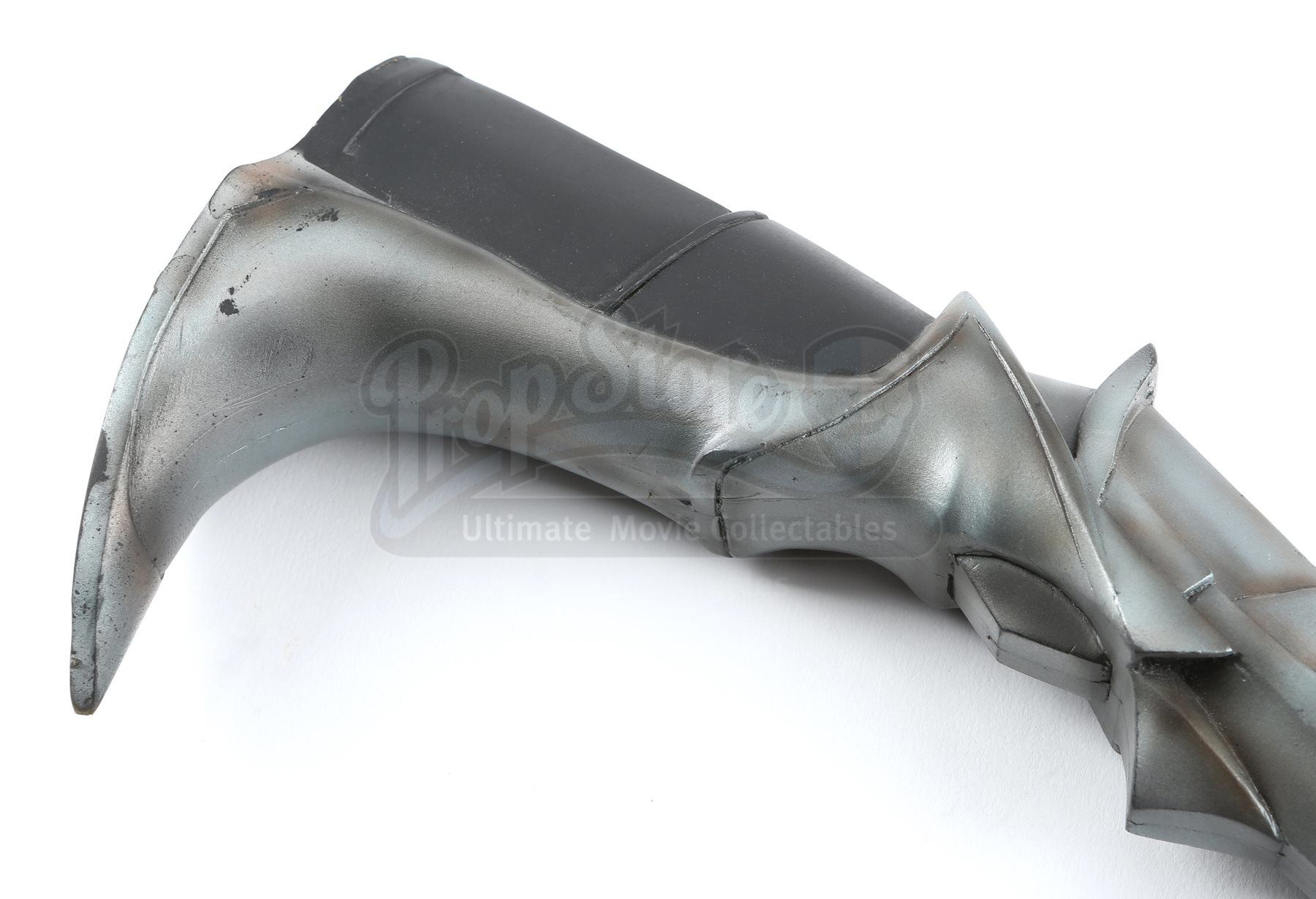 A light-up Klingon disruptor from Star Trek Into Darkness. The Klingons used their disruptors against Khan when they were ambushed on Kronos. Made of foam urethane over an aluminium support rod, the prop is painted in shades of metallic silver, includes an angular construction and features two rubber blades that are attached beneath the barrel. The disruptor also includes green LED light panels on the sides of the body with the push of a switch. Dimensions: 16" x 1 ½" x 5 ½" (41 cm x 4 cm x 14 cm) As this item contains electronic components, every effort has been made to describe them accurately; however, no guarantee or warranty is made as to functionality, lifespan or safety of those components. It is entirely incumbent on the new owner to satisfy themselves as to their safe use and maintenance.Estimate: $1500 - 2500*Estimated sale price; sold without reserve.