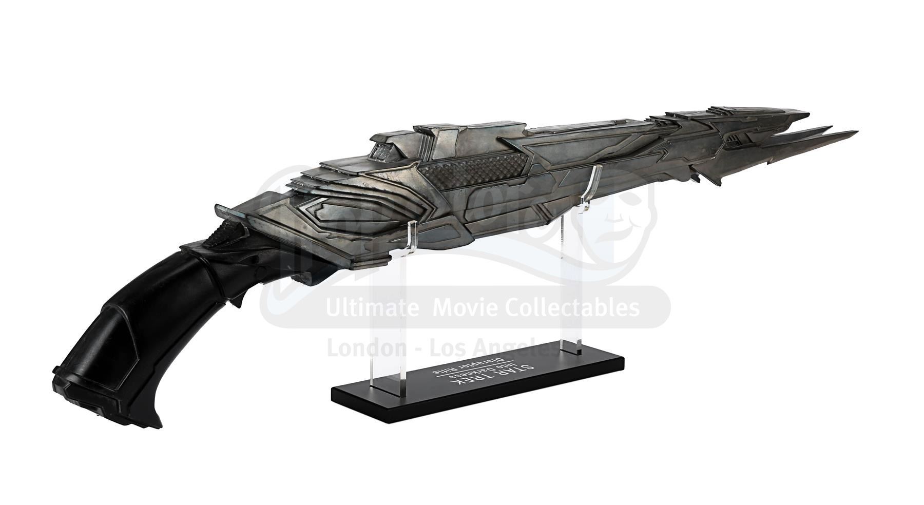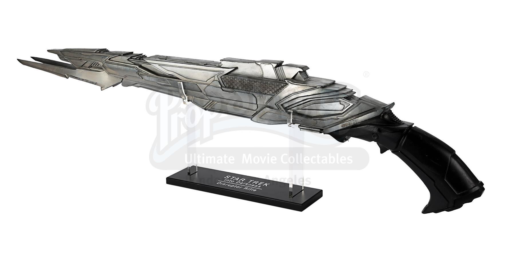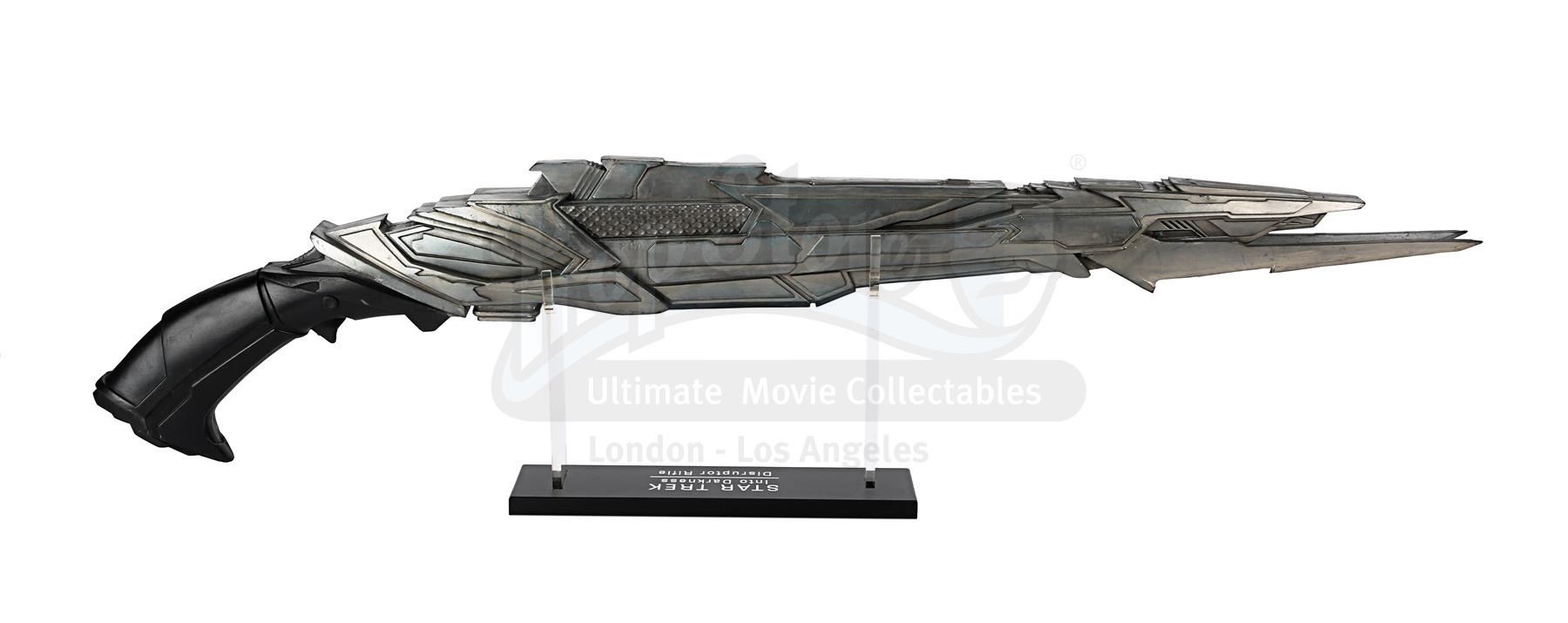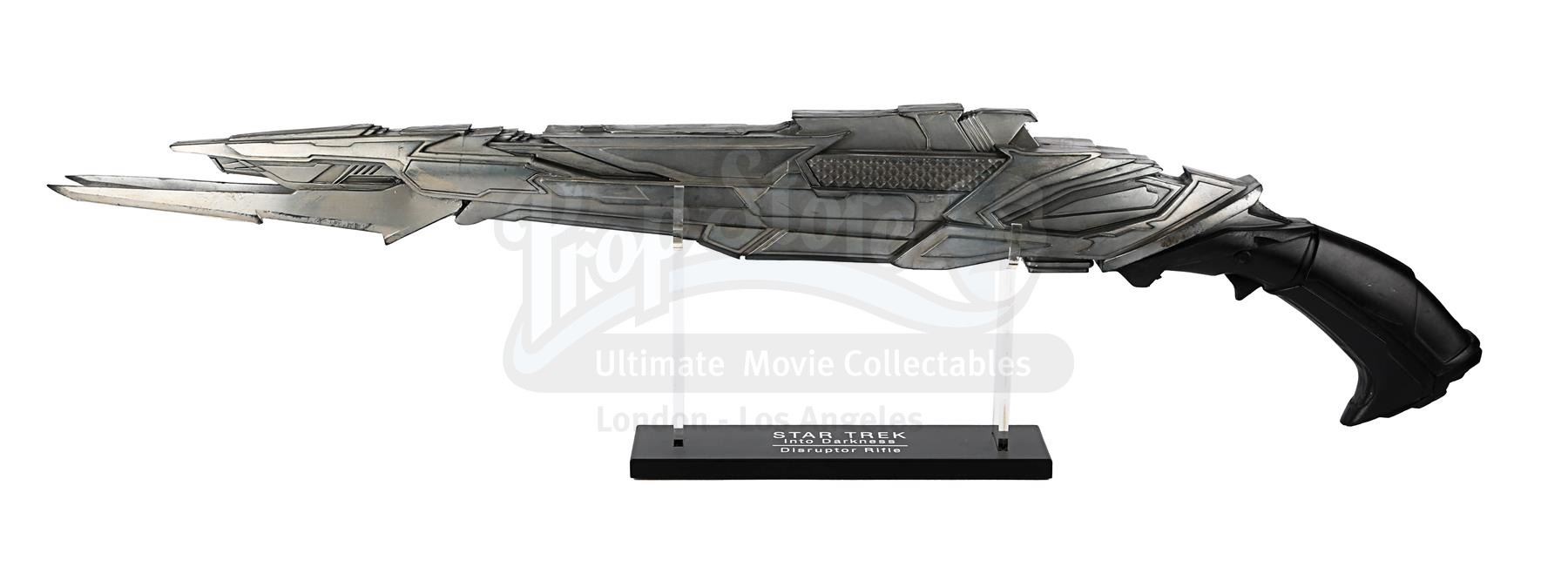 A light-up stunt Klingon disruptor rifle from J.J. Abrams' sci-fi sequel Star Trek Into Darkness. Disruptor rifles were used by the Klingons during the battle on Kronos with Kirk (Chris Pine), Spock (Zachary Quinto), Uhura (Zoë Saldana) and John Harrison (Benedict Cumberbatch). During the battle Spock picked up one of the rifles and started firing it.
