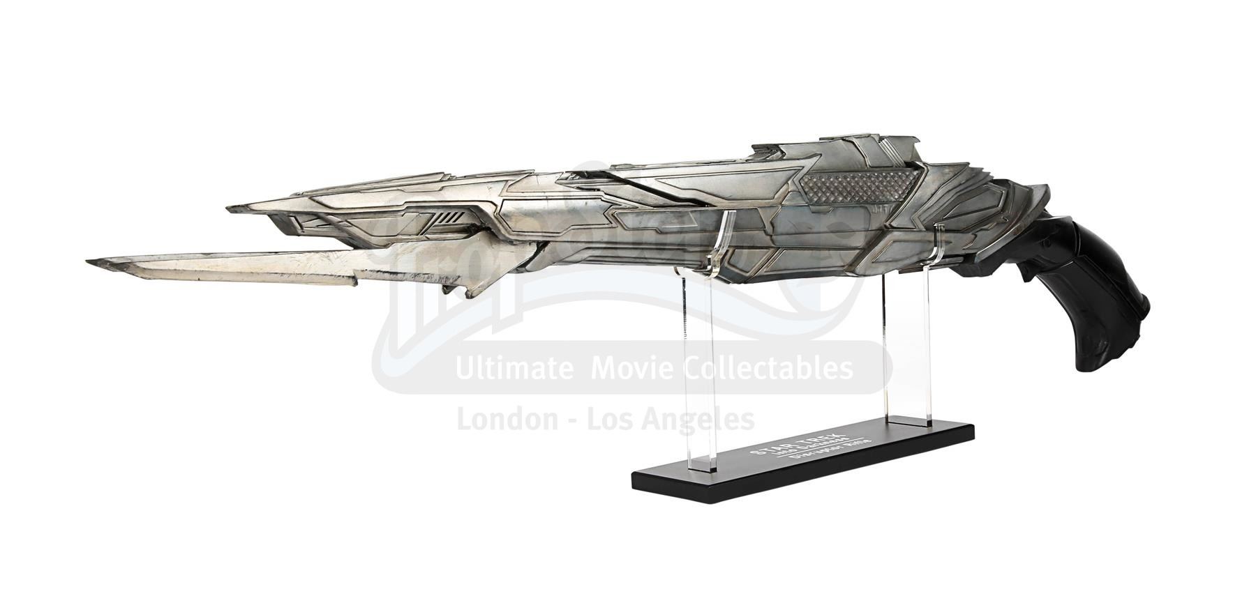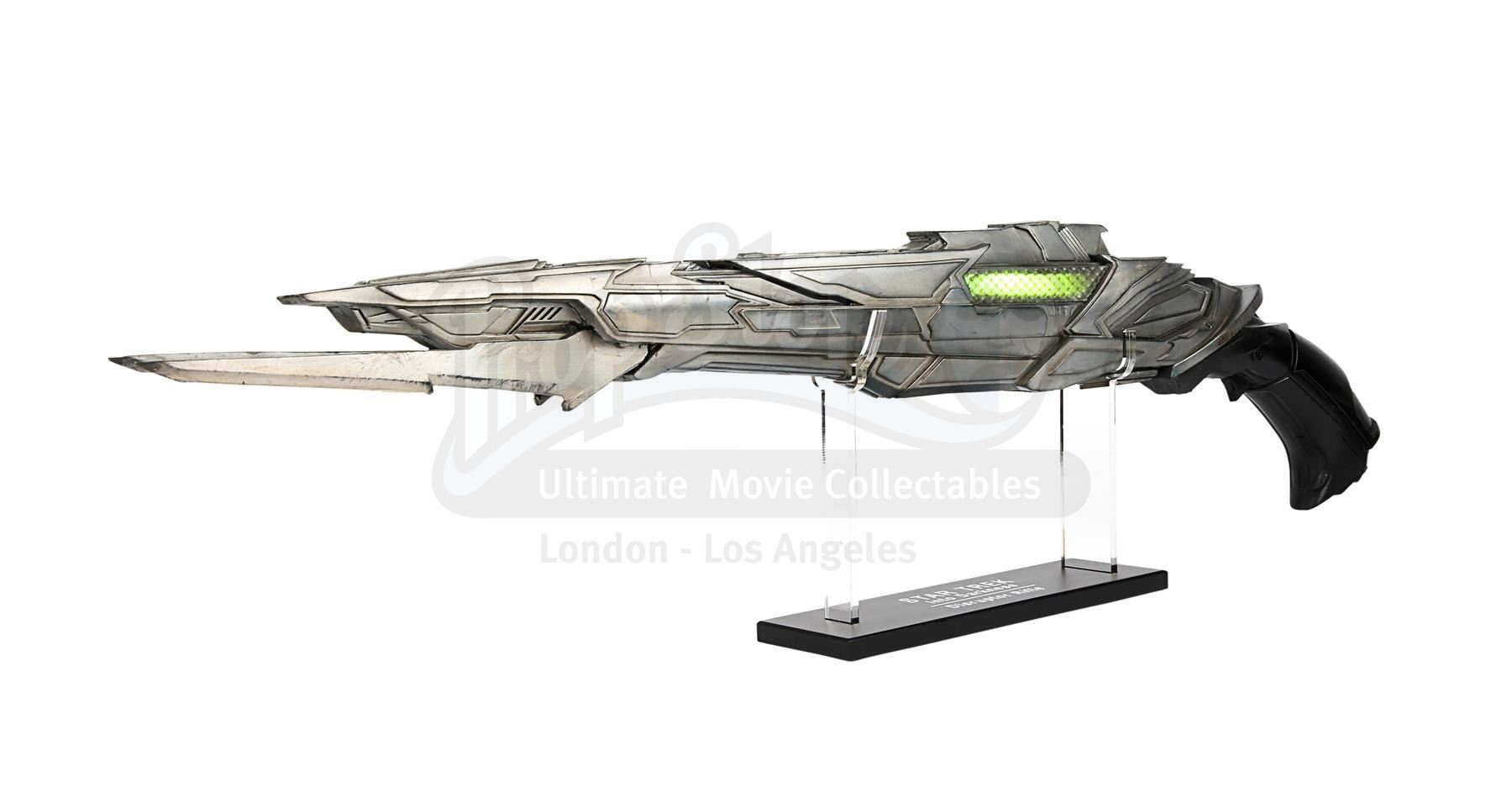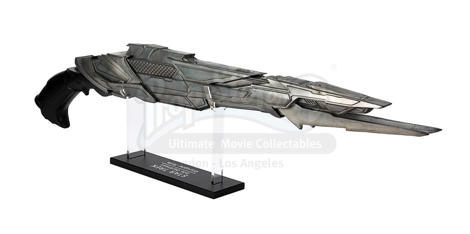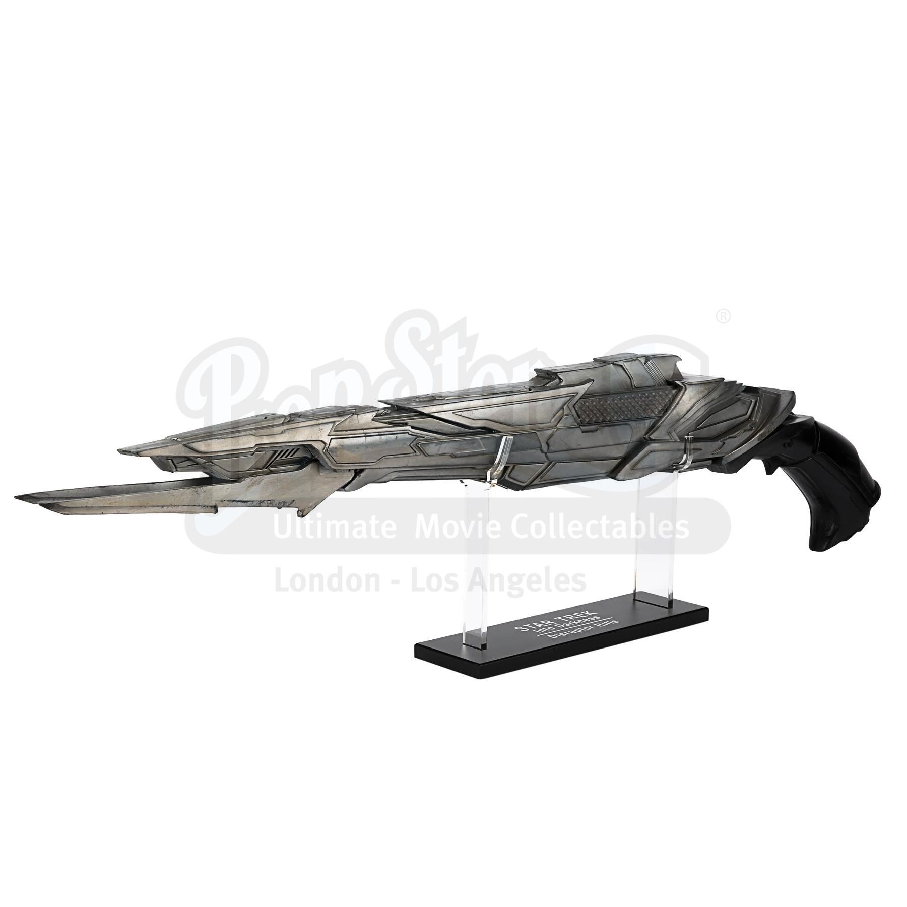 A light-up stunt Klingon disruptor rifle from J.J. Abrams' sci-fi sequel Star Trek Into Darkness. Disruptor rifles were used by the Klingons during the battle on Kronos with Kirk (Chris Pine), Spock (Zachary Quinto), Uhura (Zoë Saldana) and John Harrison (Benedict Cumberbatch). During the battle Spock picked up one of the rifles and started firing it.