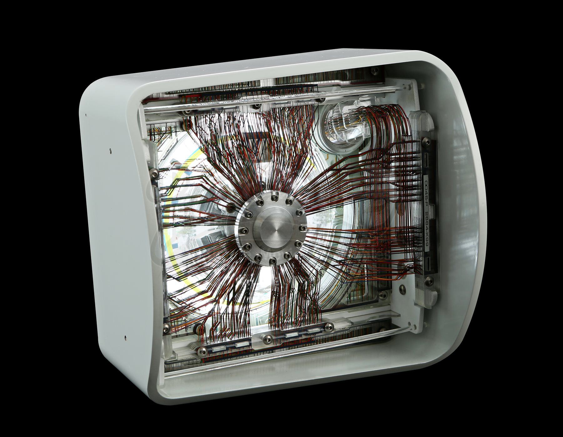 The prop consists of a plastic casing outfitted with a grid of complex multi-colored wiring. The wires join at the center of the device where they lock in place under a steel wheel. The prop is outfitted with modified AC adaptor which leads inside the device to power the interior lights. Dimensions: 7 ¼" x 7 ¾" x 5 ¾" (18 cm x 18 cm x 15 cm)