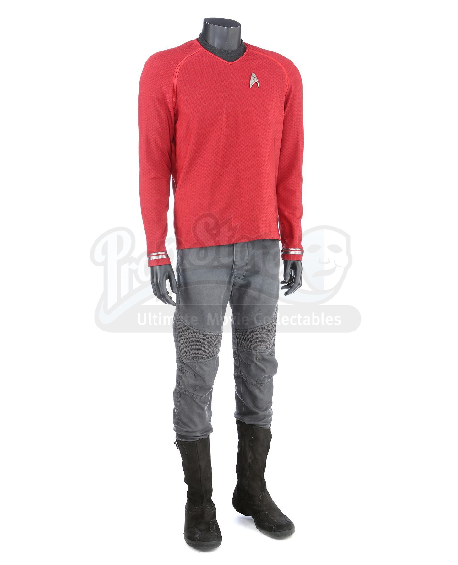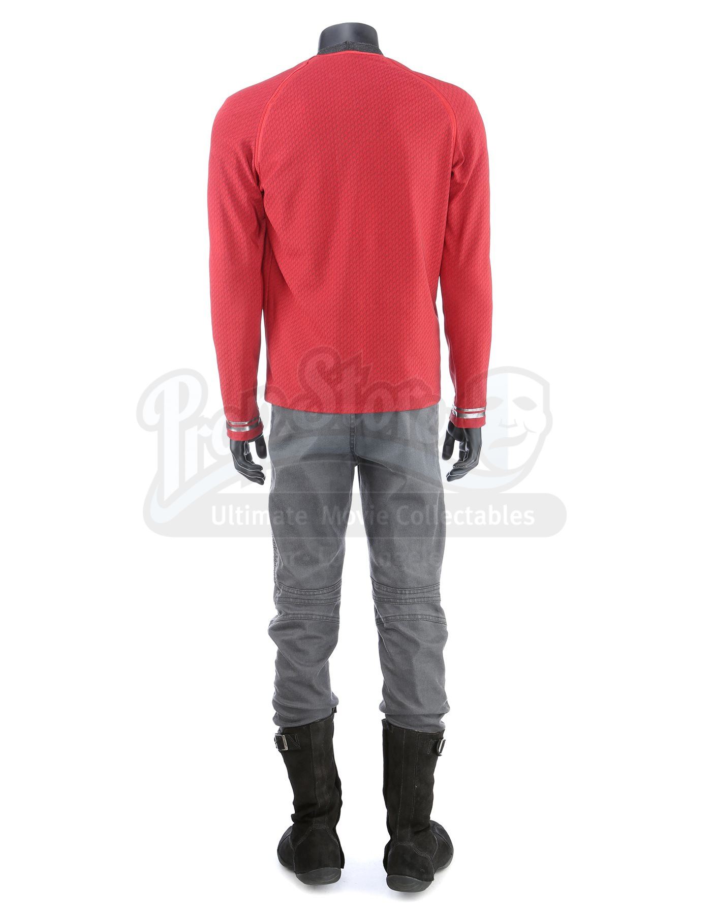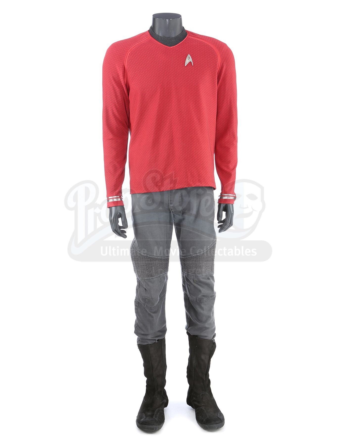 Lt. Commander Scotty's Enterprise operations uniform from Star Trek Into Darkness. Scotty wore his operations uniform while aboard the Enterprise. The uniform consists of a tunic (approximate size large), undershirt (medium), pants (approximate size 32), and a pair of boots (marked U.S. size 11). Made specifically for the sequel, the red tunic is made of Spandex and features a printed optical repeat Starfleet insignia pattern. The long-sleeved shirt has piping around the collar, a hidden zipper at the left shoulder, two silver bands on the wrists, and a metal Starfleet operations insignia (made for the sequel) on the left breast. The undershirt consists of a grey polyester collar that is stitched to the top of a long-sleeve black Spandex sport shirt fitted with shoulder pads. The grey twill pants were made specifically for the sequel and have ribbed fabric diagonally above the knees. Also included is a pair of black suede boots with rubber soles. The boots and insignia are the proper type for the costume; they were used in the production but not specifically by this character.The costume features hand-written wardrobe labels with the tunic, undershirt and pants all marked as "Scotty 2". Also included are wardrobe tags with hand-written notes about the costume.Estimate: $3000 - 5000*Estimated sale price; sold without reserve.