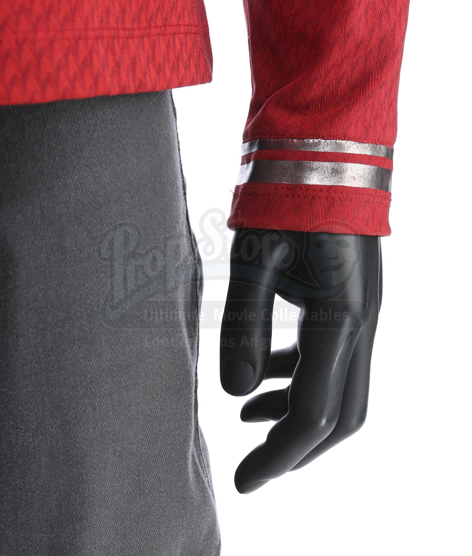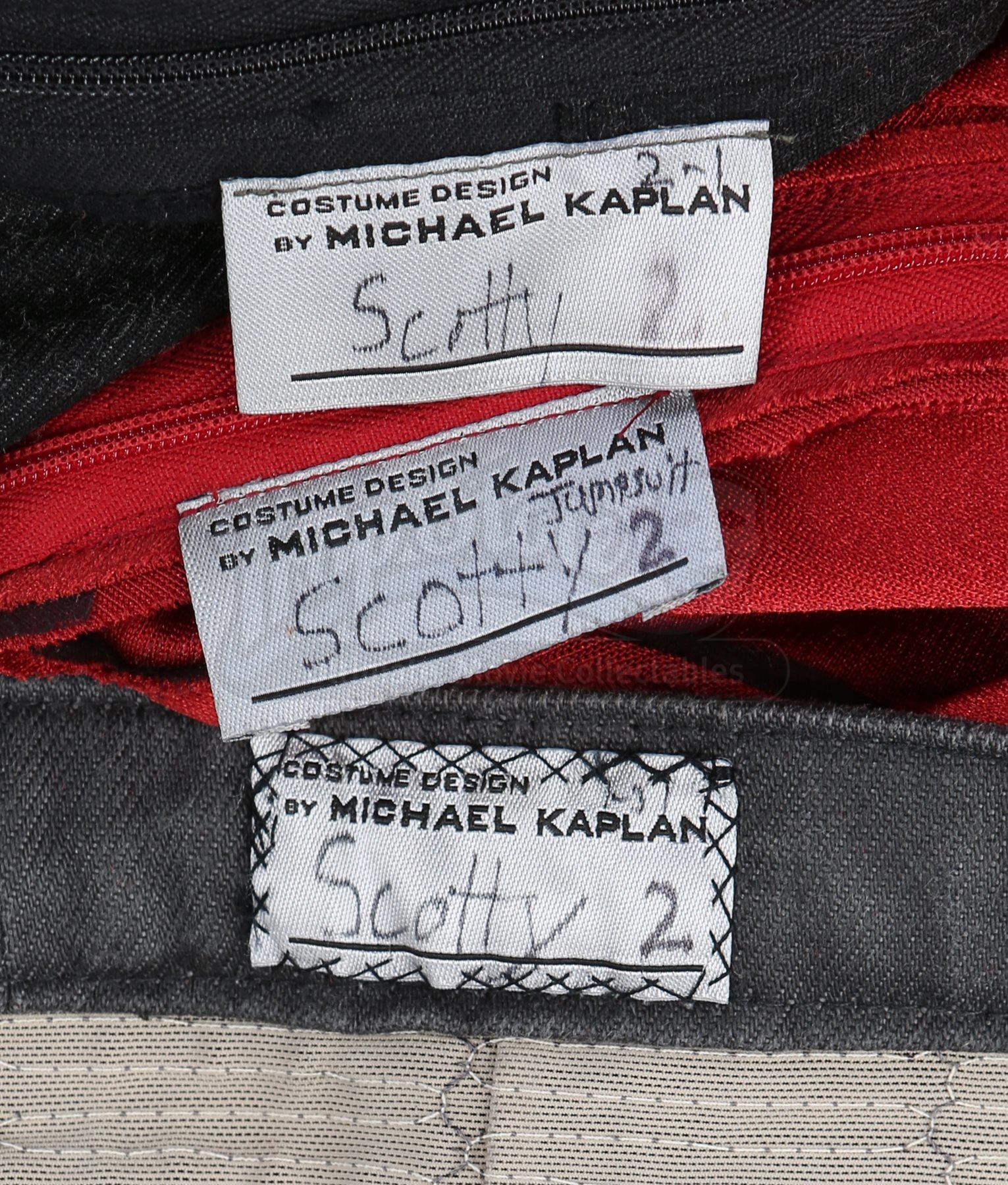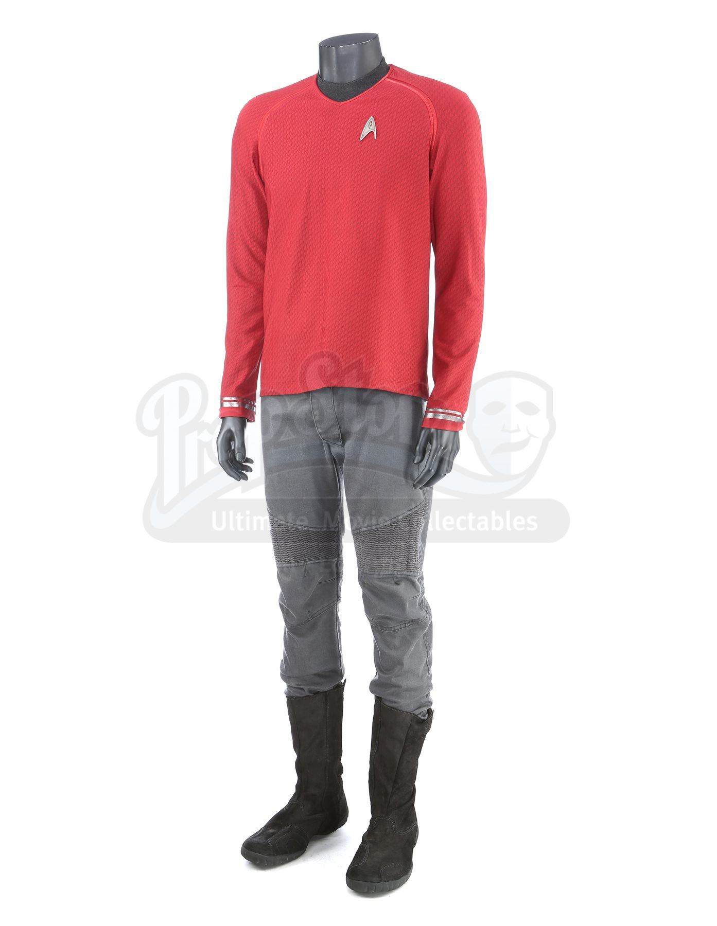 Lt. Commander Scotty's Enterprise operations uniform from Star Trek Into Darkness. Scotty wore his operations uniform while aboard the Enterprise. The uniform consists of a tunic (approximate size large), undershirt (medium), pants (approximate size 32), and a pair of boots (marked U.S. size 11). Made specifically for the sequel, the red tunic is made of Spandex and features a printed optical repeat Starfleet insignia pattern. The long-sleeved shirt has piping around the collar, a hidden zipper at the left shoulder, two silver bands on the wrists, and a metal Starfleet operations insignia (made for the sequel) on the left breast. The undershirt consists of a grey polyester collar that is stitched to the top of a long-sleeve black Spandex sport shirt fitted with shoulder pads. The grey twill pants were made specifically for the sequel and have ribbed fabric diagonally above the knees. Also included is a pair of black suede boots with rubber soles. The boots and insignia are the proper type for the costume; they were used in the production but not specifically by this character.The costume features hand-written wardrobe labels with the tunic, undershirt and pants all marked as "Scotty 2". Also included are wardrobe tags with hand-written notes about the costume.Estimate: $3000 - 5000*Estimated sale price; sold without reserve.