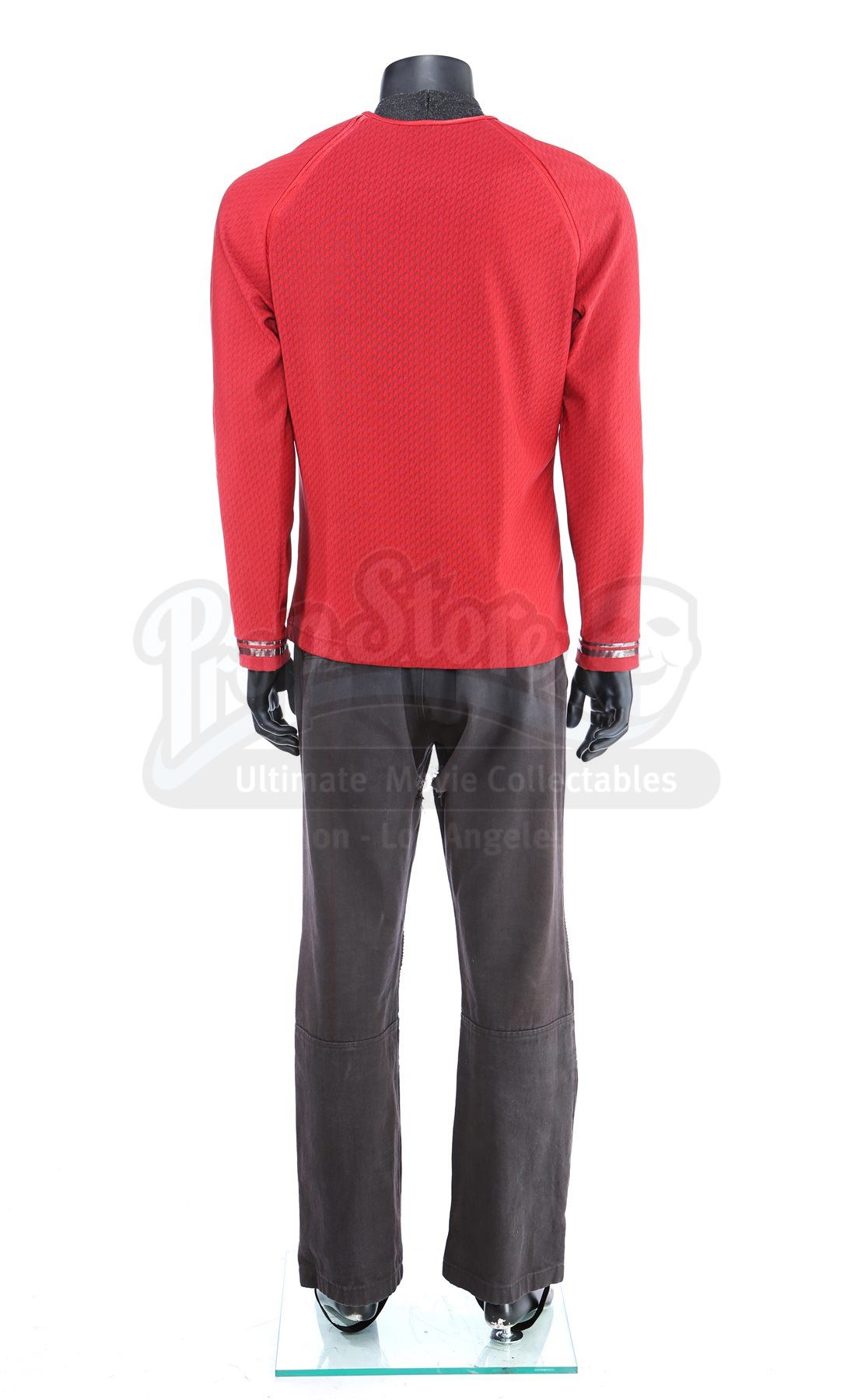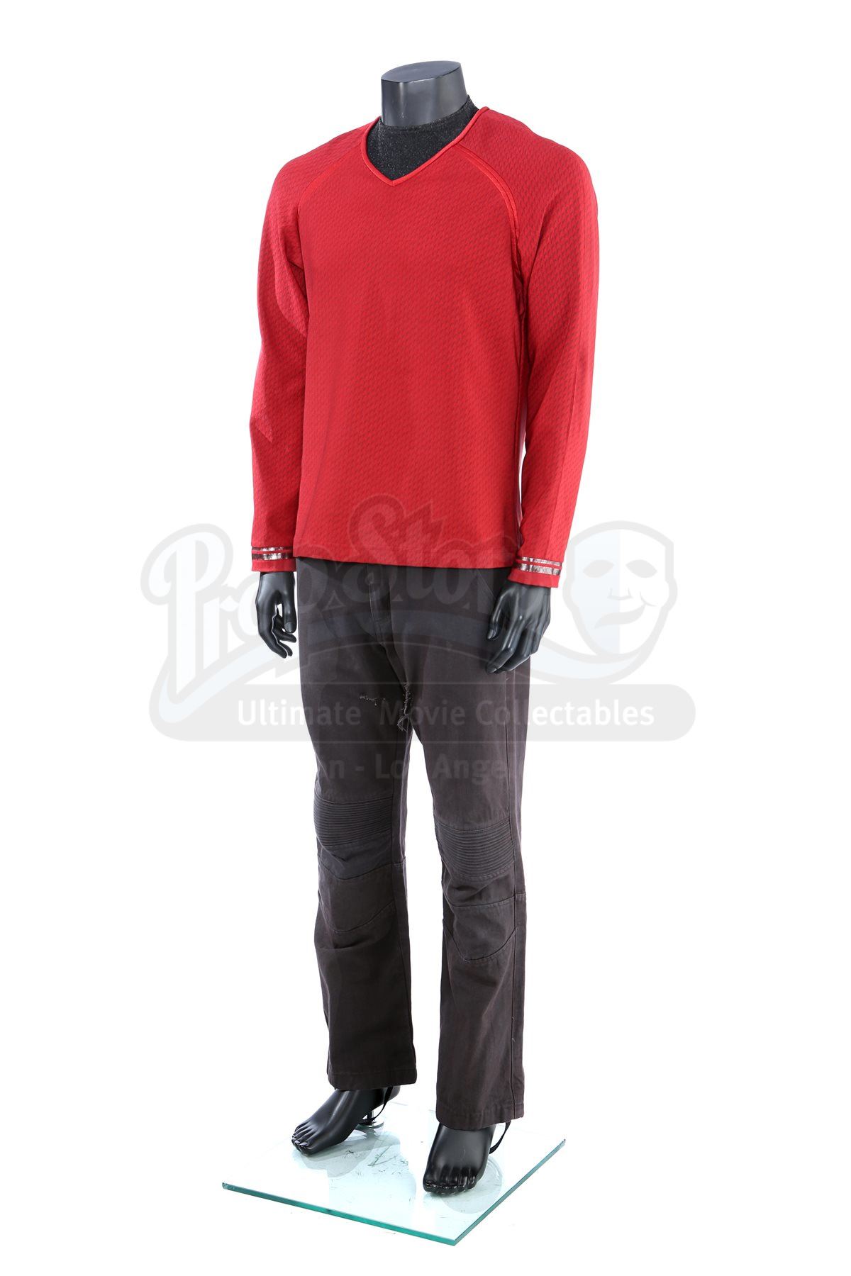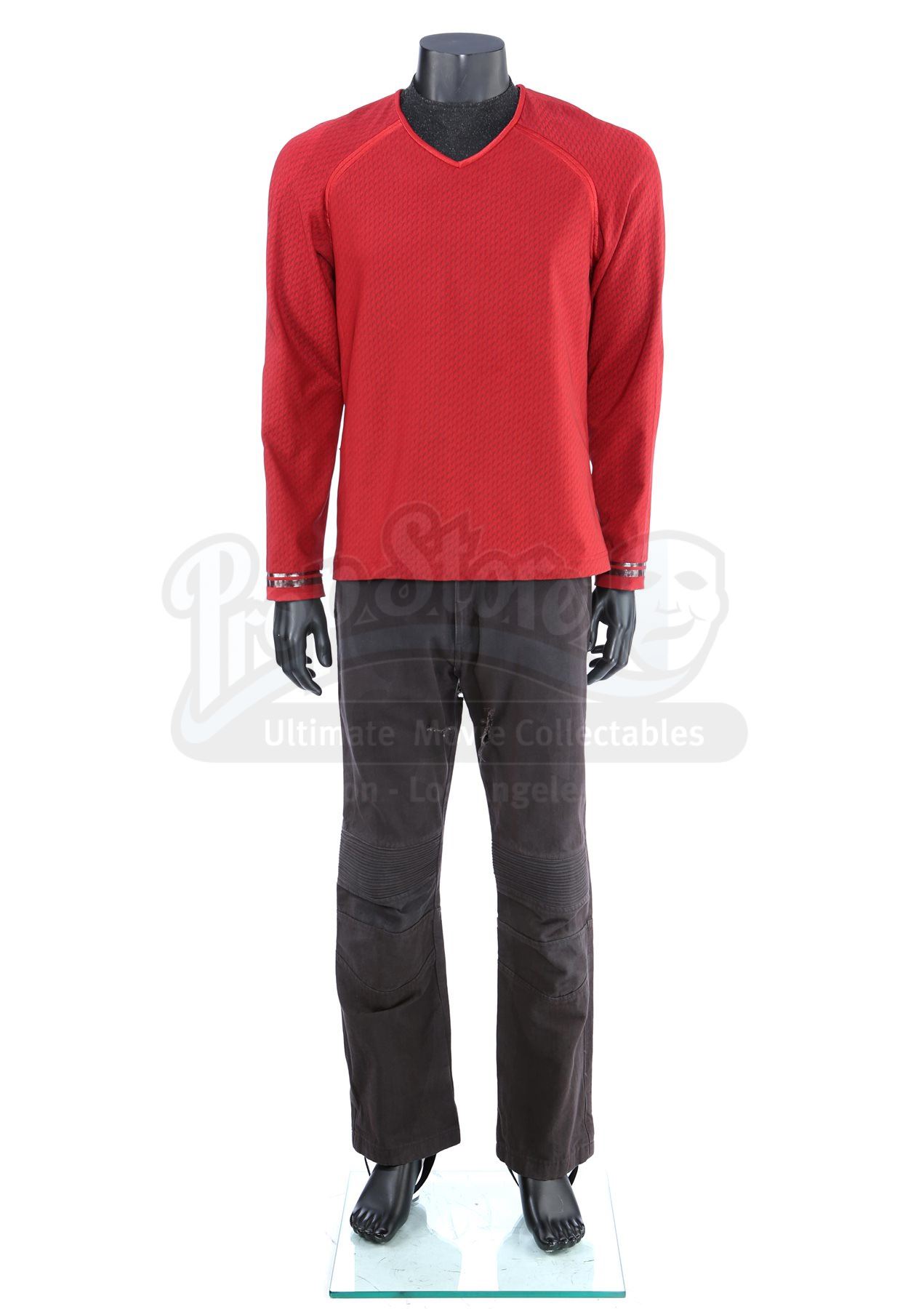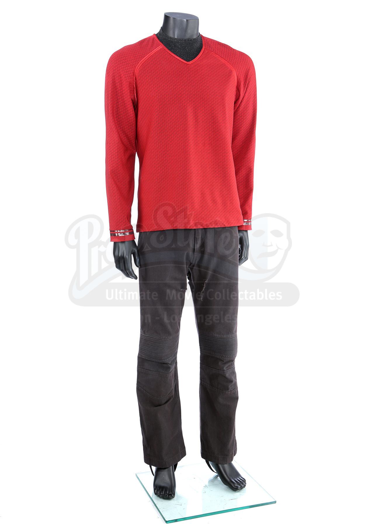 Lt. Commander Scotty's stunt Enterprise operations uniform from Star Trek Into Darkness. Scotty wore his Enterprise while aboard the Enterprise. The costume includes a tunic (marked size 42), semi-mock turtleneck undershirt (medium) and pants (approximate size 34). Made specifically for the sequel, the red tunic is made of Spandex and features a printed optical repeat Starfleet insignia pattern. The long-sleeved shirt has piping around the collar, a hidden zipper at the left shoulder and two silver bands on the wrists. The undershirt consists of a black polyester collar that is stitched to the top of a modified Spandex sport shirt. The grey twill pants were made for the first film and have ribbed fabric above the knees. The costume features hand-written wardrobe labels in the undershirt and pants marked with the name of the stunt actor. Also included are wardrobe tags with hand-written notes about the costume. The costume shows some wear due to production use, such as some holes in the uniform, but remains in very good condition.Estimate: $2000 - 3000*Estimated sale price; sold without reserve.