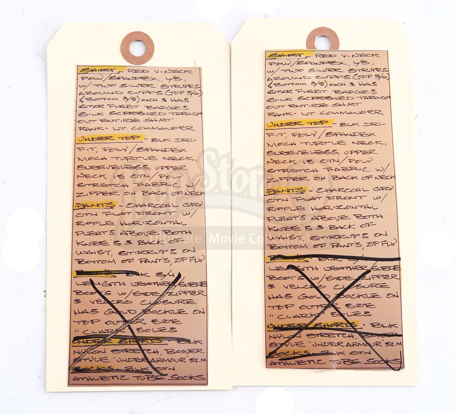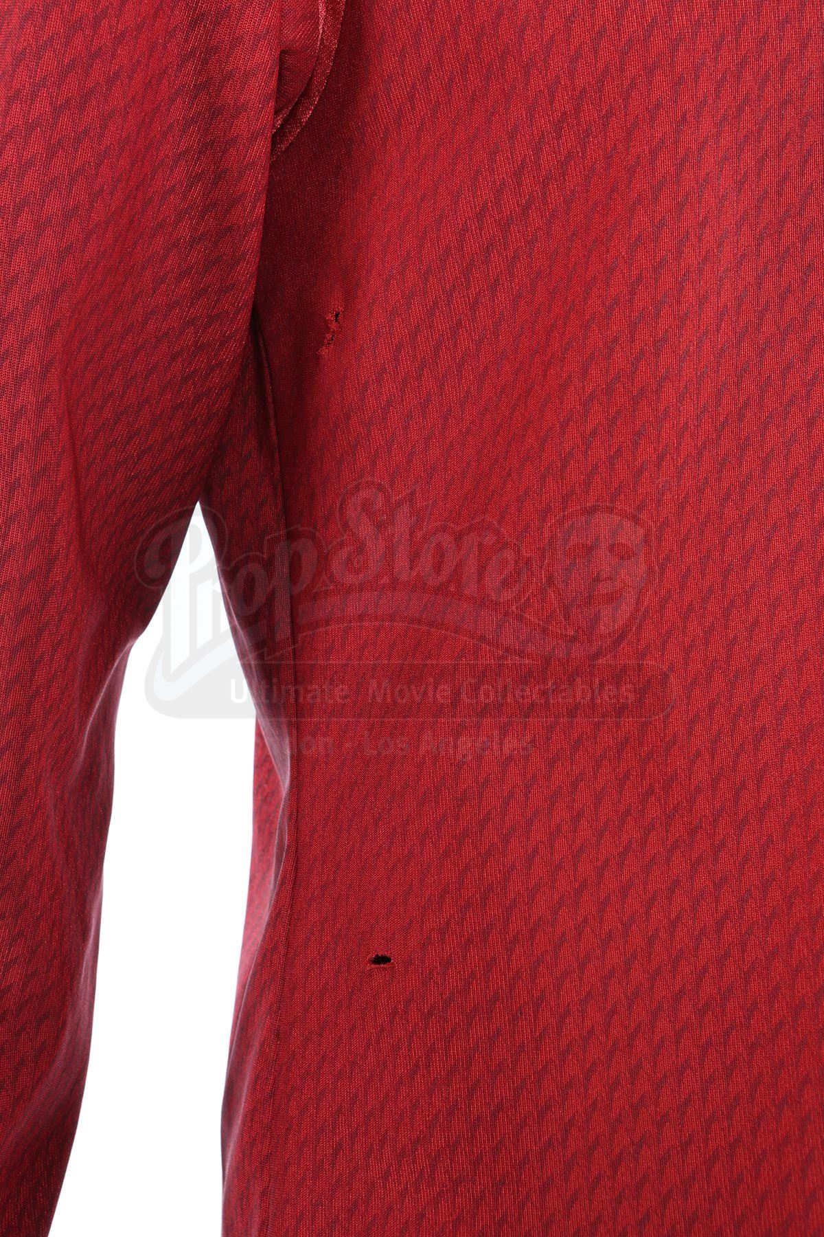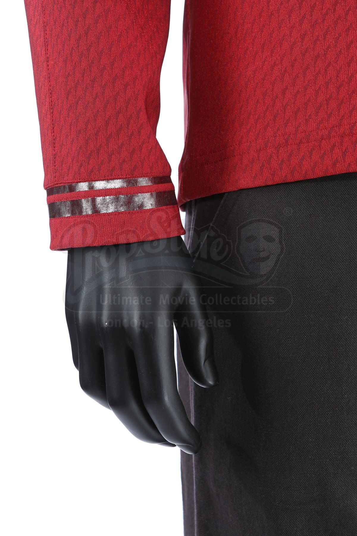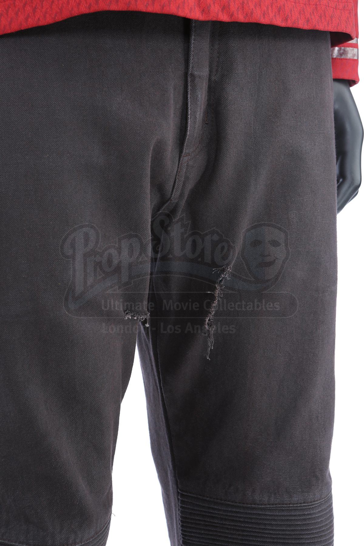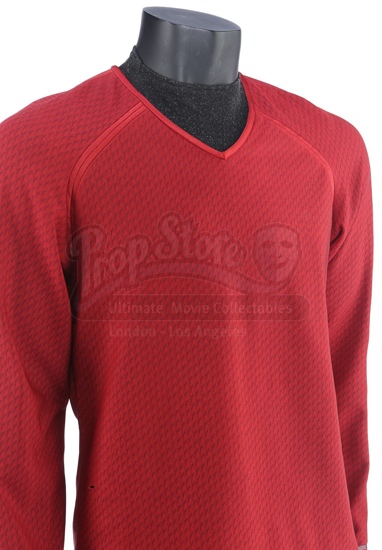Lt. Commander Scotty's stunt Enterprise operations uniform from Star Trek Into Darkness. Scotty wore his Enterprise while aboard the Enterprise. The costume includes a tunic (marked size 42), semi-mock turtleneck undershirt (medium) and pants (approximate size 34). Made specifically for the sequel, the red tunic is made of Spandex and features a printed optical repeat Starfleet insignia pattern. The long-sleeved shirt has piping around the collar, a hidden zipper at the left shoulder and two silver bands on the wrists. The undershirt consists of a black polyester collar that is stitched to the top of a modified Spandex sport shirt. The grey twill pants were made for the first film and have ribbed fabric above the knees. The costume features hand-written wardrobe labels in the undershirt and pants marked with the name of the stunt actor. Also included are wardrobe tags with hand-written notes about the costume. The costume shows some wear due to production use, such as some holes in the uniform, but remains in very good condition.Estimate: $2000 - 3000*Estimated sale price; sold without reserve.