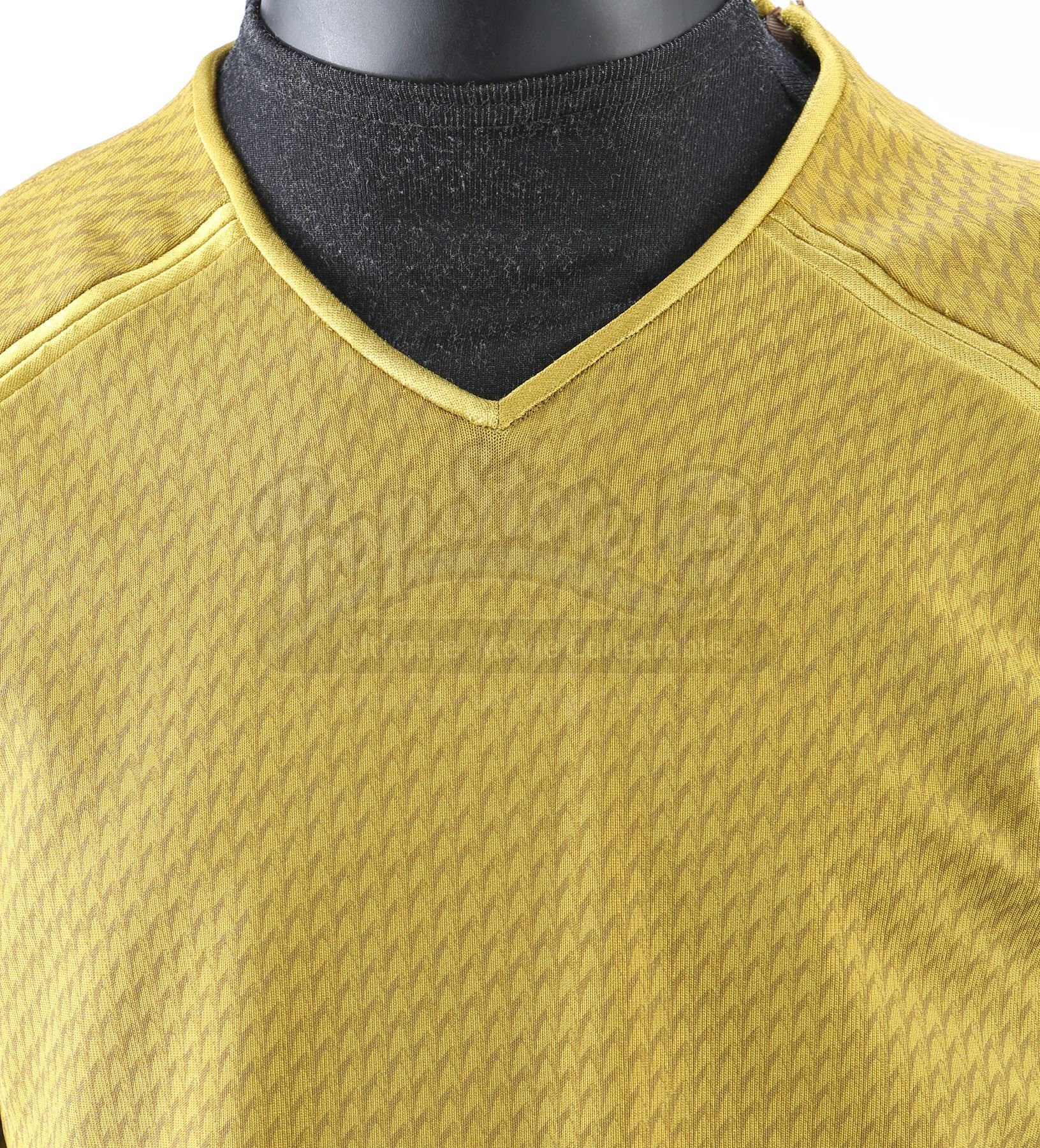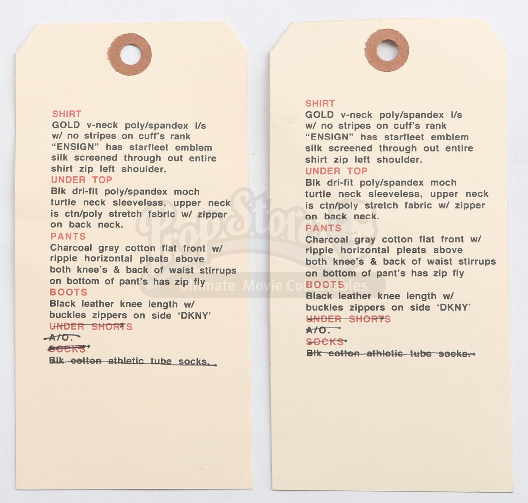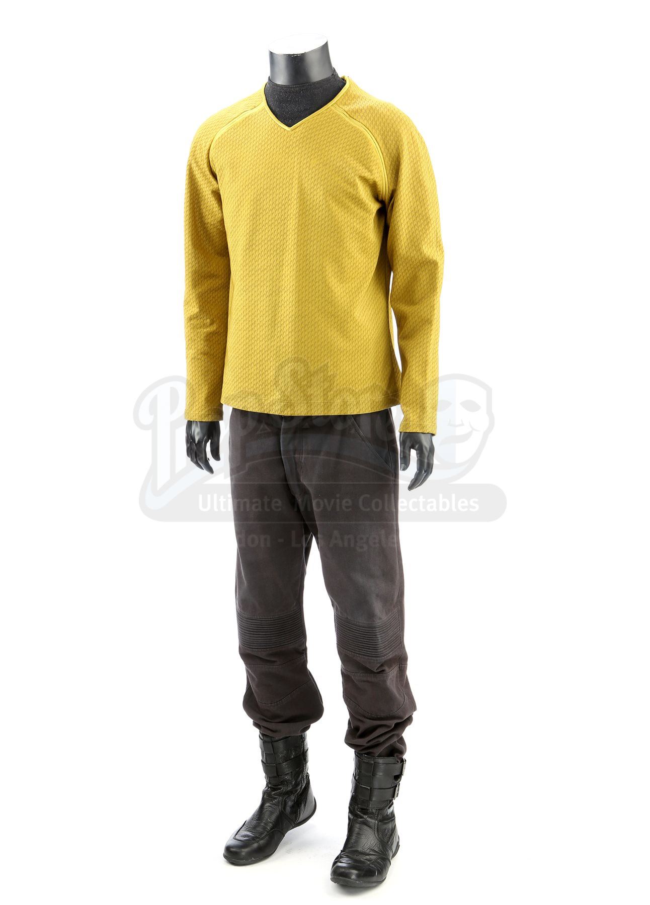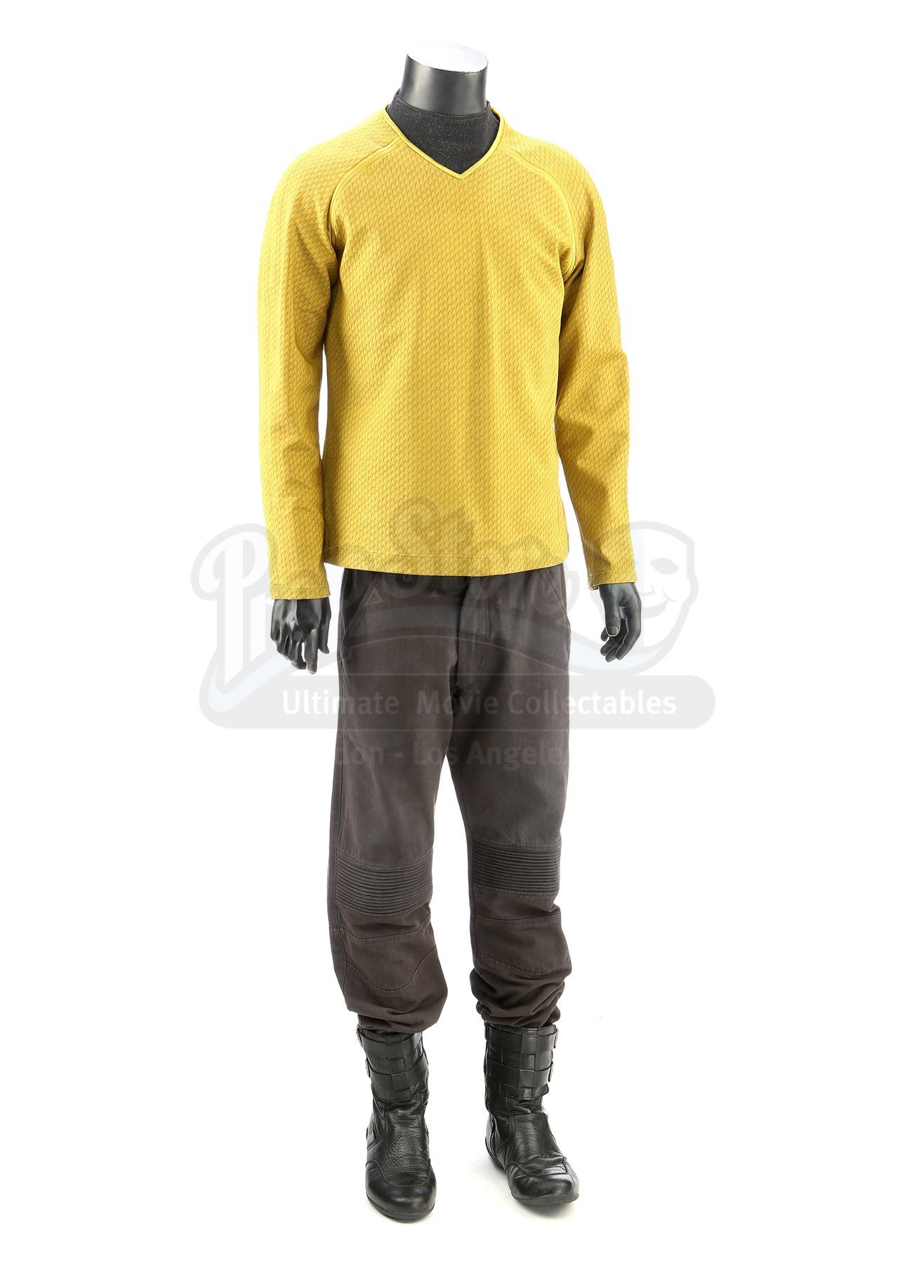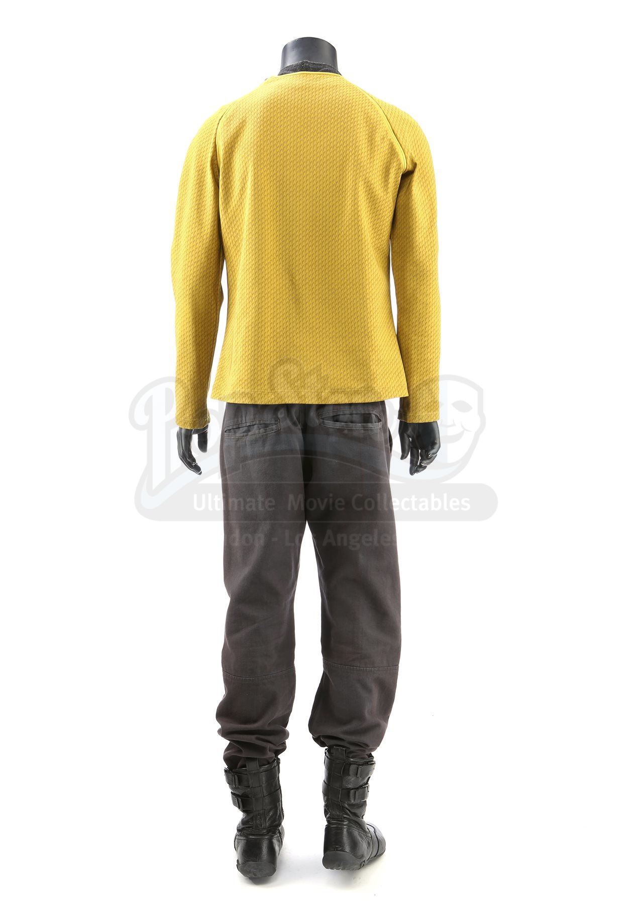 A men's Enterprise command uniform from Star Trek Into Darkness. Enterprise staff in the command division wore their uniforms while aboard the Enterprise. The costume includes a tunic (approximate size medium), semi-mock turtleneck undershirt (medium), pants (marked size 38), and a pair of boots (marked U.S. size 9.5). Made specifically for the sequel, the gold tunic is made of Spandex and features a printed optical repeat Starfleet insignia pattern. The long-sleeved shirt has piping around the collar and a hidden zipper at the left shoulder. The undershirt consists of a grey polyester collar that is stitched to the top of a modified Spandex sport shirt. The grey twill pants were made for the first film and have ribbed fabric above the knees. Also included is a pair of black leather boots with rubber soles. Also included are wardrobe tags with hand-written notes about the costume.Estimate: $1000 - 1500*Estimated sale price; sold without reserve.