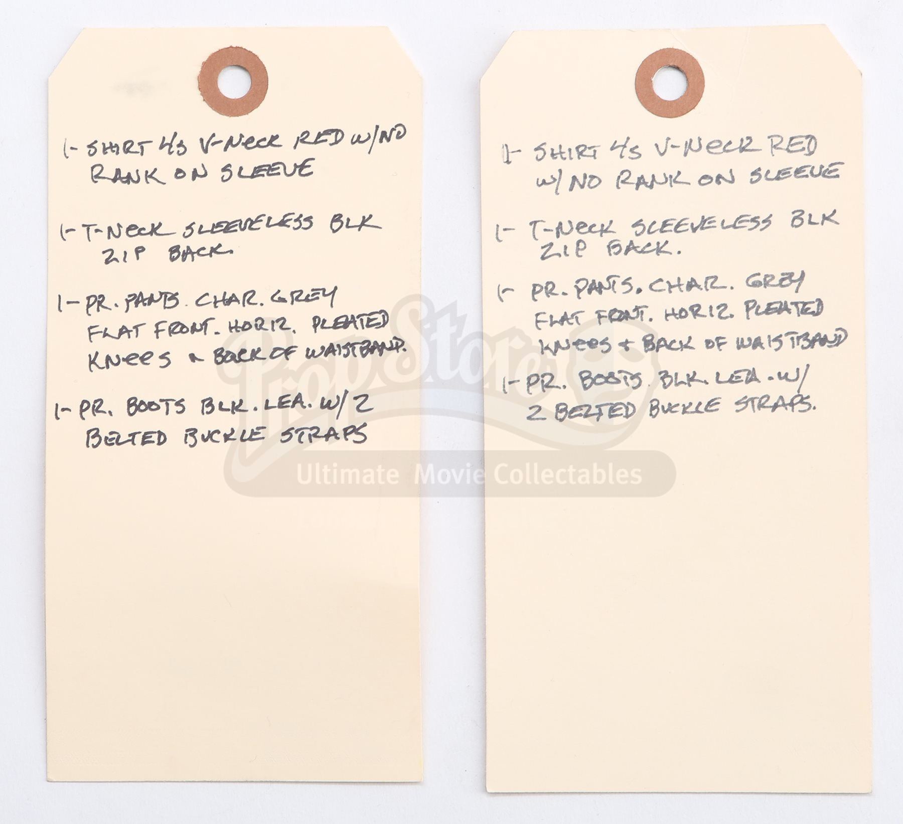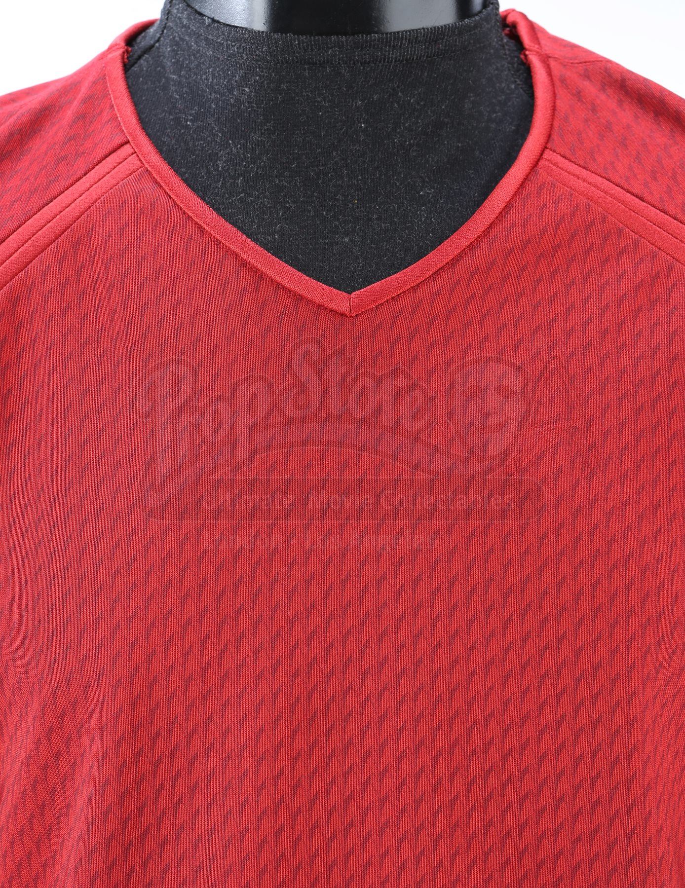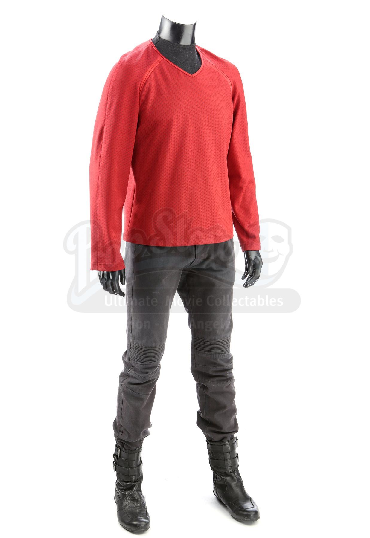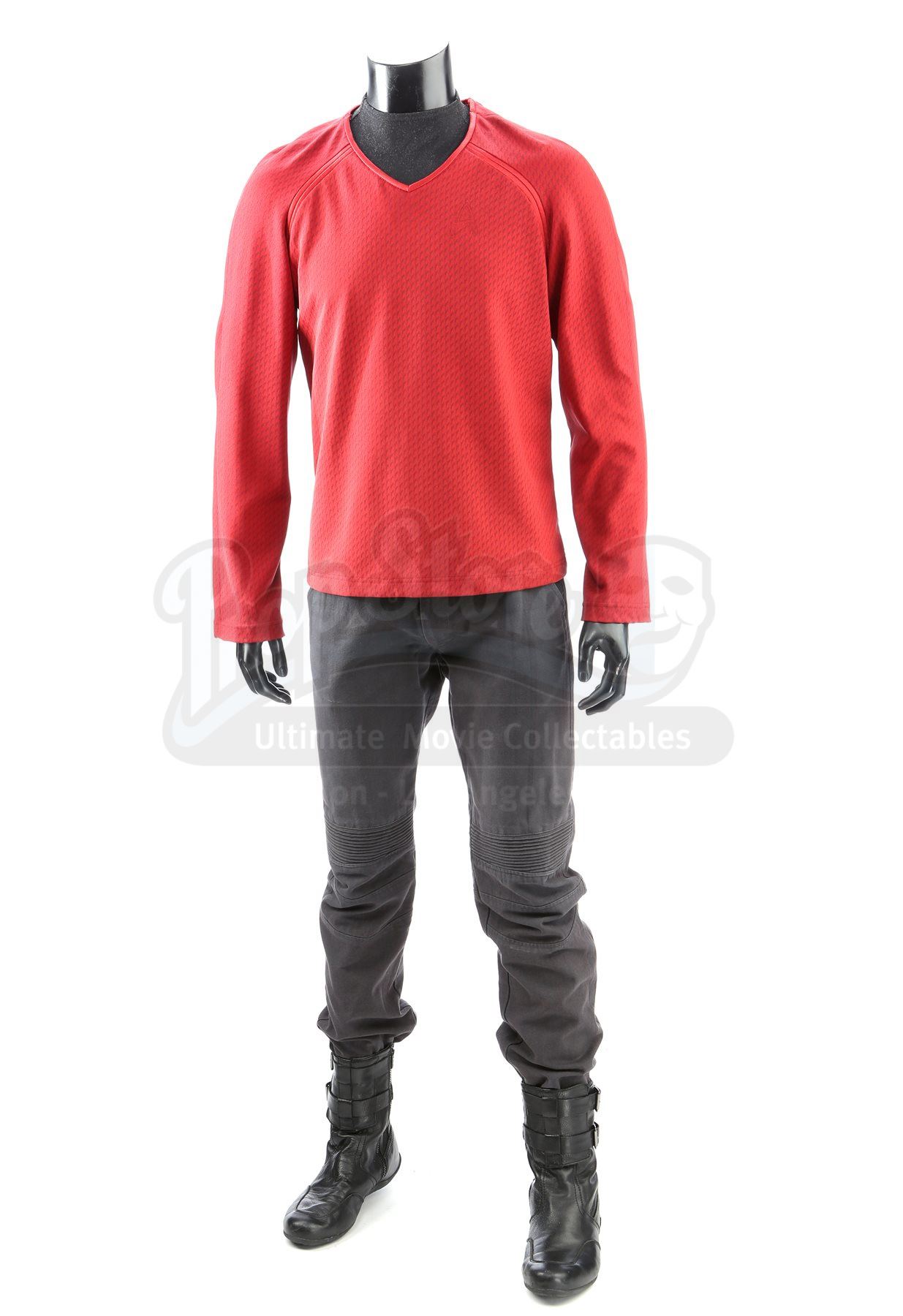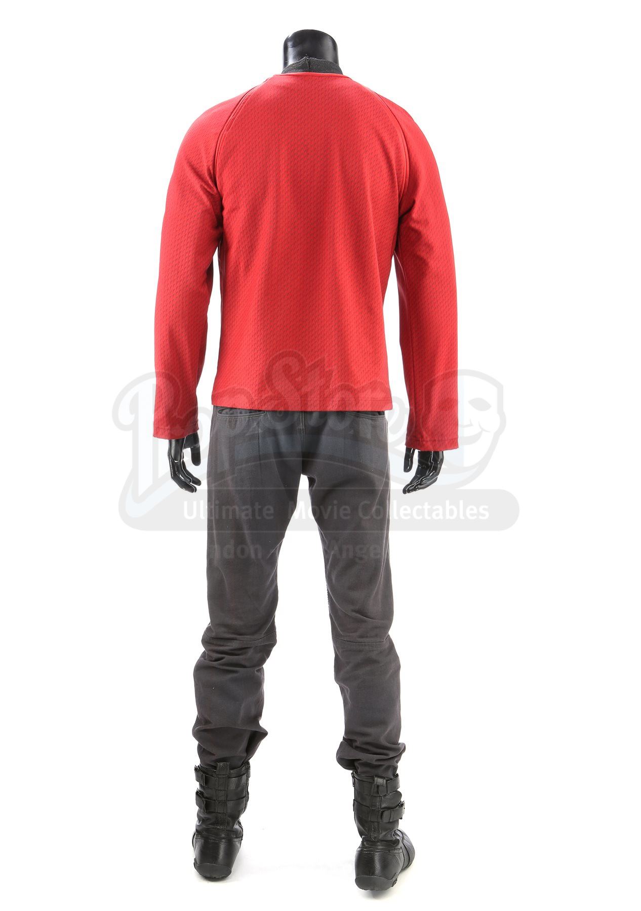 A men's Enterprise operations uniform from Star Trek Into Darkness. Enterprise staff in the operations division wore their uniforms while aboard the Enterprise throughout the first two films. The costume consists of a tunic (marked size 42), semi-mock turtleneck undershirt (medium), pants (approximate size 33), and a pair of boots (marked U.S. size 11). Made specifically for the sequel, the red tunic is made of Spandex and features a printed optical repeat Starfleet insignia pattern. The long-sleeved shirt has piping around the collar and has a hidden zipper at the left shoulder. The undershirt consists of a grey polyester collar that is stitched to the top of a sleeveless black Spandex sport shirt. The grey twill pants have ribbed fabric above the knees. The costume also includes a pair of black leather boots with rubber soles.Also included are wardrobe tags with hand-written notes about the costume. The costume shows some wear due to production use, such as some holes in the costume, but remains in very good condition.Estimate: $1000 - 1500*Estimated sale price; sold without reserve.