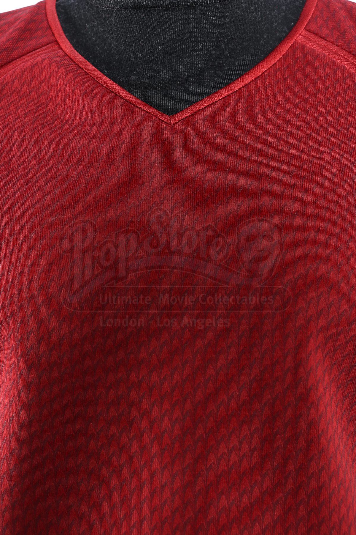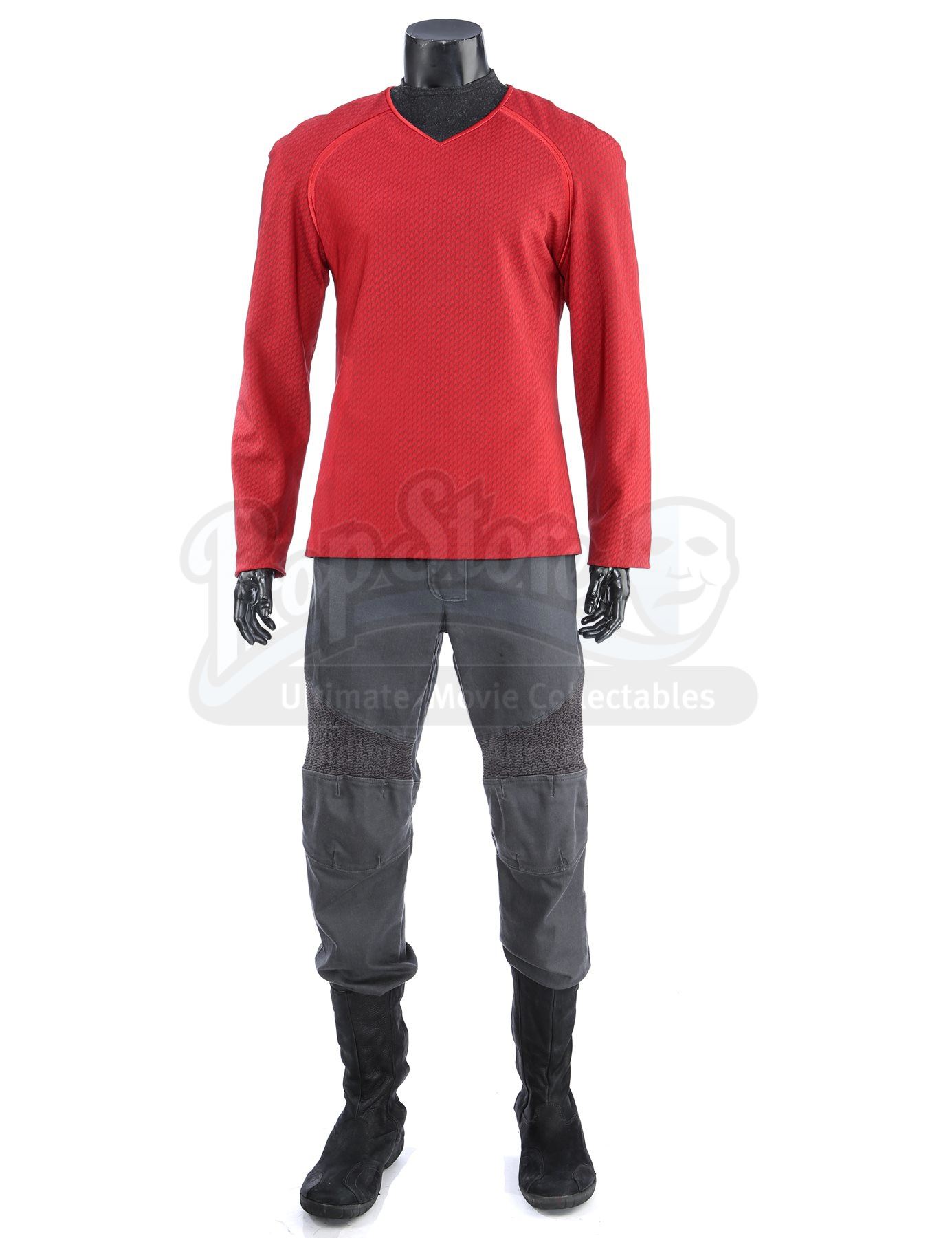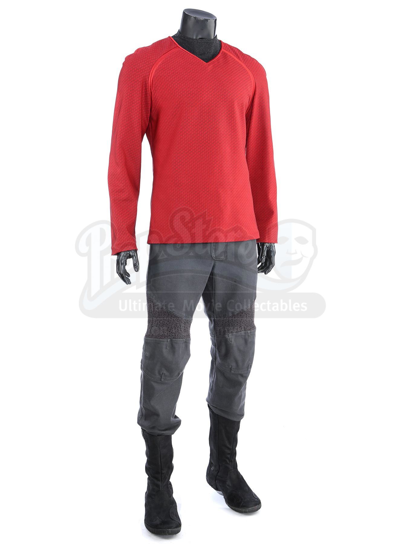 Made specifically for the sequel, the red tunic is made of Spandex, has piping around the collar and features a printed optical repeat Starfleet insignia pattern. The long-sleeved shirt has piping around the collar and a hidden zipper at the left shoulder. The undershirt consists of a grey polyester collar that is stitched to the top of a modified Spandex sport shirt. The grey twill pants have ribbed fabric above the knees. Also included is a pair of black suede boots with rubber soles. The costume includes a wardrobe tag with hand-written notes about the costume.