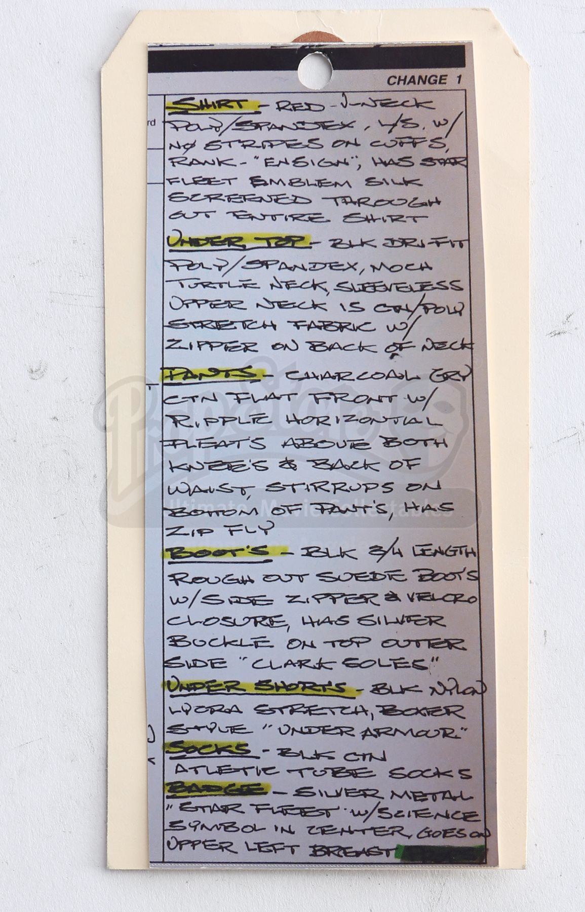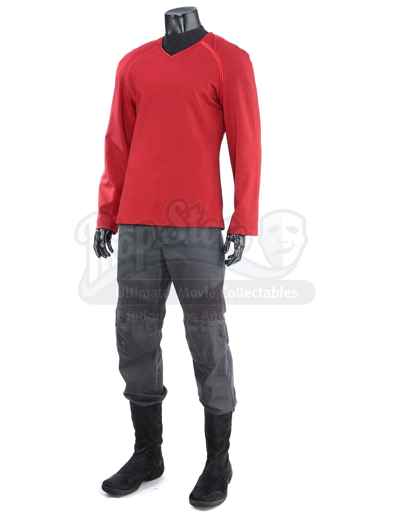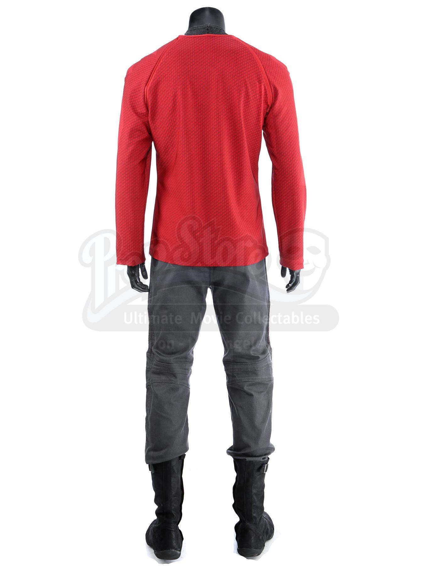 A men's Enterprise operations uniform from Star Trek Into Darkness. Enterprise staff in the operations division wore their uniforms while aboard the Enterprise. The costume includes a tunic (marked size 34), a semi-mock turtleneck undershirt (large), pants (approximate size 34), and a pair of boots (marked U.S. size 12). Made specifically for the sequel, the red tunic is made of Spandex, has piping around the collar and features a printed optical repeat Starfleet insignia pattern. The long-sleeved shirt has piping around the collar and a hidden zipper at the left shoulder. The undershirt consists of a grey polyester collar that is stitched to the top of a modified Spandex sport shirt. The grey twill pants have ribbed fabric above the knees. Also included is a pair of black suede boots with rubber soles. The costume includes a wardrobe tag with hand-written notes about the costume. Estimate: $1000 - 1500*Estimated sale price; sold without reserve.