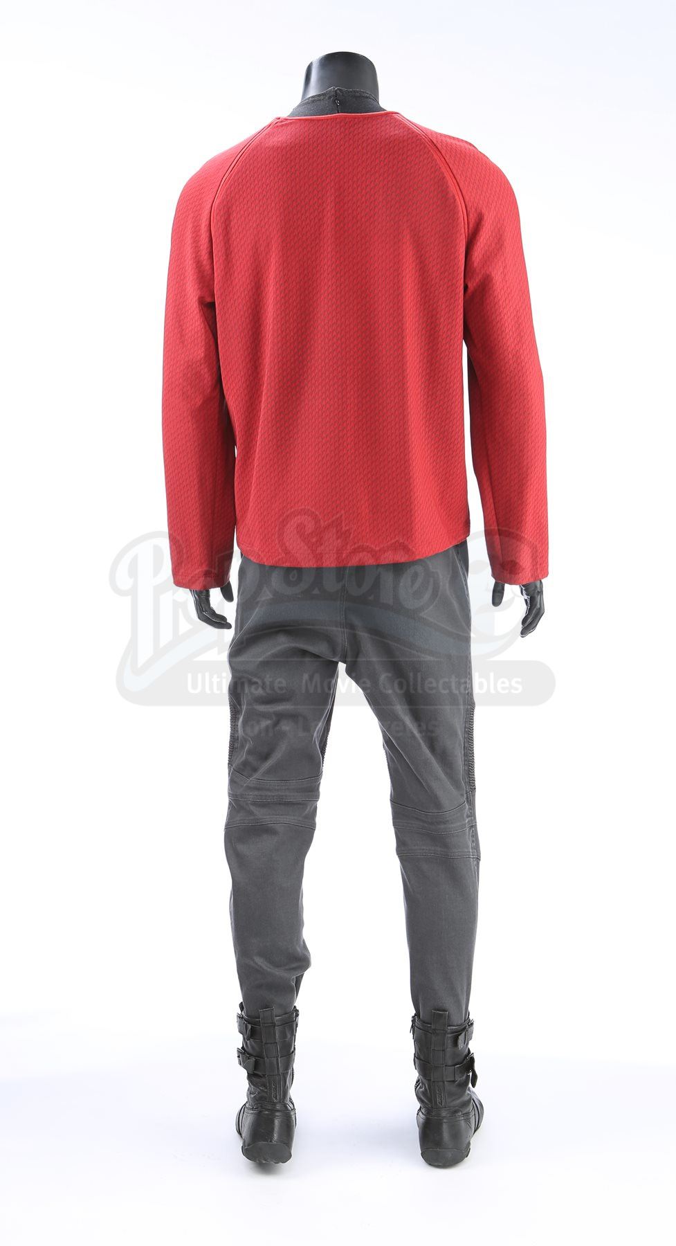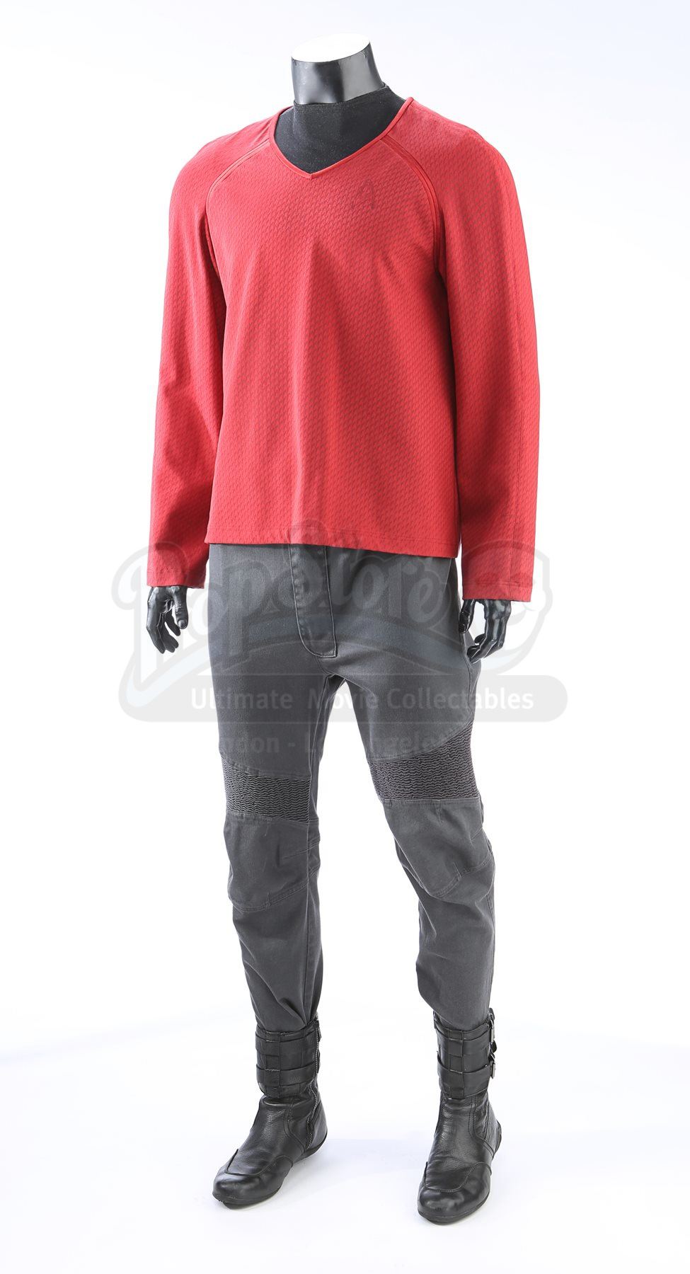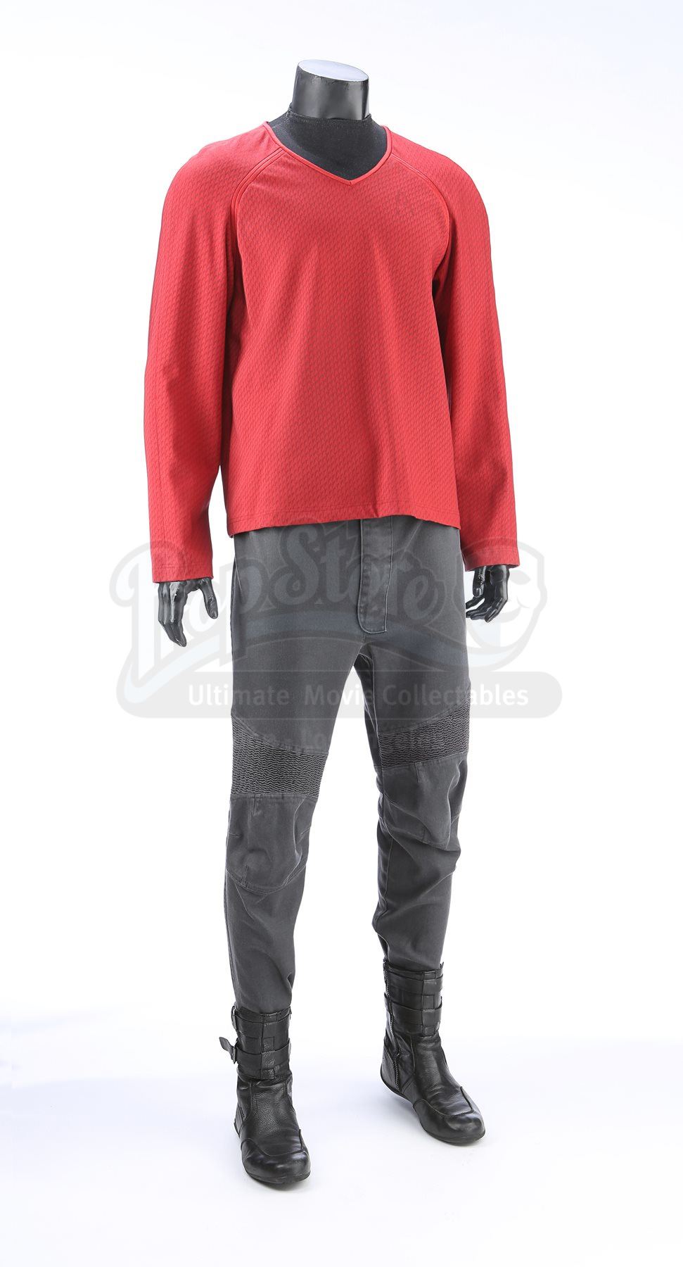 A men's Enterprise Operations uniform from Star Trek Into Darkness. Enterprise staff in the operations division wore their uniforms while aboard the Enterprise throughout the first two films. The costume includes a tunic (approximate size large), semi-mock turtleneck undershirt (large), pants (approximate size 38), and a pair of boots (marked U.S. size 11.5). Made specifically for the sequel, the red tunic is made of Spandex and features a printed optical repeat Starfleet insignia pattern. The long-sleeved shirt has piping around the collar and a hidden zipper at the left shoulder. The undershirt consists of a grey polyester collar that is stitched to the top of a modified Spandex sport shirt. The grey twill pants were made specifically for the sequel and have ribbed fabric diagonally above the knees. The costume also includes a pair of black leather boots with rubber soles. Also included are wardrobe tags with hand-written notes about the costume.Estimate: $1000 - 1500*Estimated sale price; sold without reserve.