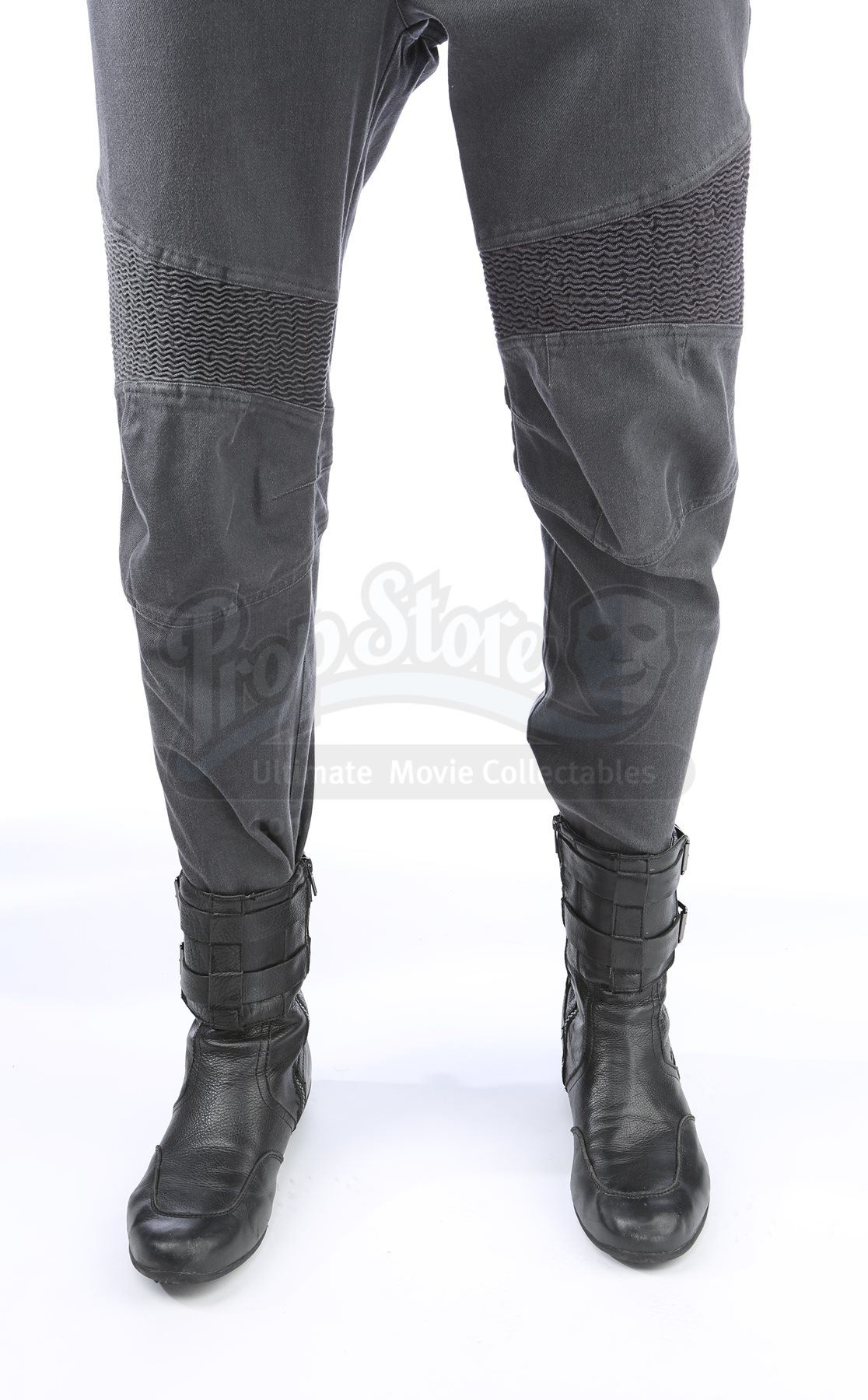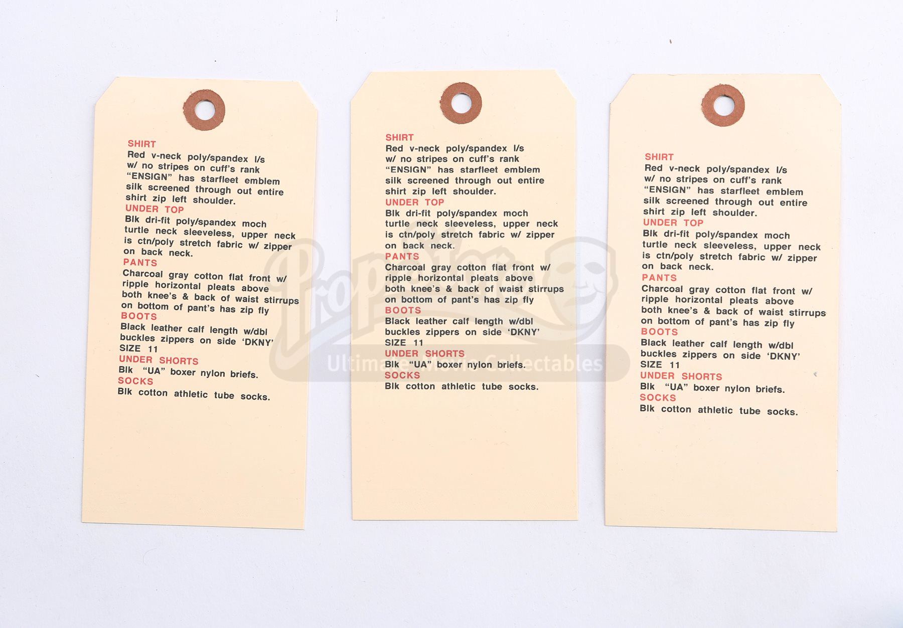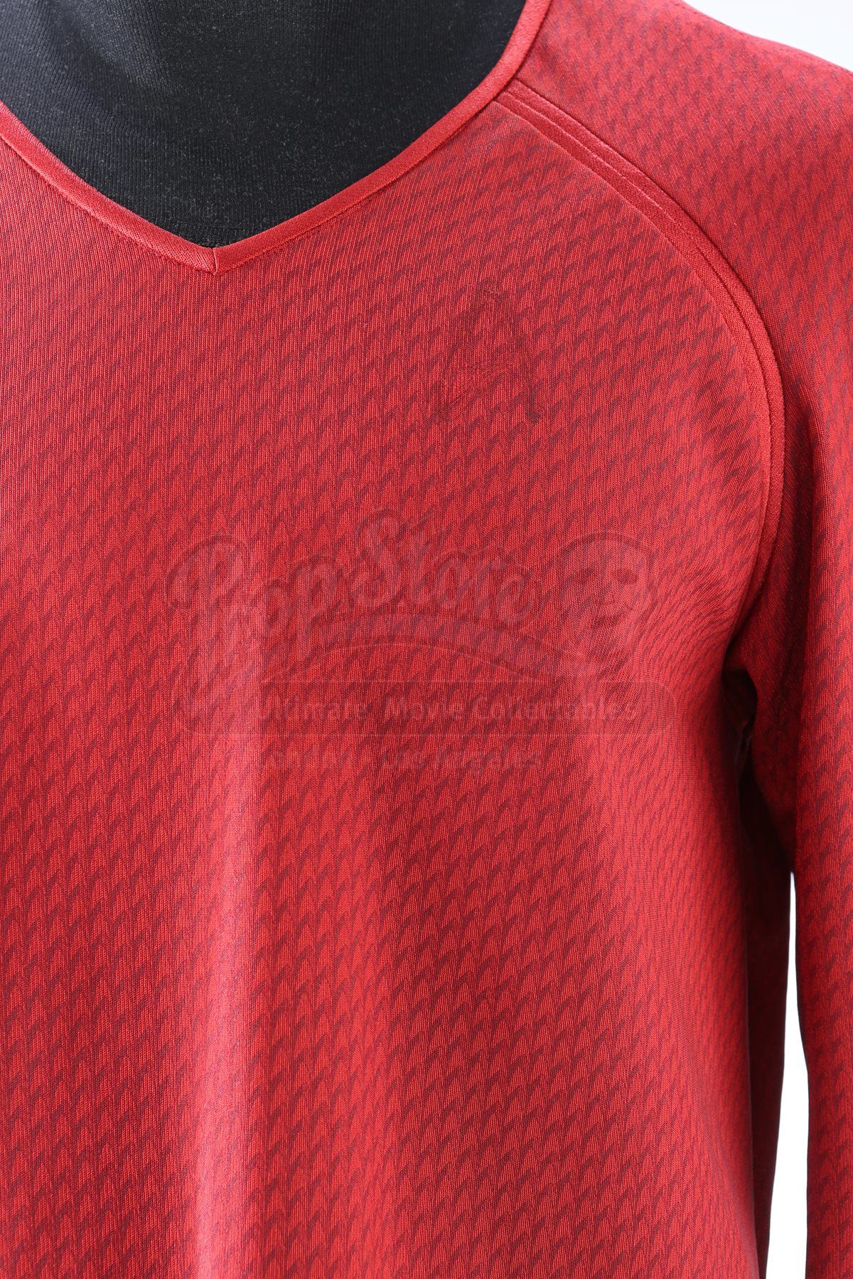 A men's Enterprise Operations uniform from Star Trek Into Darkness. Enterprise staff in the operations division wore their uniforms while aboard the Enterprise throughout the first two films. The costume includes a tunic (approximate size large), semi-mock turtleneck undershirt (large), pants (approximate size 38), and a pair of boots (marked U.S. size 11.5). Made specifically for the sequel, the red tunic is made of Spandex and features a printed optical repeat Starfleet insignia pattern. The long-sleeved shirt has piping around the collar and a hidden zipper at the left shoulder. The undershirt consists of a grey polyester collar that is stitched to the top of a modified Spandex sport shirt. The grey twill pants were made specifically for the sequel and have ribbed fabric diagonally above the knees. The costume also includes a pair of black leather boots with rubber soles. Also included are wardrobe tags with hand-written notes about the costume.Estimate: $1000 - 1500*Estimated sale price; sold without reserve.