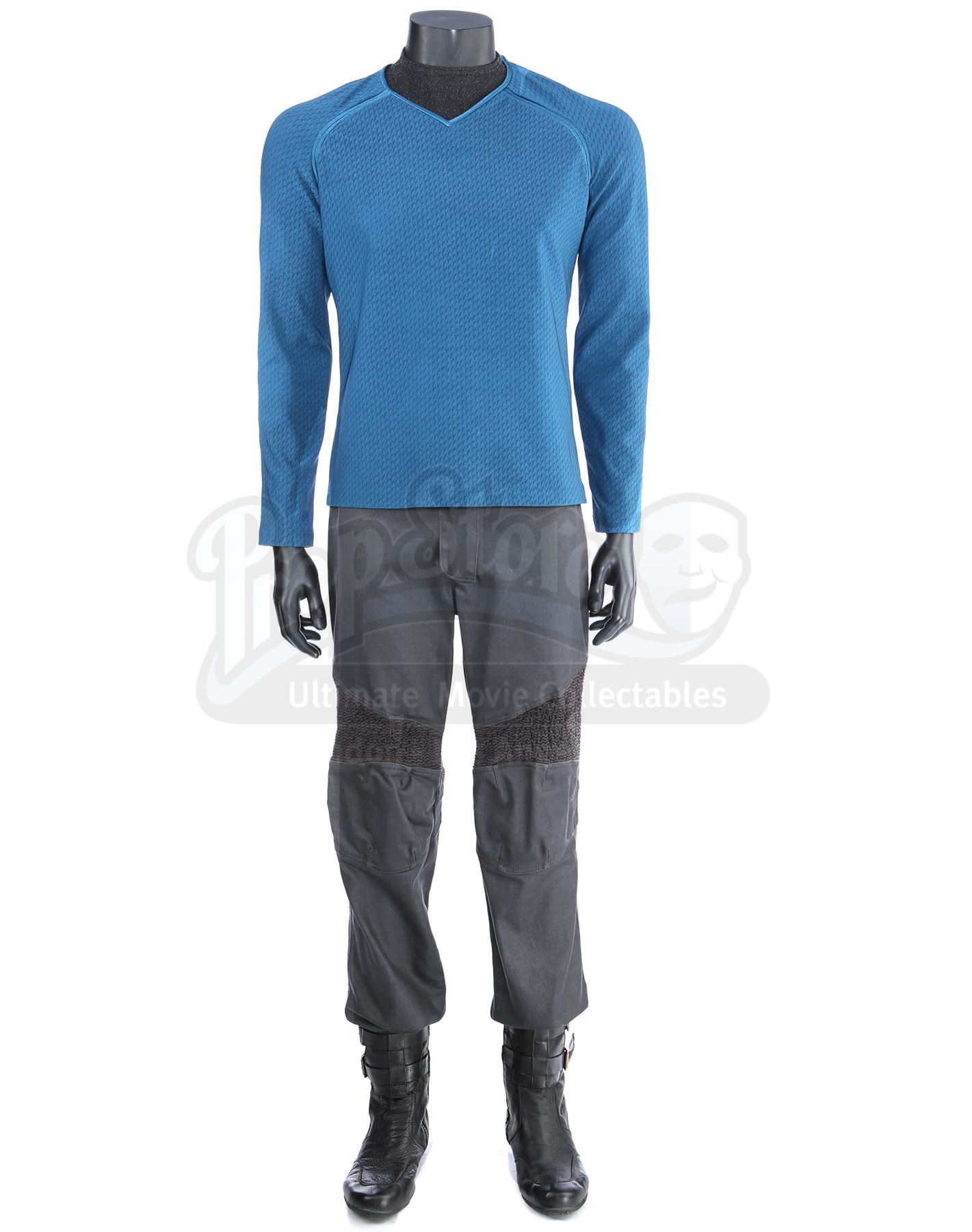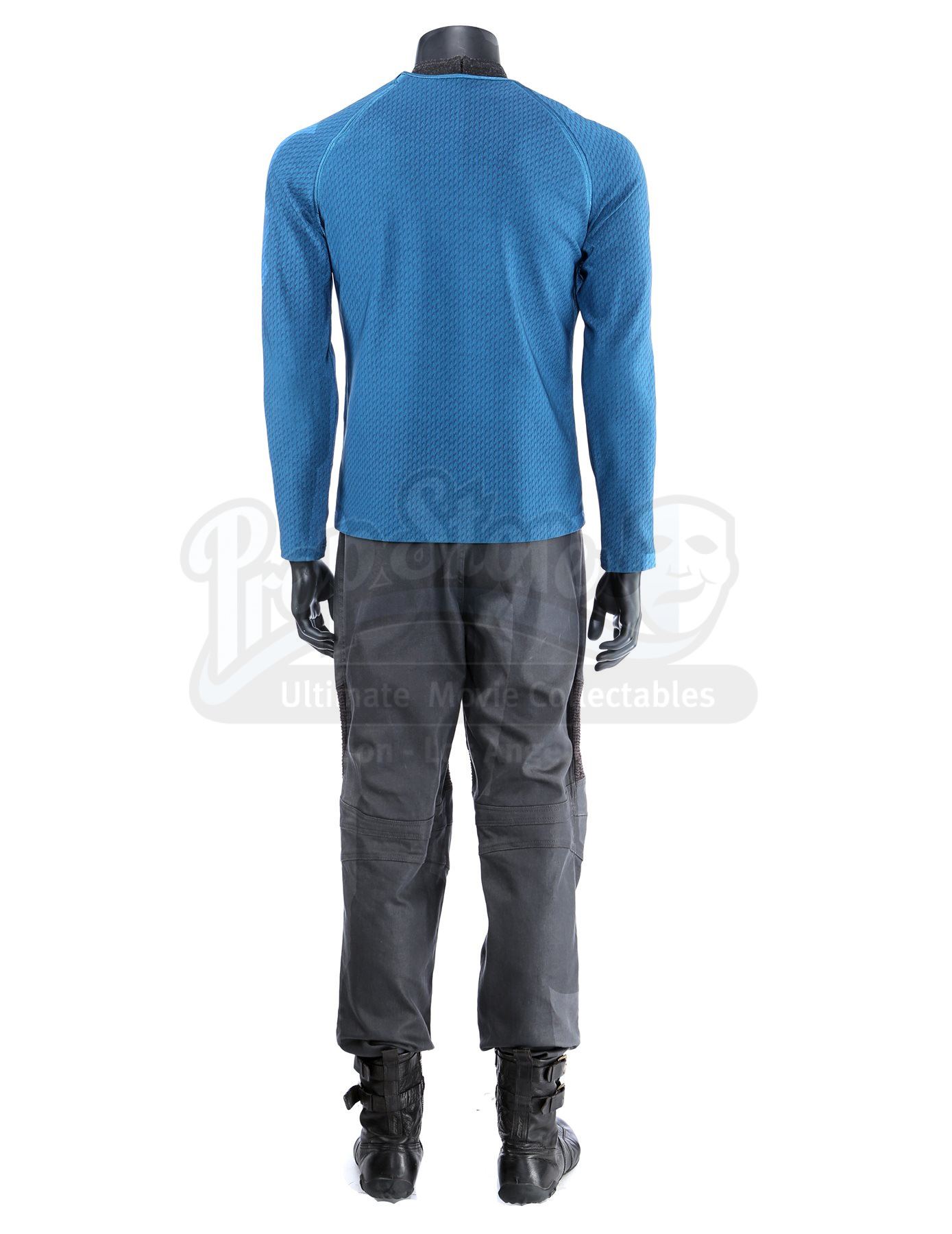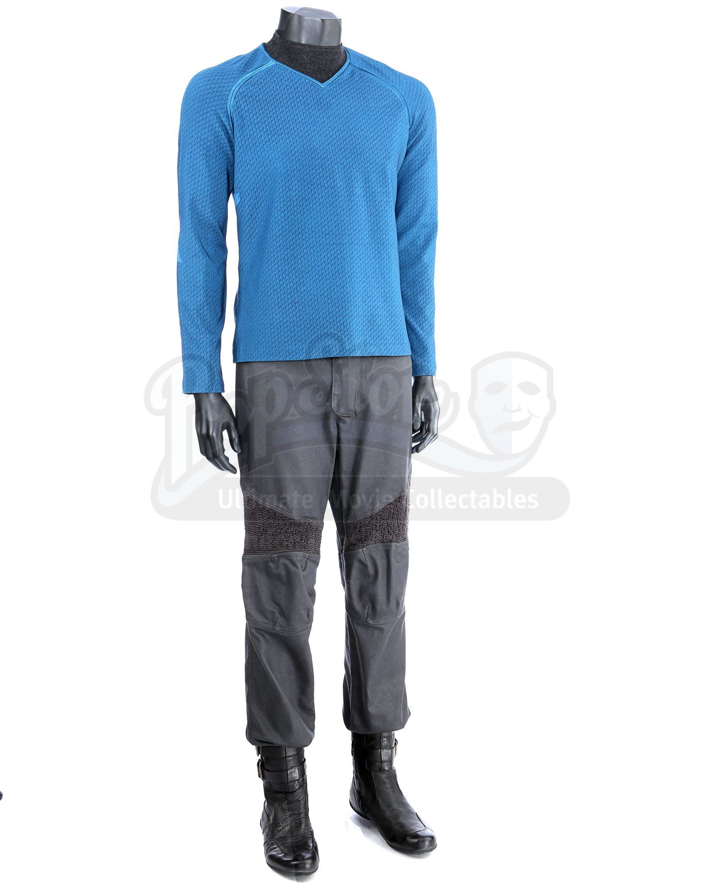 Made specifically for the sequel, the blue tunic is made of Spandex and features a printed optical repeat Starfleet insignia pattern. The long-sleeved shirt has piping around the collar and a hidden zipper at the left shoulder. The undershirt consists of a grey polyester collar that is stitched to the top of a modified Spandex sport shirt. The grey twill pants were made specifically for the sequel and have ribbed fabric diagonally above the knees. Also included is a pair of black leather boots with rubber soles.