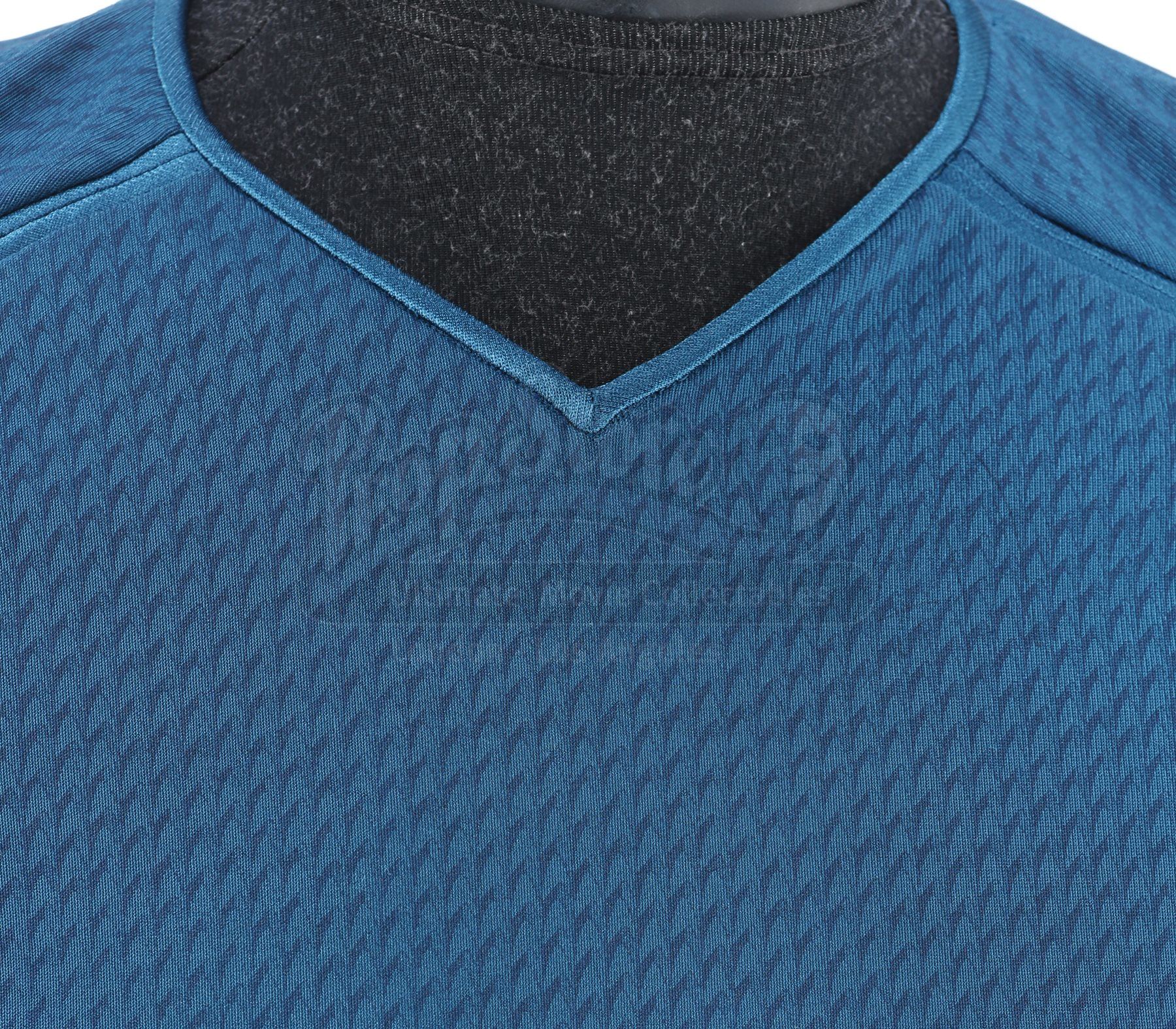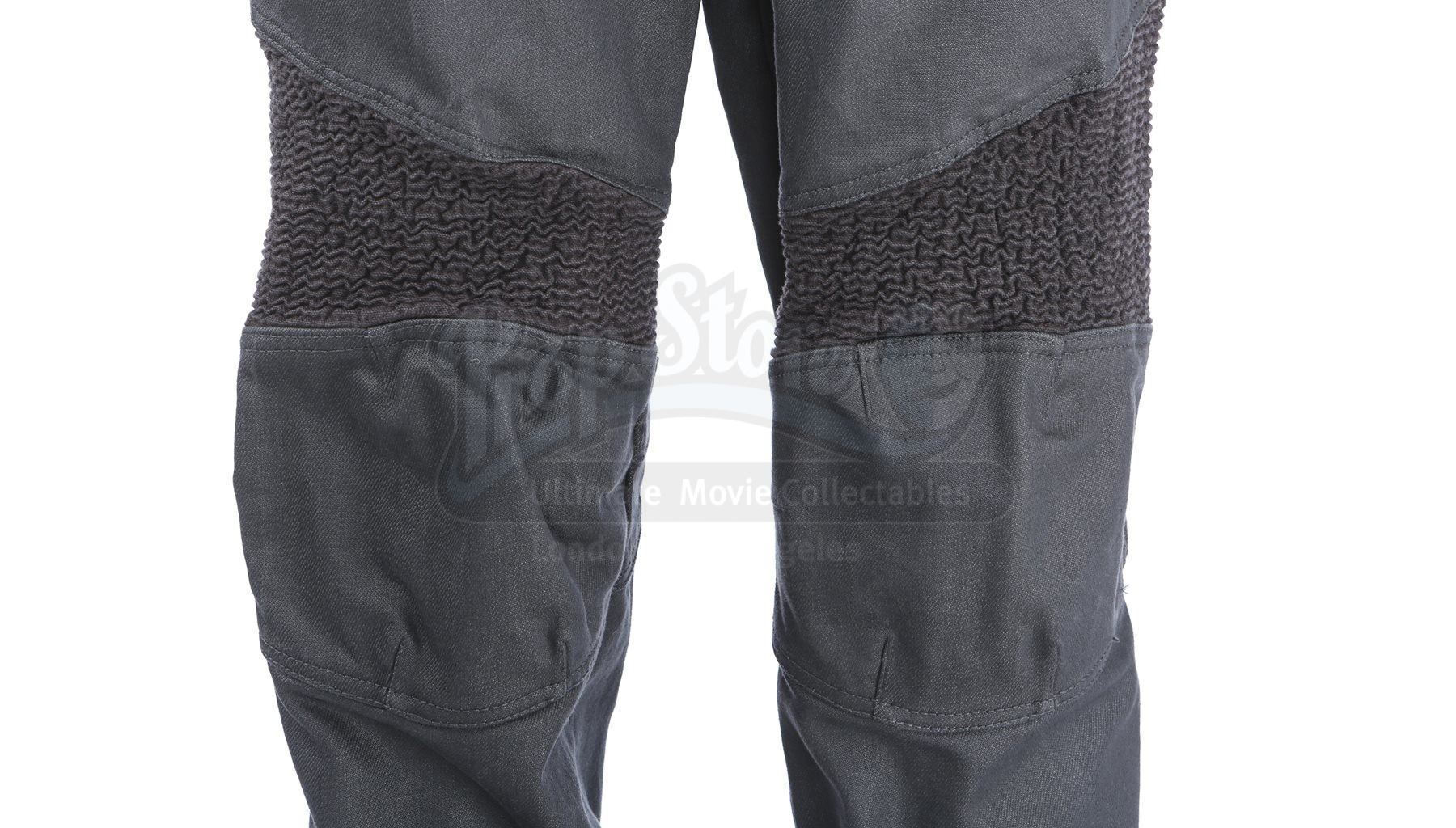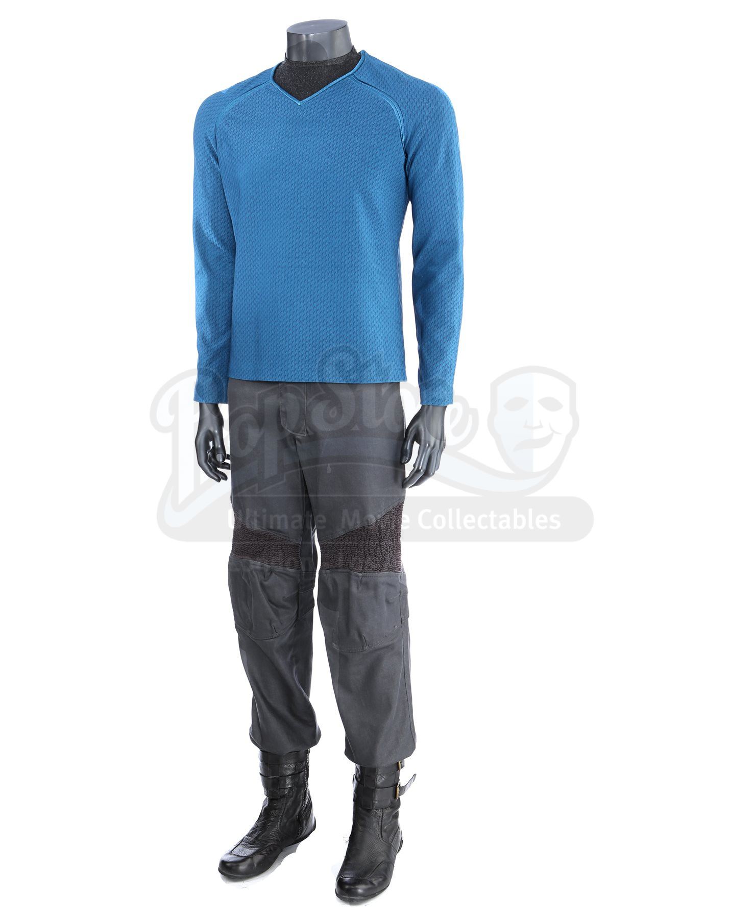 Made specifically for the sequel, the blue tunic is made of Spandex and features a printed optical repeat Starfleet insignia pattern. The long-sleeved shirt has piping around the collar and a hidden zipper at the left shoulder. The undershirt consists of a grey polyester collar that is stitched to the top of a modified Spandex sport shirt. The grey twill pants were made specifically for the sequel and have ribbed fabric diagonally above the knees. Also included is a pair of black leather boots with rubber soles.