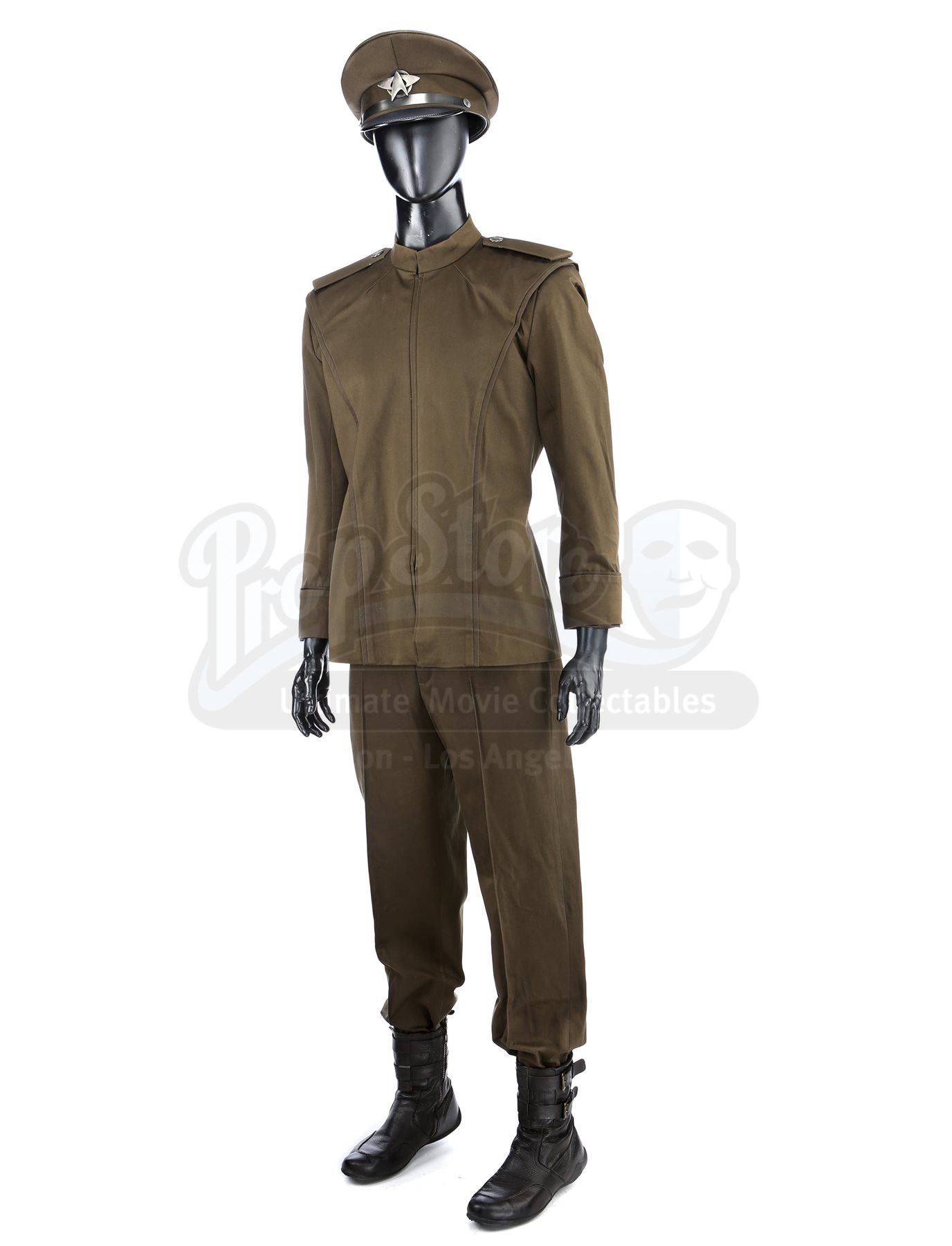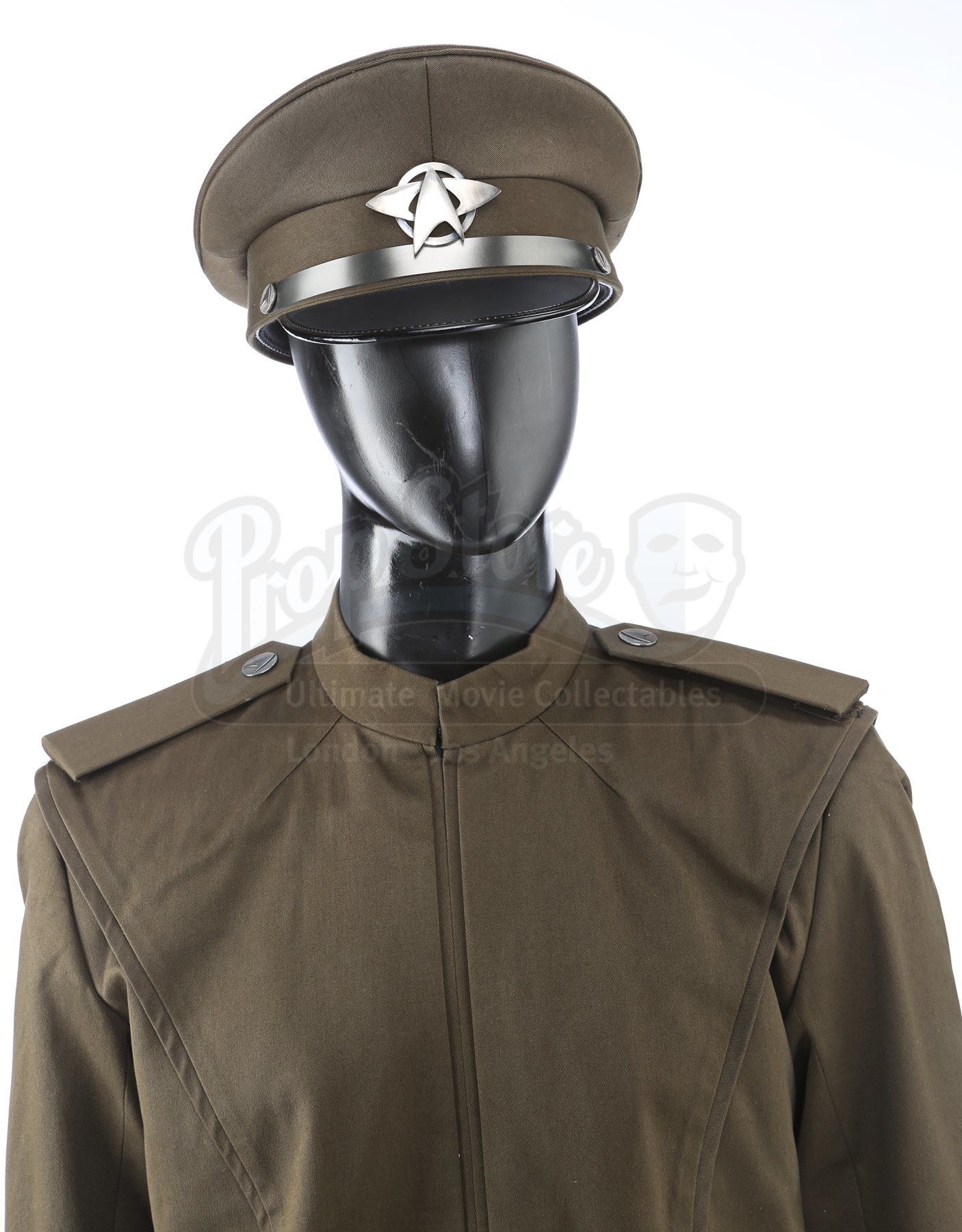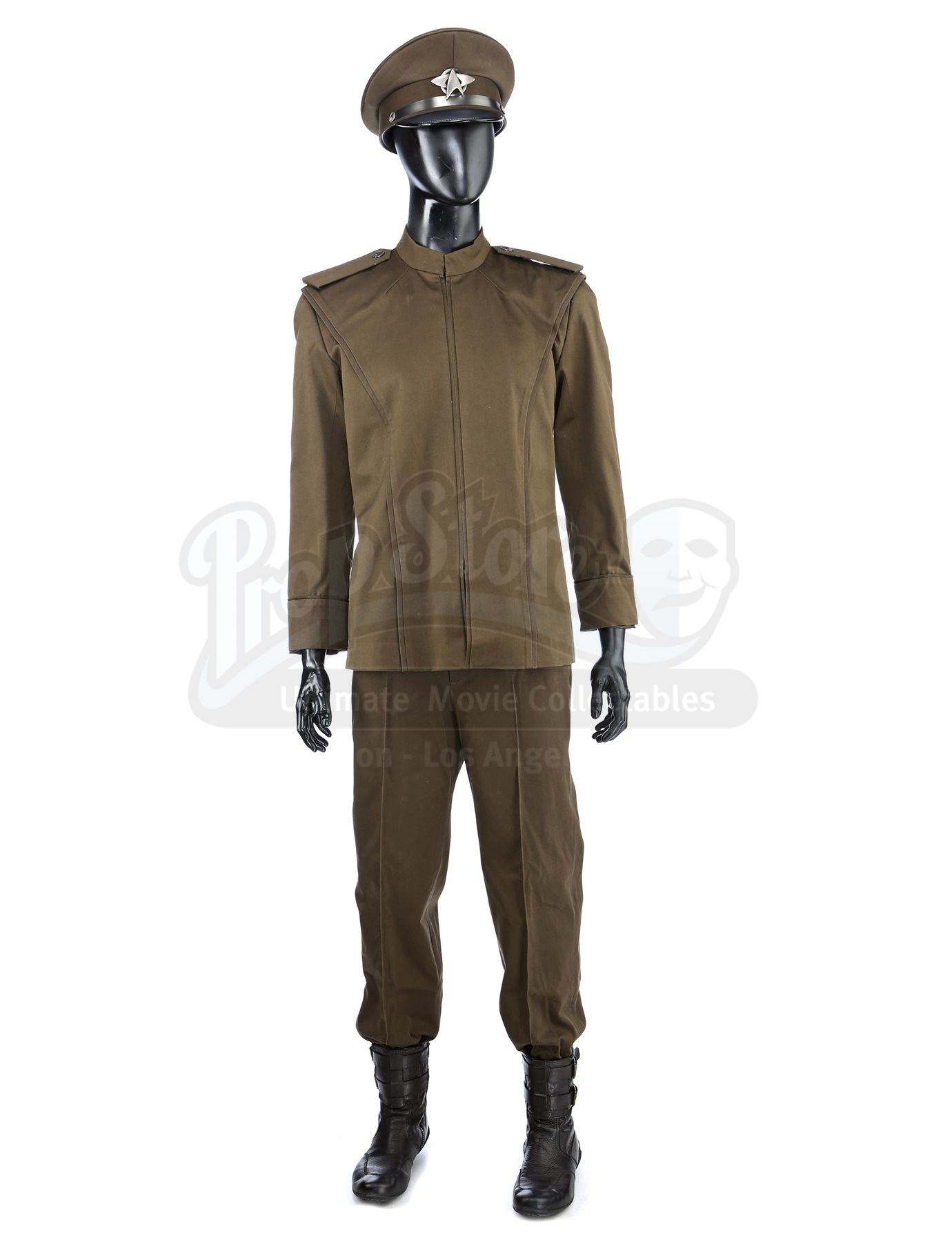 A men's Starfleet enlisted member uniform from Star Trek Into Darkness. Enlisted members of Starfleet were seen at Starfleet headquarters in San Francisco. This lot includes a military cap (size extra large), jacket (size 42), pants (size 34), and a pair of boots (size 9.5). The custom-made costume is made of olive-colored cotton. The cap features a leather brim with a metal Starfleet pin attached to the front. The jacket zips up in front and has a polyester lining. The pants feature similar construction with a zipper fly and stirrups at the heels. The ankle boots are made of leather with rubber soles. The lot shows minor wear due to production use, with the shoulder epaulets no longer attached to the jacket.Estimate: $600 - 800*Estimated sale price; sold without reserve.