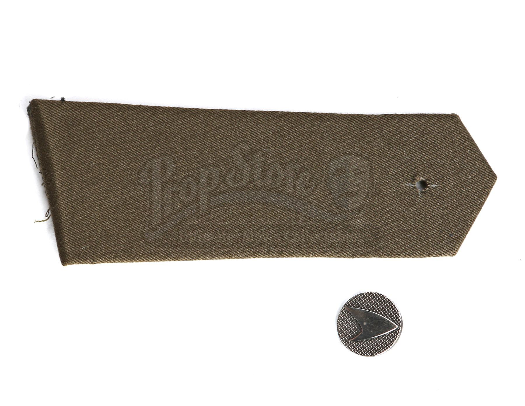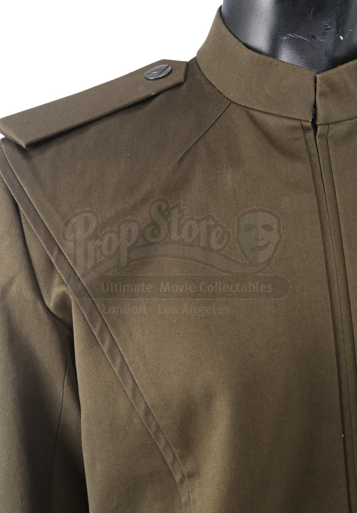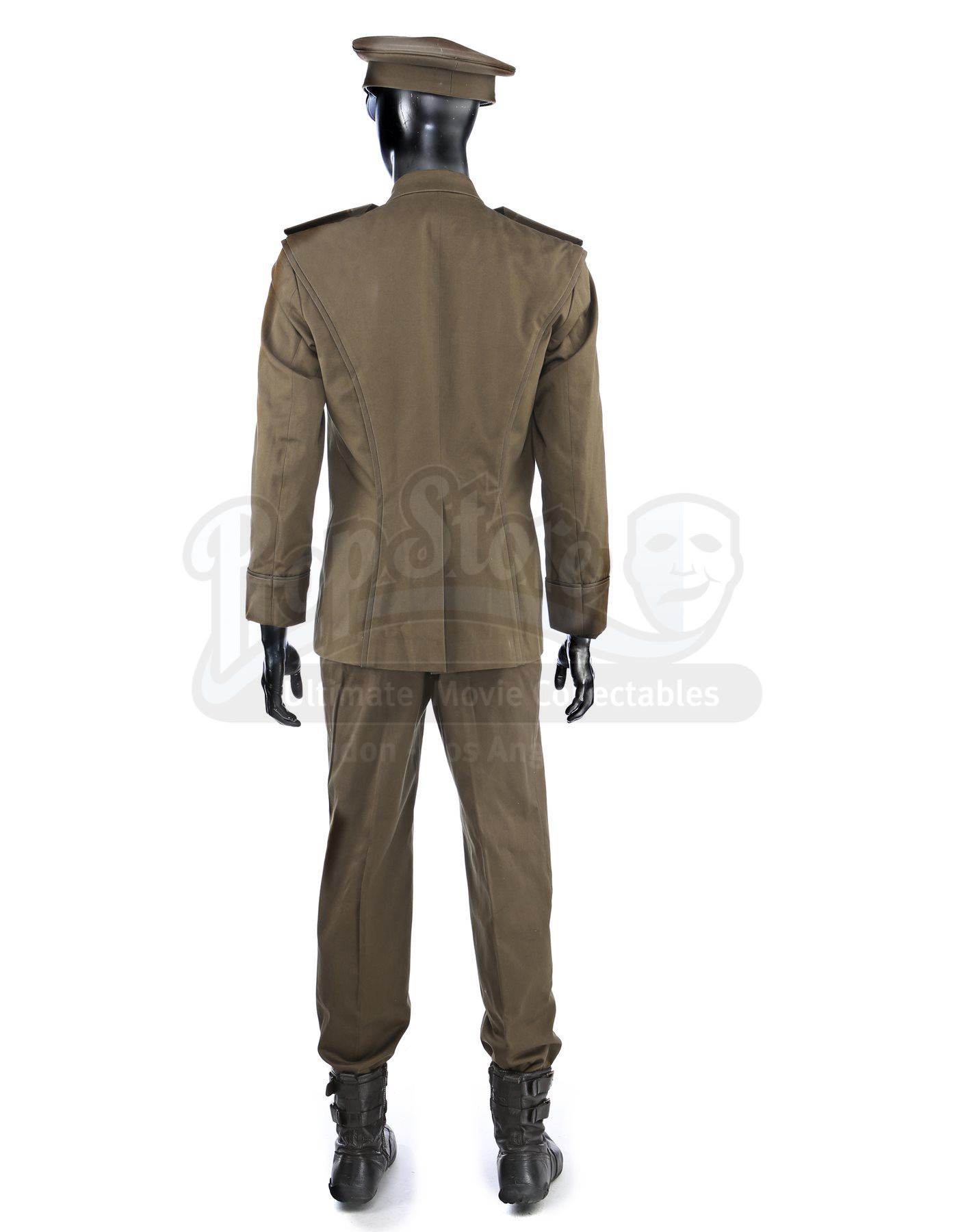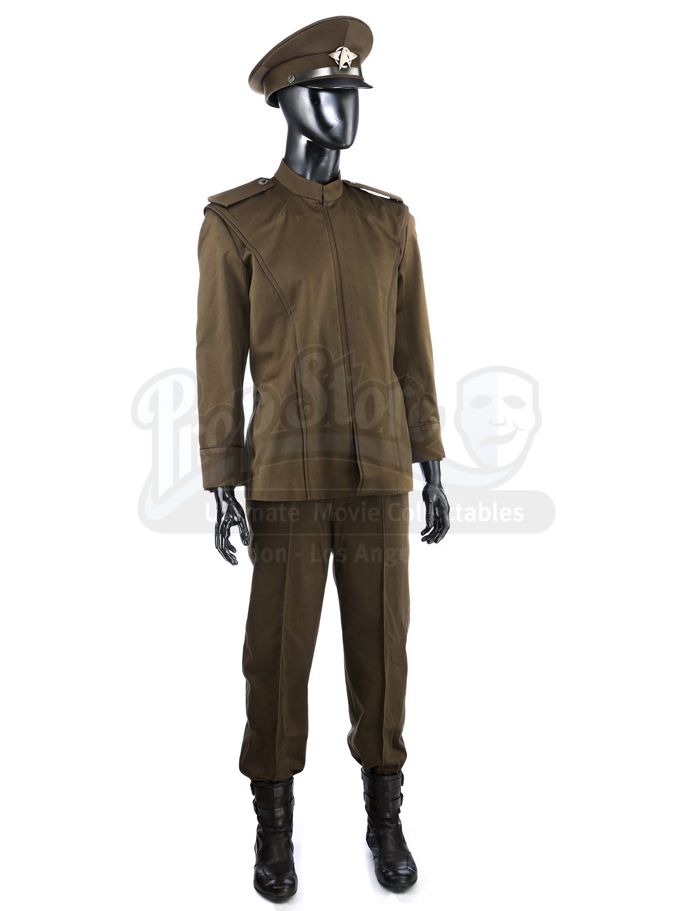 A men's Starfleet enlisted member uniform from Star Trek Into Darkness. Enlisted members of Starfleet were seen at Starfleet headquarters in San Francisco. This lot includes a military cap (size extra large), jacket (size 42), pants (size 34), and a pair of boots (size 9.5). The custom-made costume is made of olive-colored cotton. The cap features a leather brim with a metal Starfleet pin attached to the front. The jacket zips up in front and has a polyester lining. The pants feature similar construction with a zipper fly and stirrups at the heels. The ankle boots are made of leather with rubber soles. The lot shows minor wear due to production use, with the shoulder epaulets no longer attached to the jacket.Estimate: $600 - 800*Estimated sale price; sold without reserve.