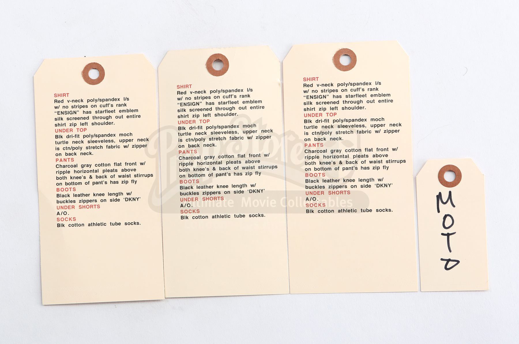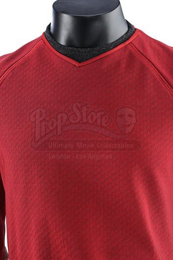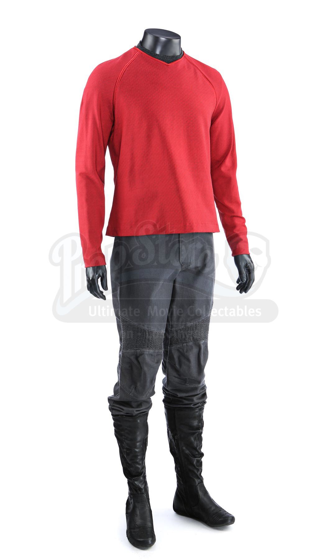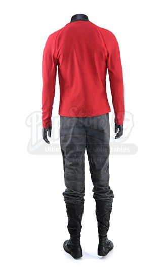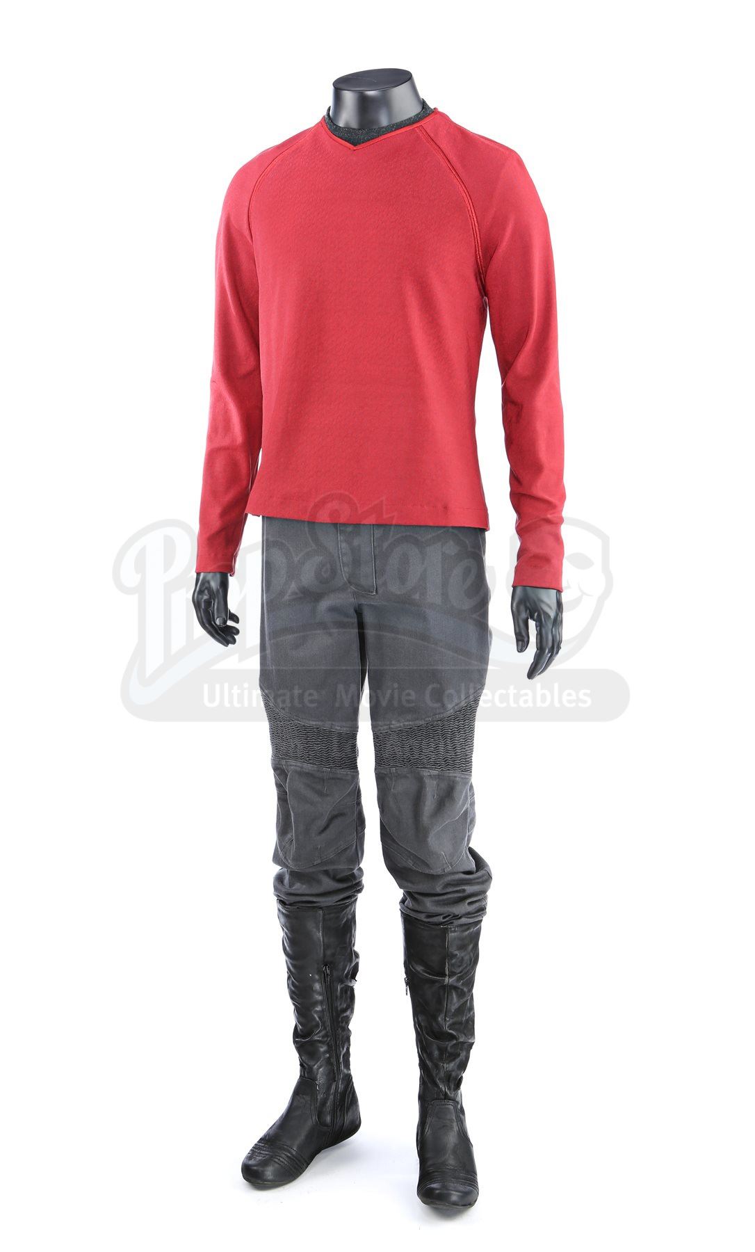 Moto's Enterprise operations uniform from Star Trek Into Darkness. Moto wore her operations uniform outside of the Enterprise holding cell. The costume includes a tunic (approximate size medium), semi-mock turtleneck undershirt (medium), pants (marked size 32), and a pair of boots (marked U.S. size 7.5). Made specifically for the sequel, the red tunic is made of Spandex and features a printed optical repeat Starfleet insignia pattern. The long-sleeved shirt has piping around the collar, two hidden zippers at the shoulders and two hidden zippers up each arm. The undershirt consists of a grey polyester collar that is stitched to the top of a modified Spandex sport shirt. The grey twill pants were made specifically for the sequel and have ribbed fabric diagonally above the knees. Also included is a pair of black suede boots with rubber soles. The boots are the proper type for the costume; they were used in the production but not specifically by this character.The costume features hand-written wardrobe labels in the tunic and pants marked as "Moto". Also included are wardrobe tags with hand-written notes about the costume.Estimate: $1000 - 1500*Estimated sale price; sold without reserve.