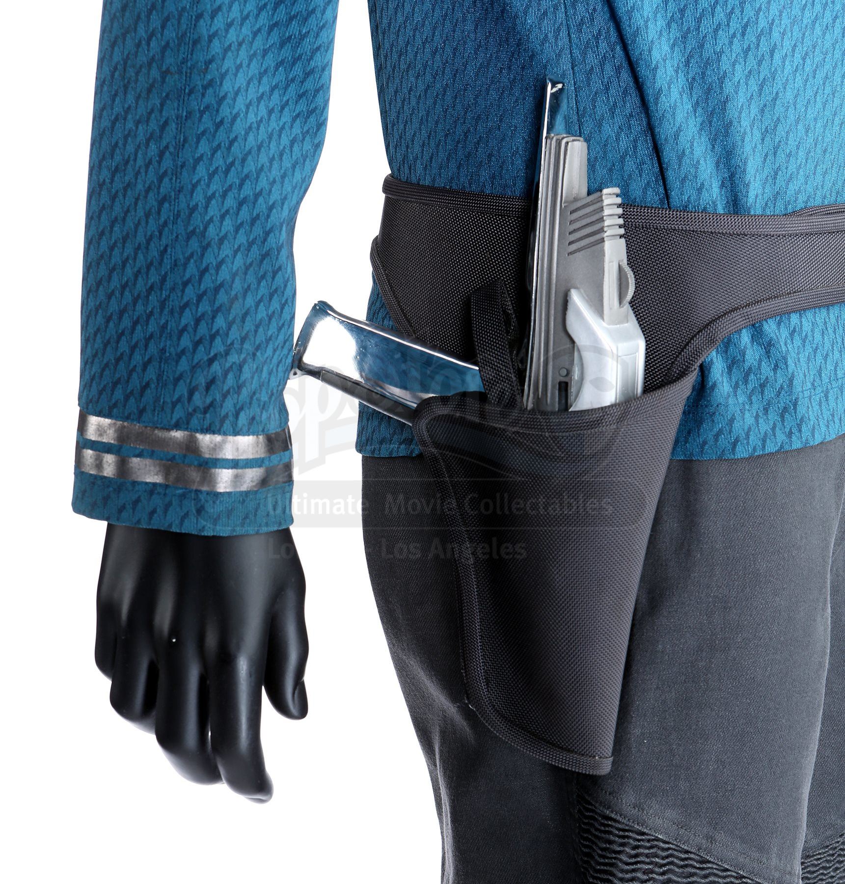 Mr. Spock's Enterprise sciences uniform with Starfleet phaser, holster belt and communicator from Star Trek Into Darkness. Spock wore his Enterprise sciences uniform during numerous scenes throughout the film. The costume includes a tunic (approximate size large), semi-mock turtleneck undershirt (small), pants (marked size 34), a phaser, holster belt, static communicator, and a pair of boots (marked U.S. size 11).