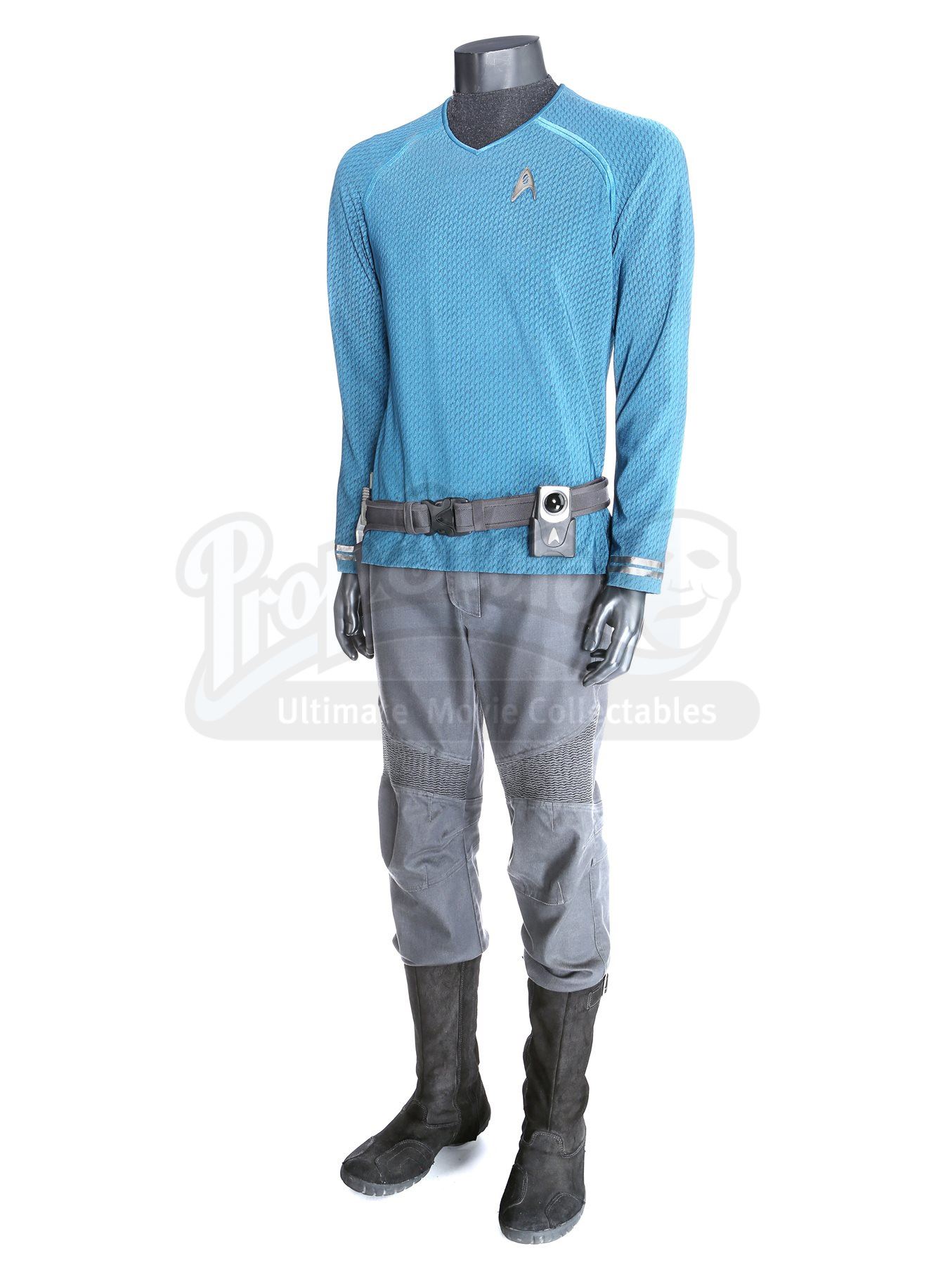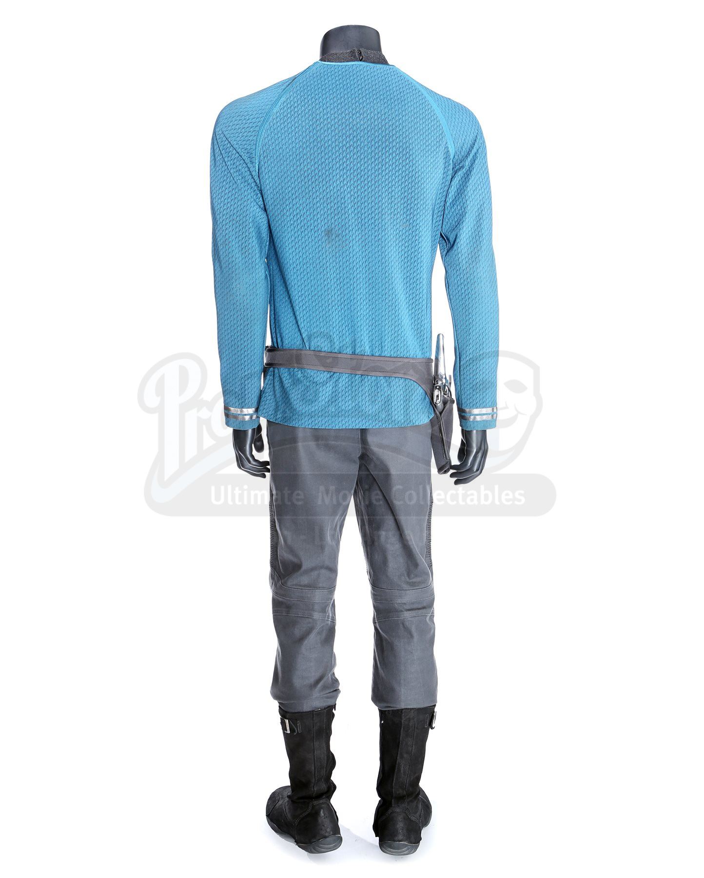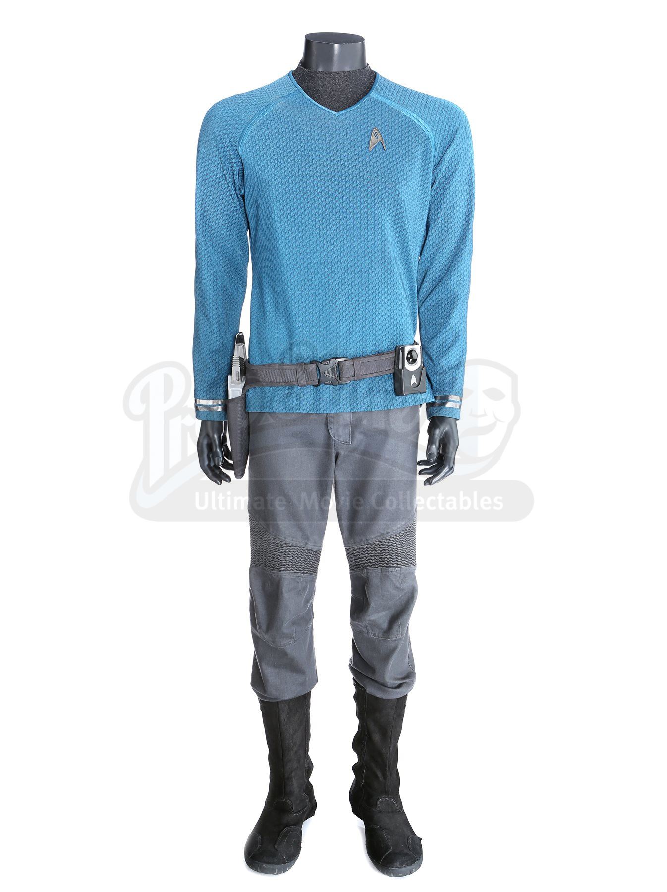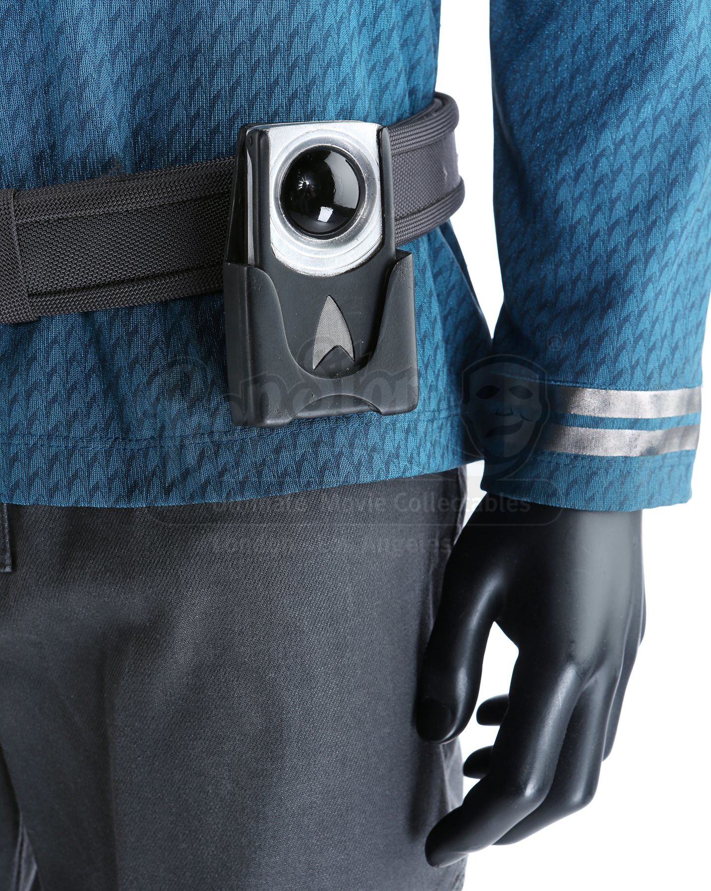 Mr. Spock's Enterprise sciences uniform with Starfleet phaser, holster belt and communicator from Star Trek Into Darkness. Spock wore his Enterprise sciences uniform during numerous scenes throughout the film. The costume includes a tunic (approximate size large), semi-mock turtleneck undershirt (small), pants (marked size 34), a phaser, holster belt, static communicator, and a pair of boots (marked U.S. size 11). Made specifically for the sequel, the blue tunic is made of Spandex and features a printed optical repeat Starfleet insignia pattern. The long-sleeved shirt has piping around the collar, a hidden zipper at the left shoulder, two silver bands on the wrists, and a metal Starfleet sciences insignia (made for the sequel) on the left breast. The undershirt consists of a black polyester collar that is stitched to the top of a modified Spandex sport shirt. The grey twill pants were made specifically for the sequel and have ribbed fabric diagonally above the knees. The phaser is made of resin with the handle painted chrome and includes a rotating emitter at the front of the device, which can be rotated by hand to display either "kill" or "stun" commands. The phaser is secured to a black nylon holster belt which also features a static communicator made of dense foam and painted black and silver. Also included is pair of black suede boots with rubber soles. The undershirt, boots, insignia, phaser, holster belt and communicator are the proper type for the costume; they were used in the production but not specifically by this character. The costume features hand-written wardrobe labels with the tunic marked as "Spock," the undershirt labeled with the name of the stunt actor, and the pants marked "Spock Stunt Harness". Also included are wardrobe tags with hand-written notes about the costume. Estimate: $8000 - 12000*Estimated sale price; sold without reserve.