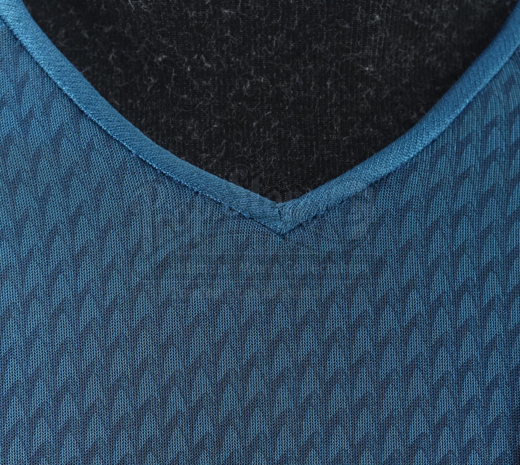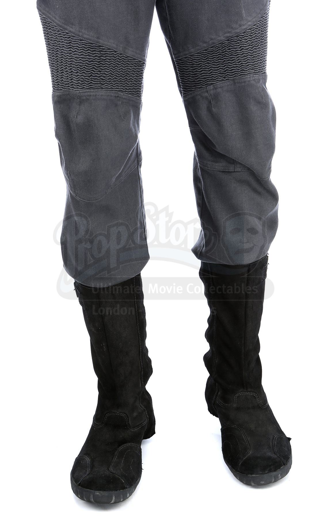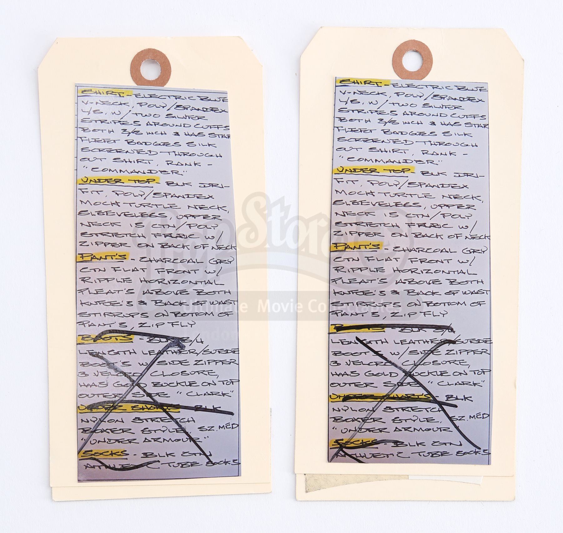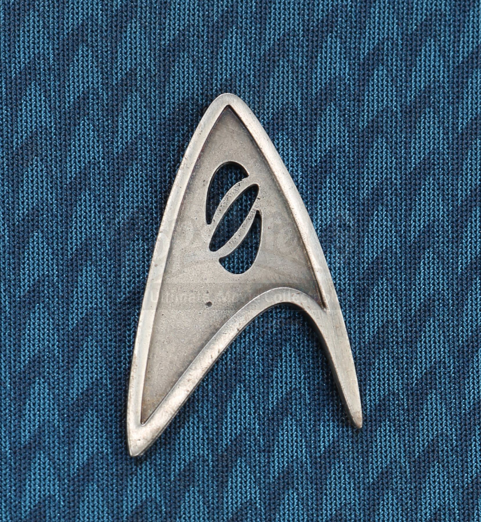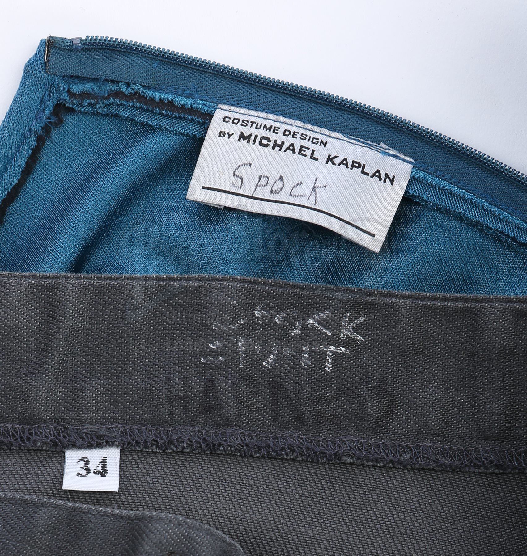Mr. Spock's Enterprise sciences uniform with Starfleet phaser, holster belt and communicator from Star Trek Into Darkness. Spock wore his Enterprise sciences uniform during numerous scenes throughout the film. The costume includes a tunic (approximate size large), semi-mock turtleneck undershirt (small), pants (marked size 34), a phaser, holster belt, static communicator, and a pair of boots (marked U.S. size 11). Made specifically for the sequel, the blue tunic is made of Spandex and features a printed optical repeat Starfleet insignia pattern. The long-sleeved shirt has piping around the collar, a hidden zipper at the left shoulder, two silver bands on the wrists, and a metal Starfleet sciences insignia (made for the sequel) on the left breast. The undershirt consists of a black polyester collar that is stitched to the top of a modified Spandex sport shirt. The grey twill pants were made specifically for the sequel and have ribbed fabric diagonally above the knees. The phaser is made of resin with the handle painted chrome and includes a rotating emitter at the front of the device, which can be rotated by hand to display either "kill" or "stun" commands. The phaser is secured to a black nylon holster belt which also features a static communicator made of dense foam and painted black and silver. Also included is pair of black suede boots with rubber soles. The undershirt, boots, insignia, phaser, holster belt and communicator are the proper type for the costume; they were used in the production but not specifically by this character. The costume features hand-written wardrobe labels with the tunic marked as "Spock," the undershirt labeled with the name of the stunt actor, and the pants marked "Spock Stunt Harness". Also included are wardrobe tags with hand-written notes about the costume. Estimate: $8000 - 12000*Estimated sale price; sold without reserve.