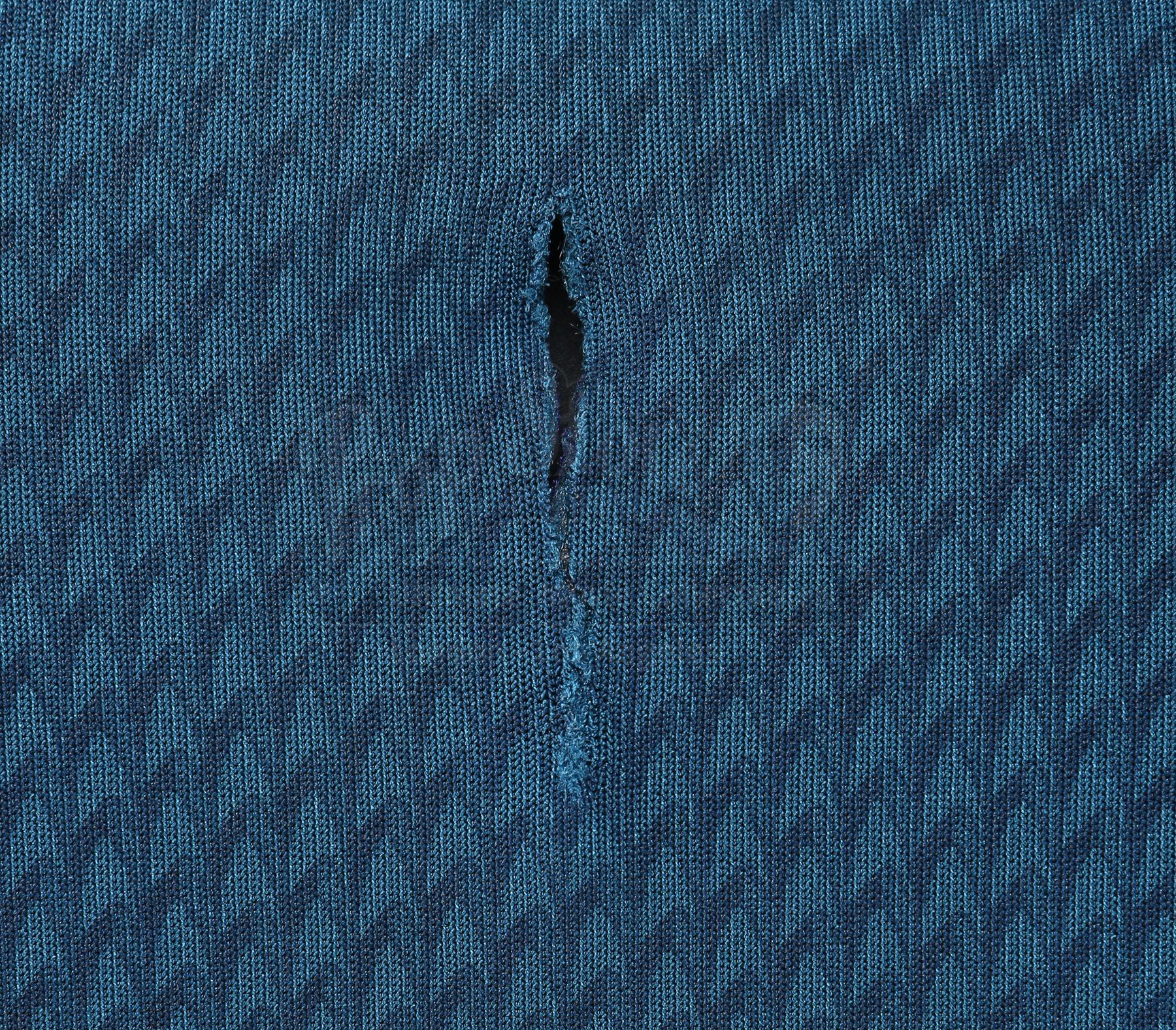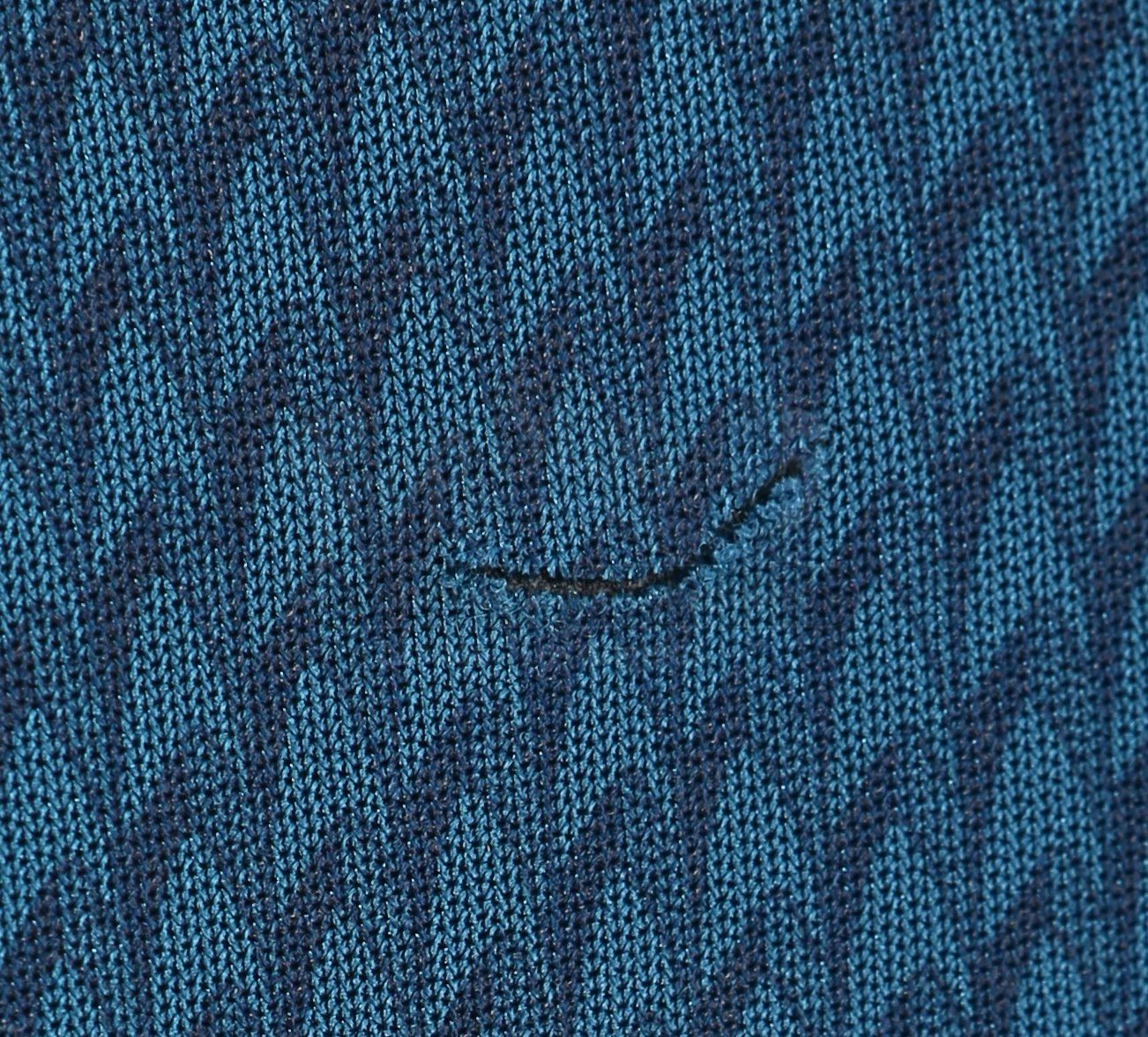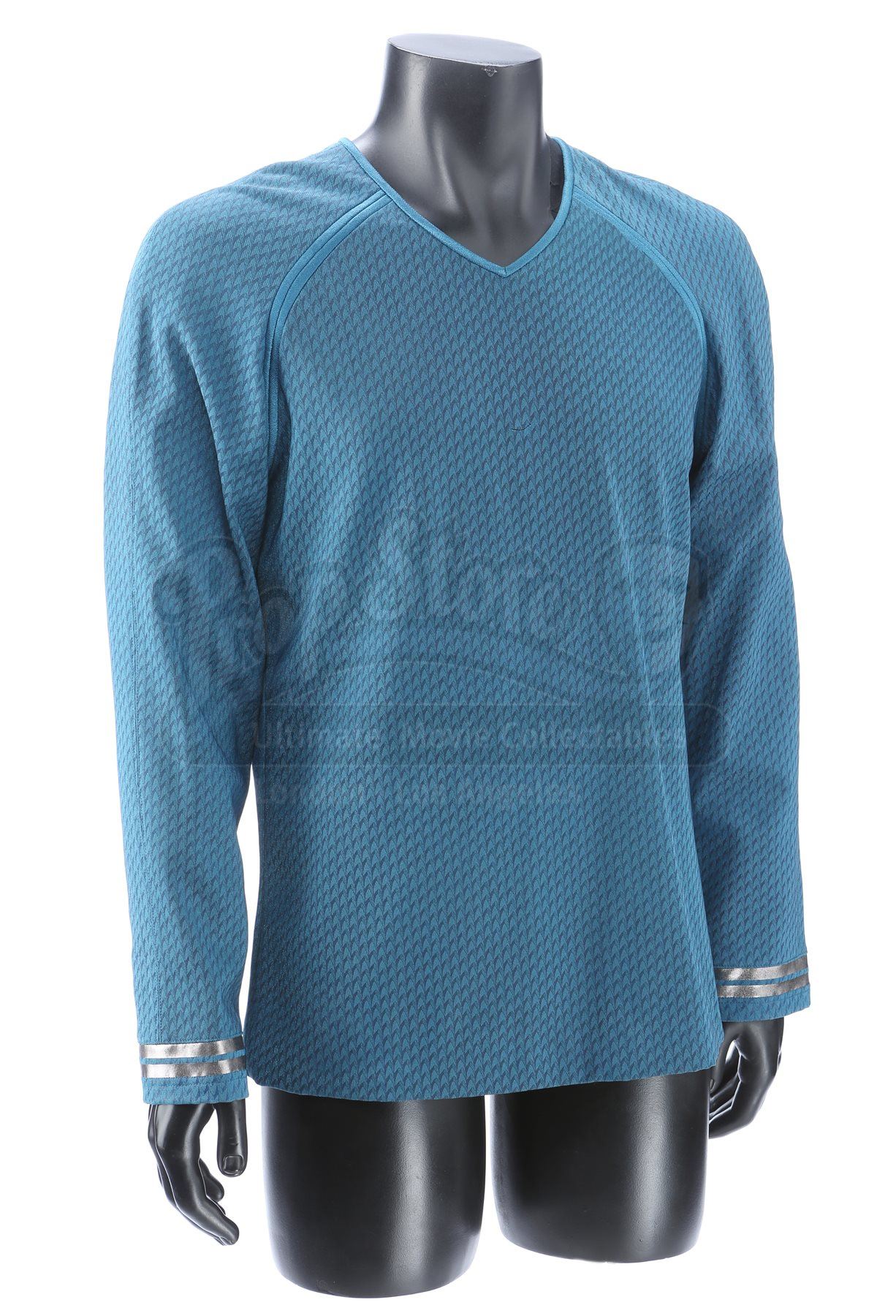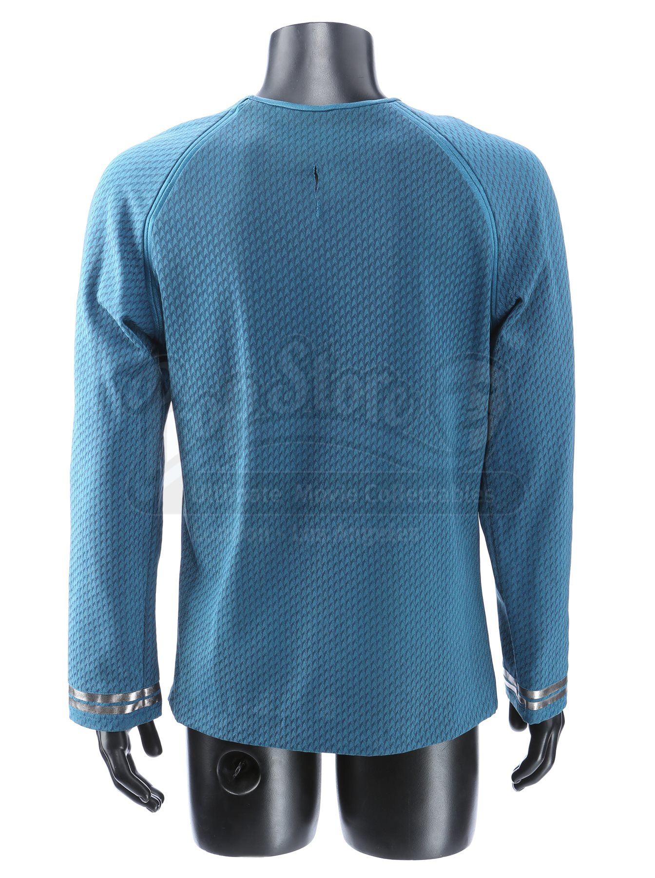 Made specifically for this sequel, the blue tunic (approximate size large) is made of Spandex and features a printed optical repeat Starfleet insignia pattern. The long-sleeved shirt has piping around the collar, a hidden zipper at the left shoulder and two silver bands on the wrists. The shirt features a back slit, likely used during a stunt sequence, which allowed cables to connect to a stunt harness.