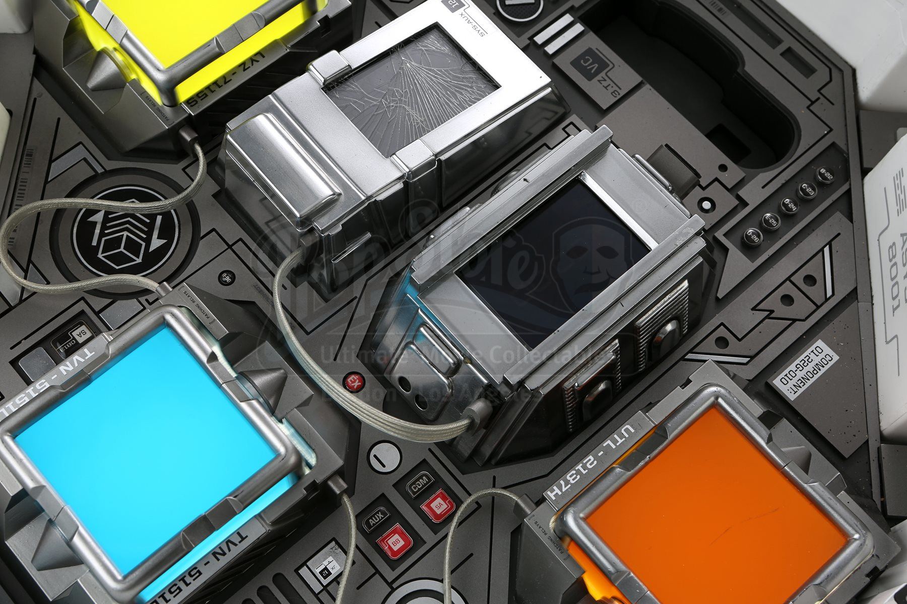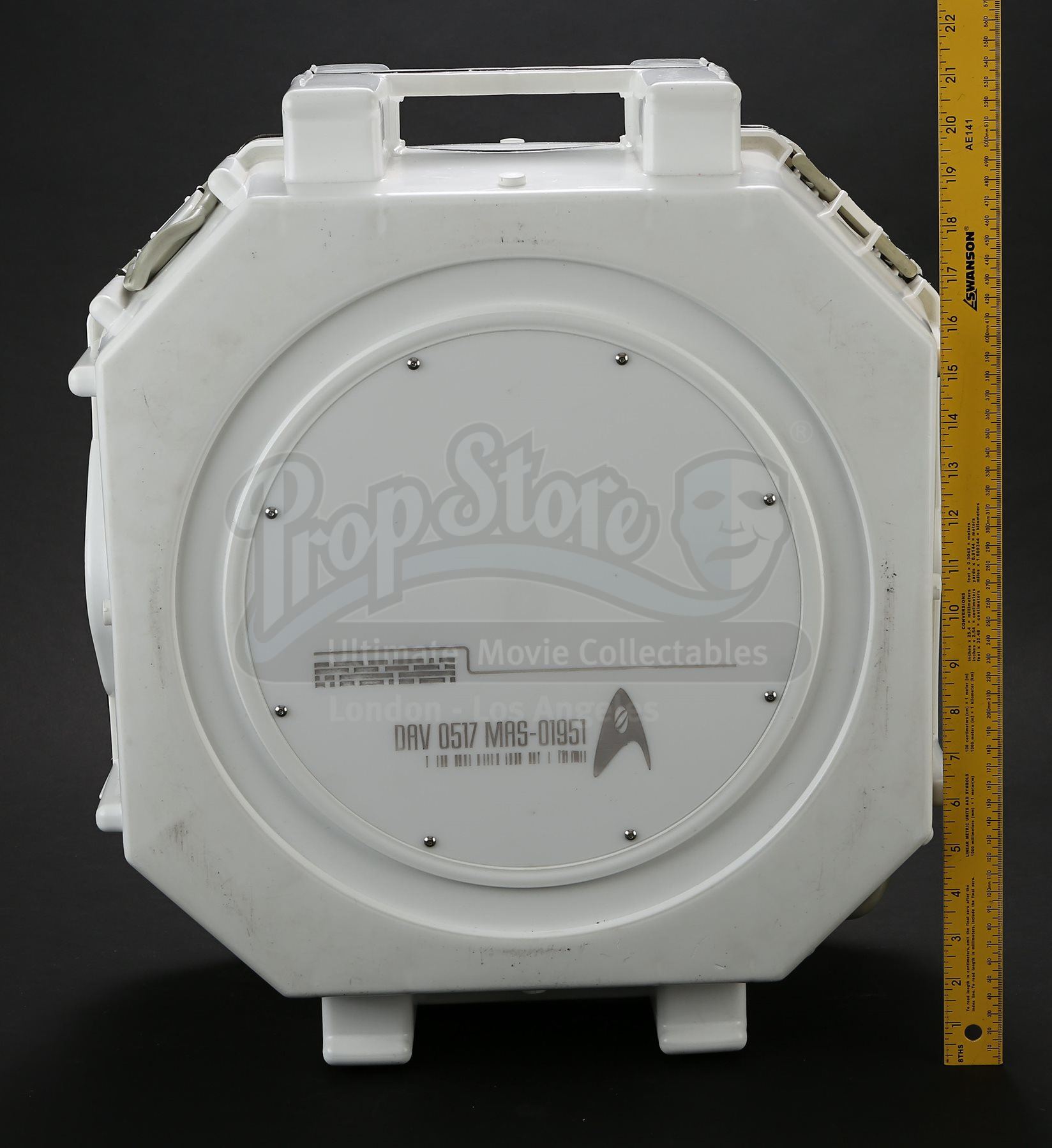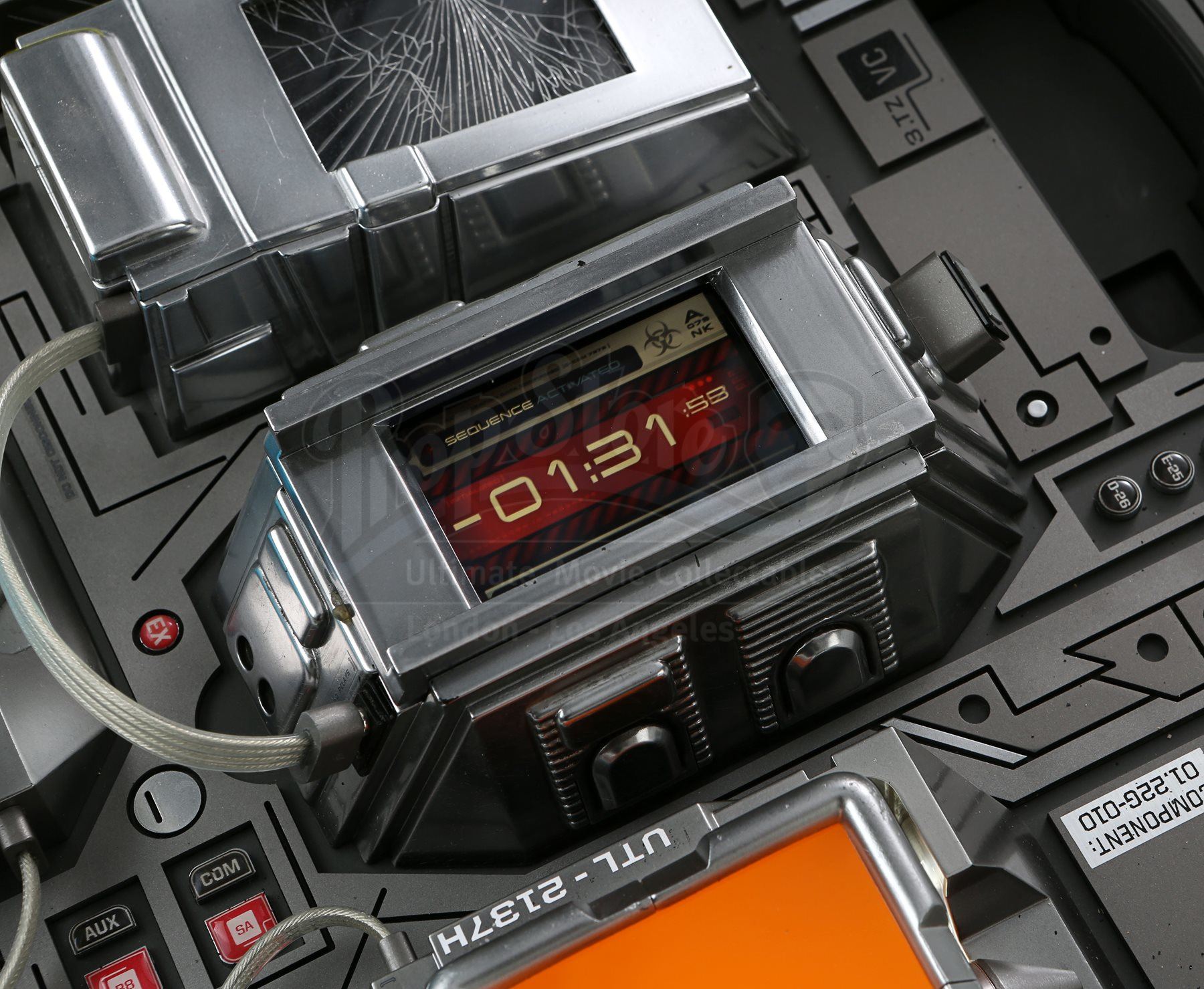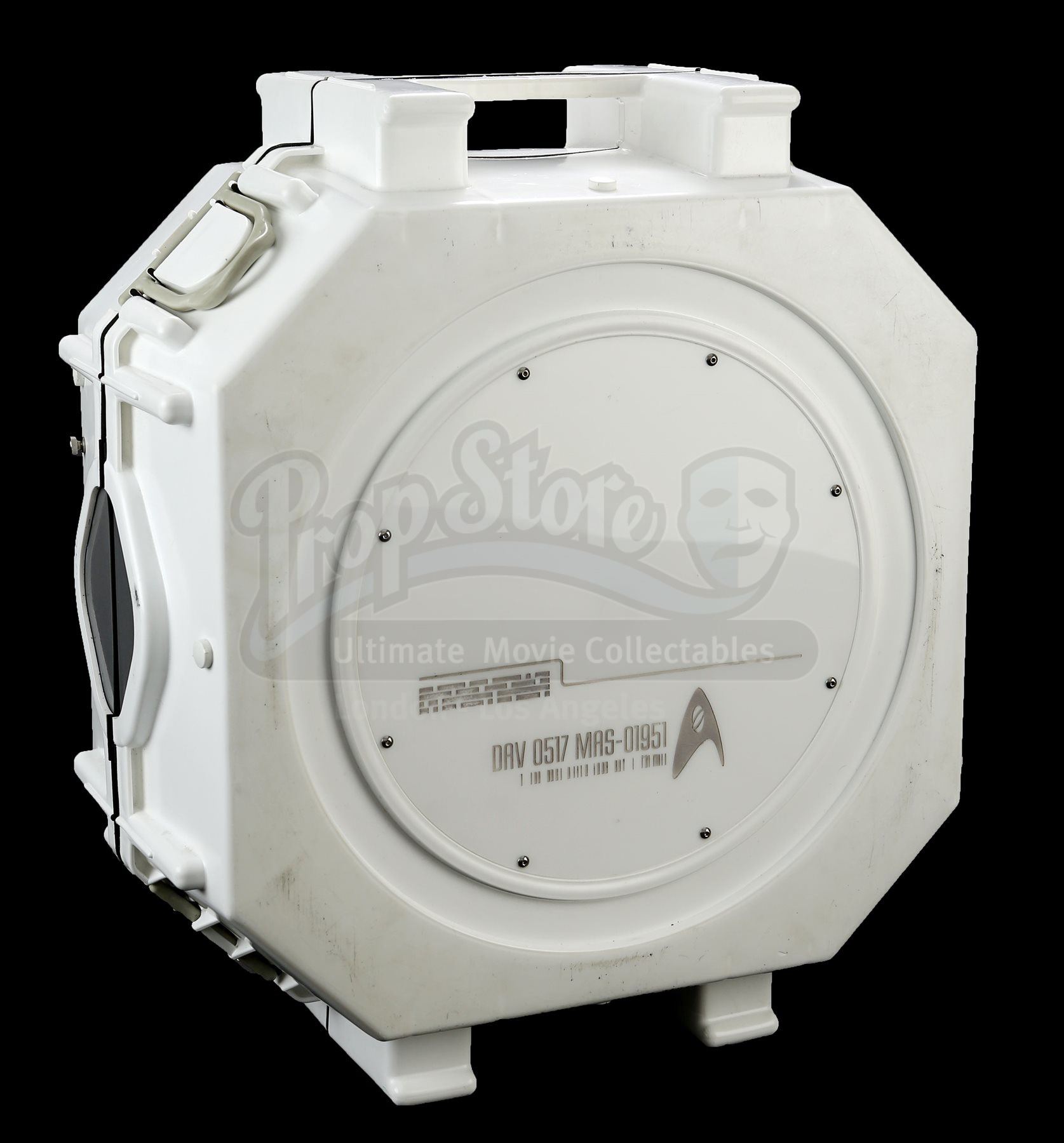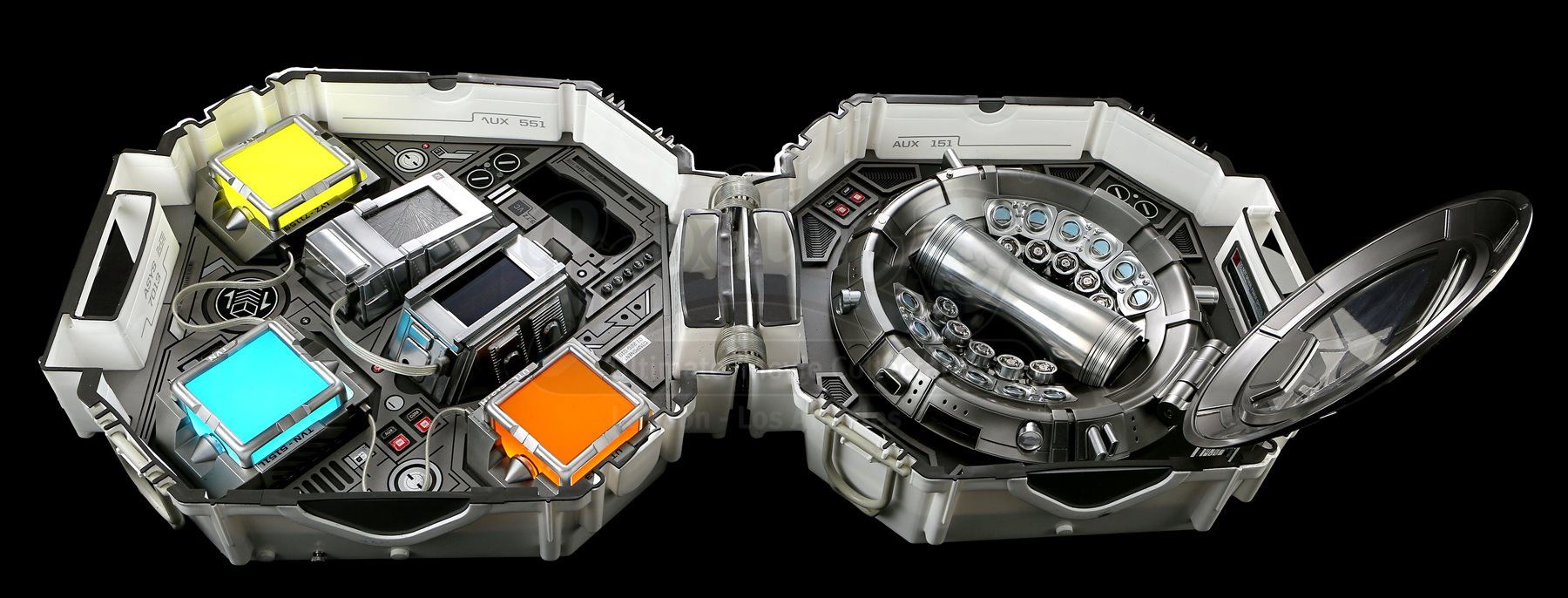 Mr. Spock's light-up cold fusion device and accessories from Star Trek Into Darkness. Spock rigged a cold fusion explosive device to detonate within an erupting volcano on the M-class planet Nibiru. The intricate electronic prop features a hard plastic shell with engraved Starfleet labeling that opens like a suitcase to reveal a futuristic cold fusion apparatus inside. The interior is largely made of resin, with static buttons, wires and numerous sticker labels. One side of the device features a circular storage container with a flip-up lid that houses a removable steel canister. The other side of the device features three resin cubes that fit within square slots over an LED floor panel that illuminates when the prop is plugged in with an AC adaptor. Also outfitted inside are platforms to support a tricorder and a production-modified mp3 and video player that includes two custom applications. The mp3 player applications include a bomb arming sequence that responds to the user's touch and a second application that serves as a timer. Additionally, this lot includes a power control box that connects to the prop, spare trim, wires, and screens. The prop shows some wear due to production use with some of the interior trim no longer firmly attached within the case; however, the prop remains otherwise in good condition. Dimensions: 21" x 18" x 17" (53 cm x 46 cm x 43 cm)