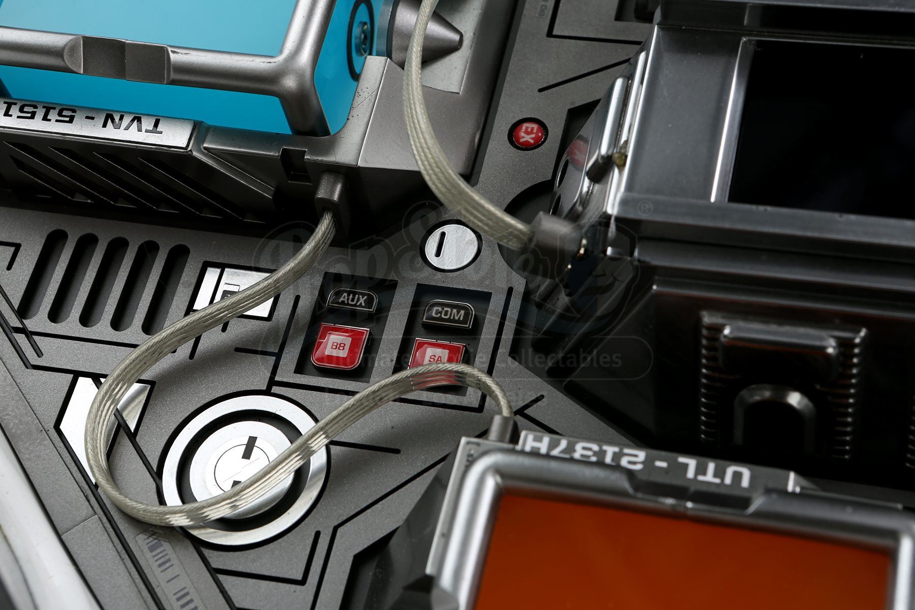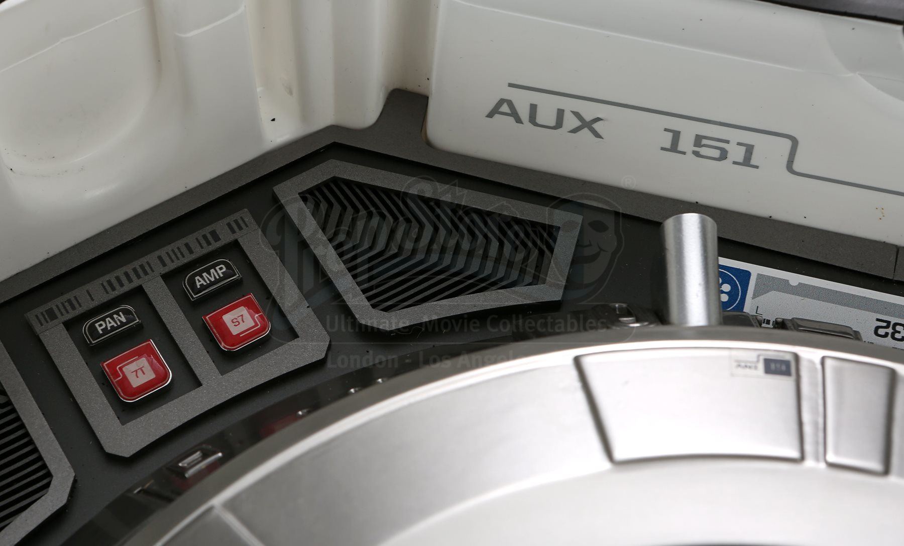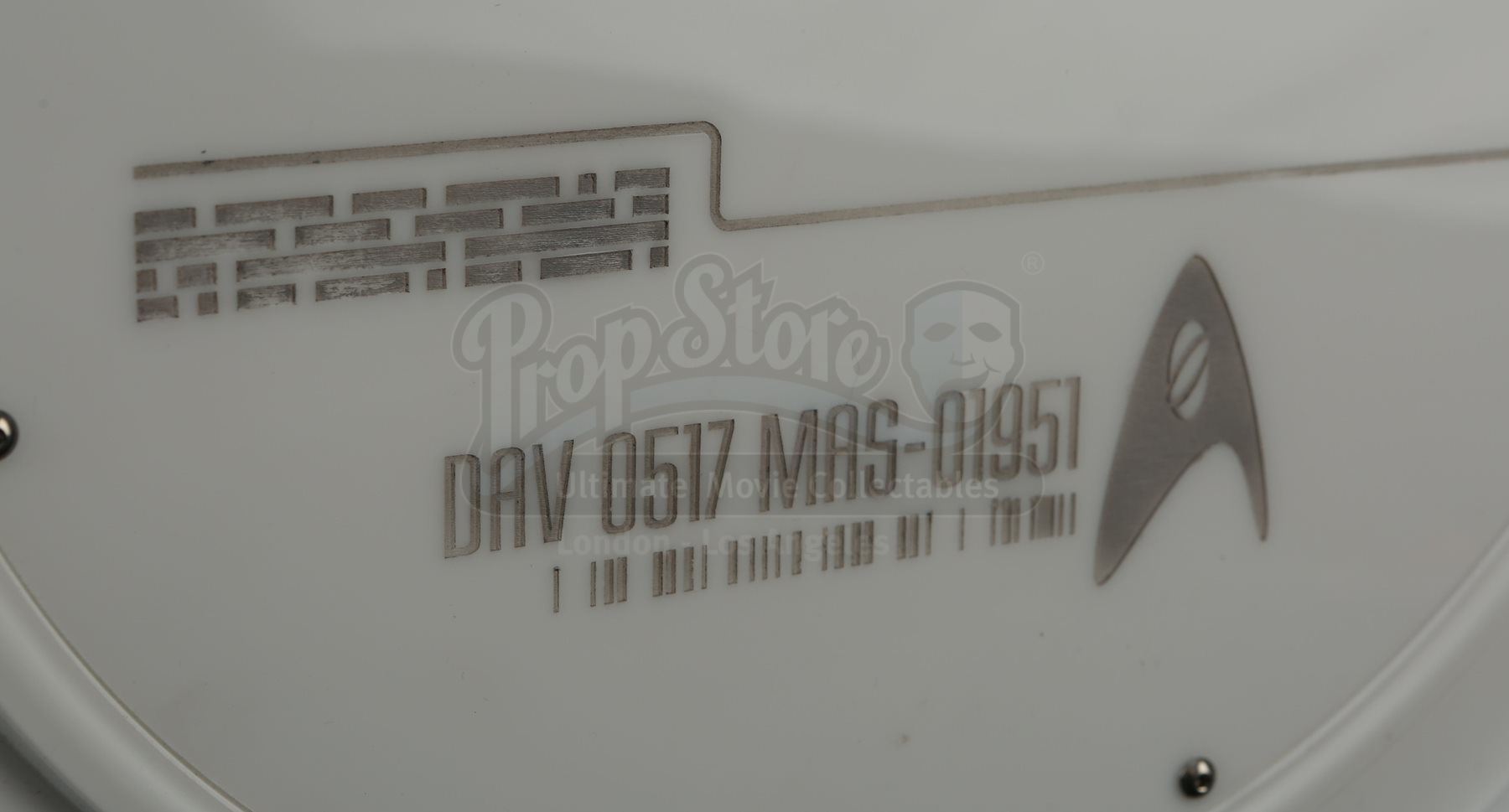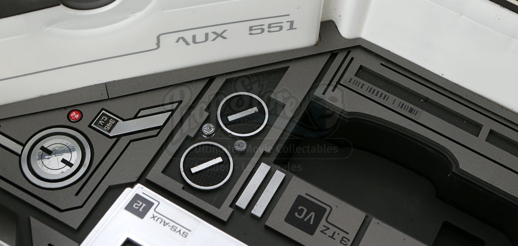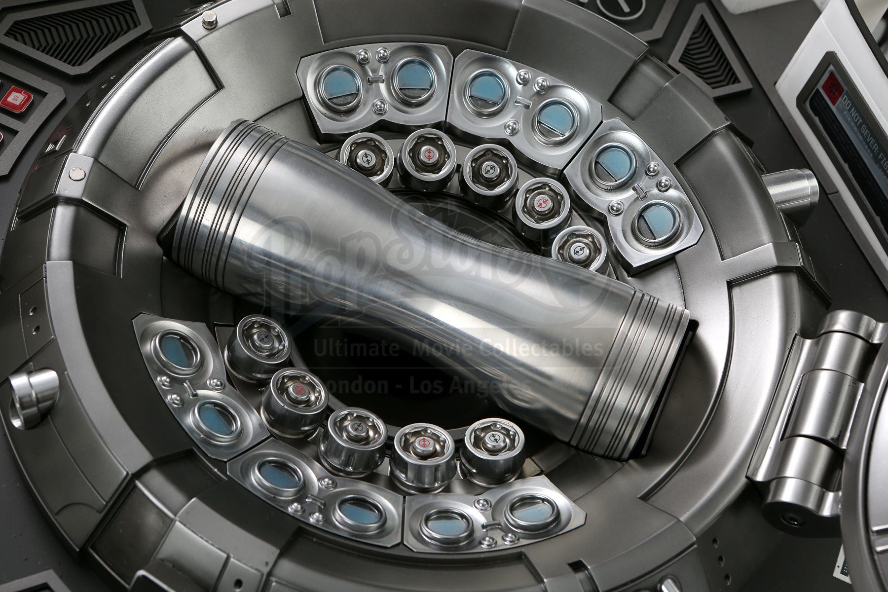 Mr. Spock's light-up cold fusion device and accessories from Star Trek Into Darkness. Spock rigged a cold fusion explosive device to detonate within an erupting volcano on the M-class planet Nibiru. The intricate electronic prop features a hard plastic shell with engraved Starfleet labeling that opens like a suitcase to reveal a futuristic cold fusion apparatus inside. The interior is largely made of resin, with static buttons, wires and numerous sticker labels. One side of the device features a circular storage container with a flip-up lid that houses a removable steel canister. The other side of the device features three resin cubes that fit within square slots over an LED floor panel that illuminates when the prop is plugged in with an AC adaptor. Also outfitted inside are platforms to support a tricorder and a production-modified mp3 and video player that includes two custom applications. The mp3 player applications include a bomb arming sequence that responds to the user's touch and a second application that serves as a timer. Additionally, this lot includes a power control box that connects to the prop, spare trim, wires, and screens. The prop shows some wear due to production use with some of the interior trim no longer firmly attached within the case; however, the prop remains otherwise in good condition. Dimensions: 21" x 18" x 17" (53 cm x 46 cm x 43 cm)