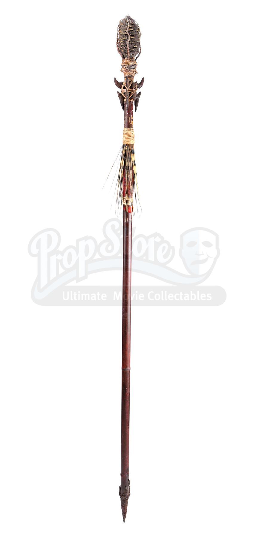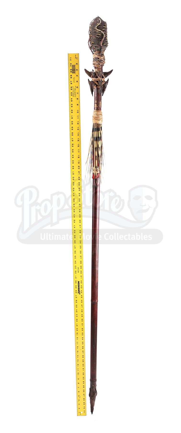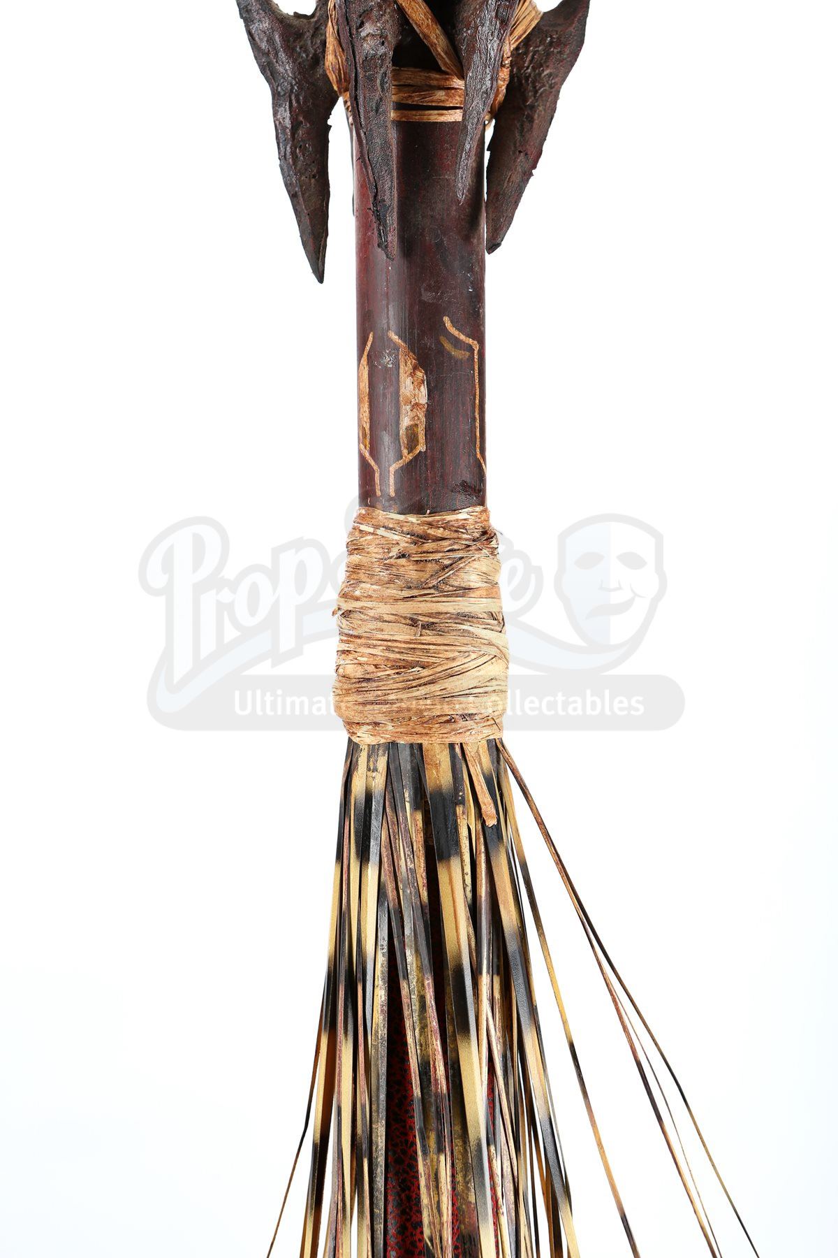 The staff is made of resin with both urethane and resin rock tips glued in place and bound with twine. Tied beneath the staff head are dozens of strands of fletching. Dimensions: 78" x 4 ½" x 5" (198 cm x 11 cm x 13 cm)