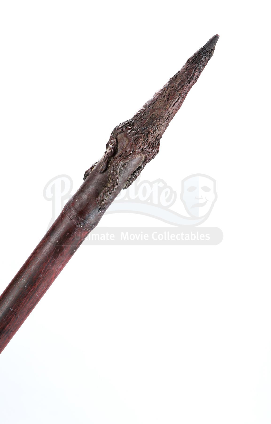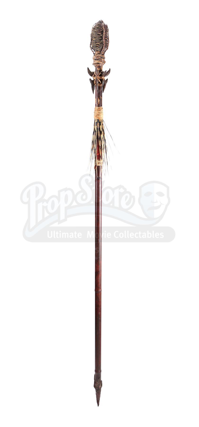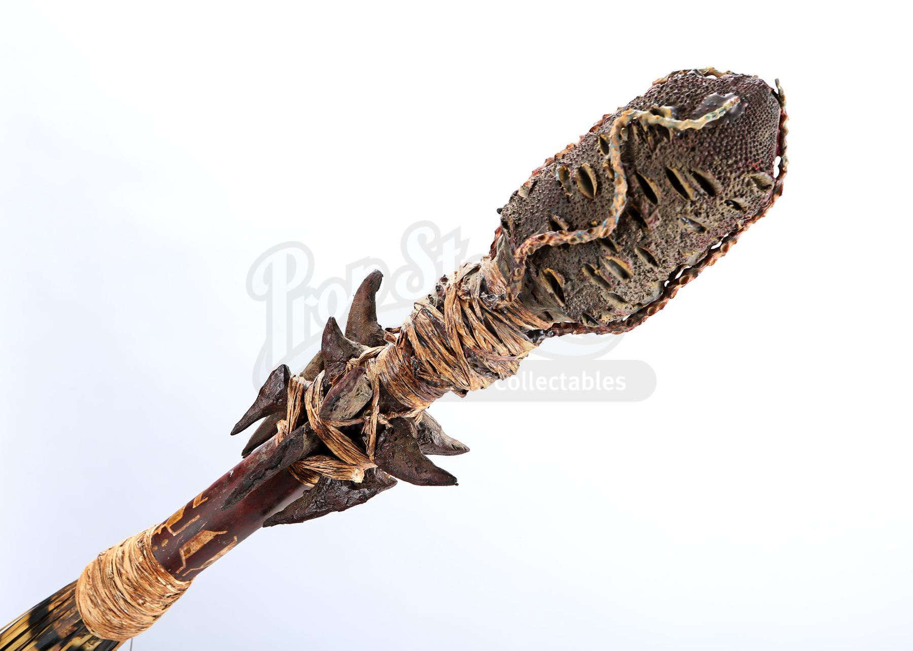 The staff is made of resin with both urethane and resin rock tips glued in place and bound with twine. Tied beneath the staff head are dozens of strands of fletching. Dimensions: 78" x 4 ½" x 5" (198 cm x 11 cm x 13 cm)