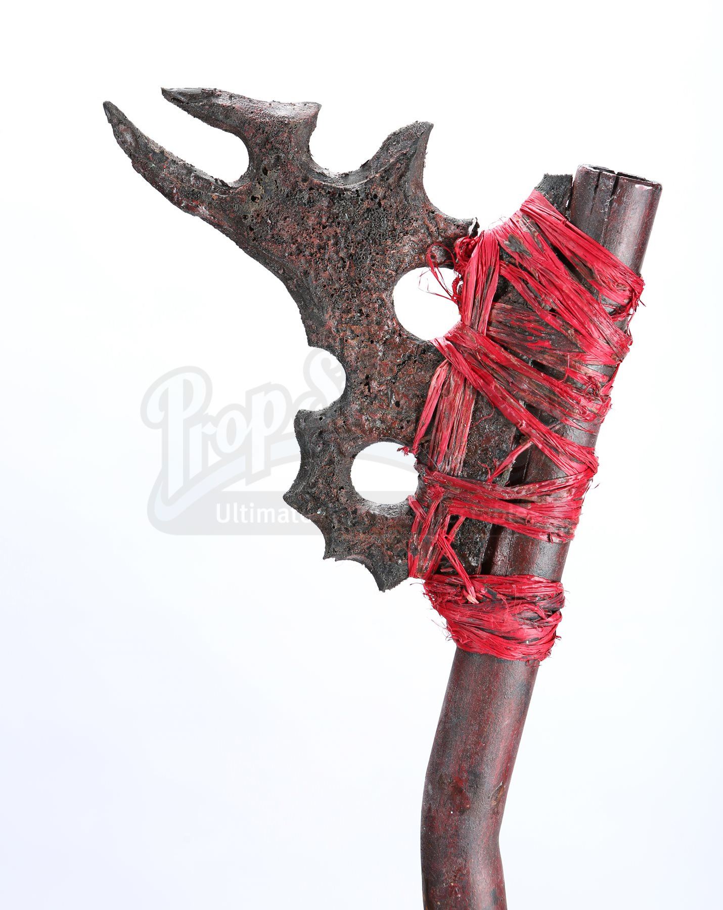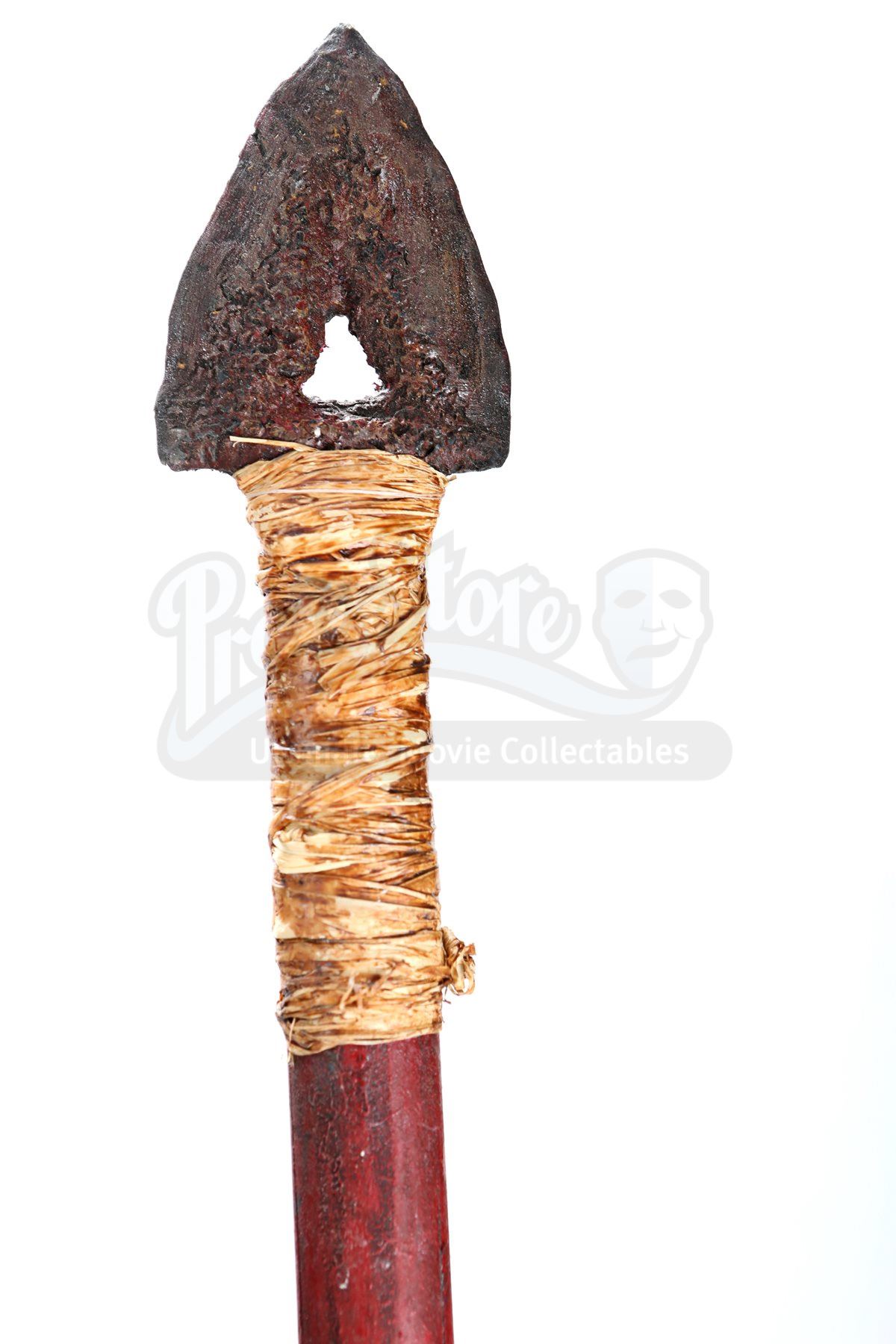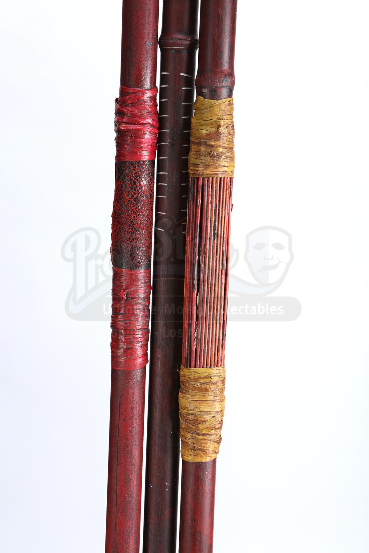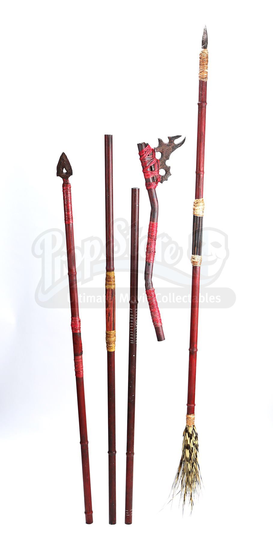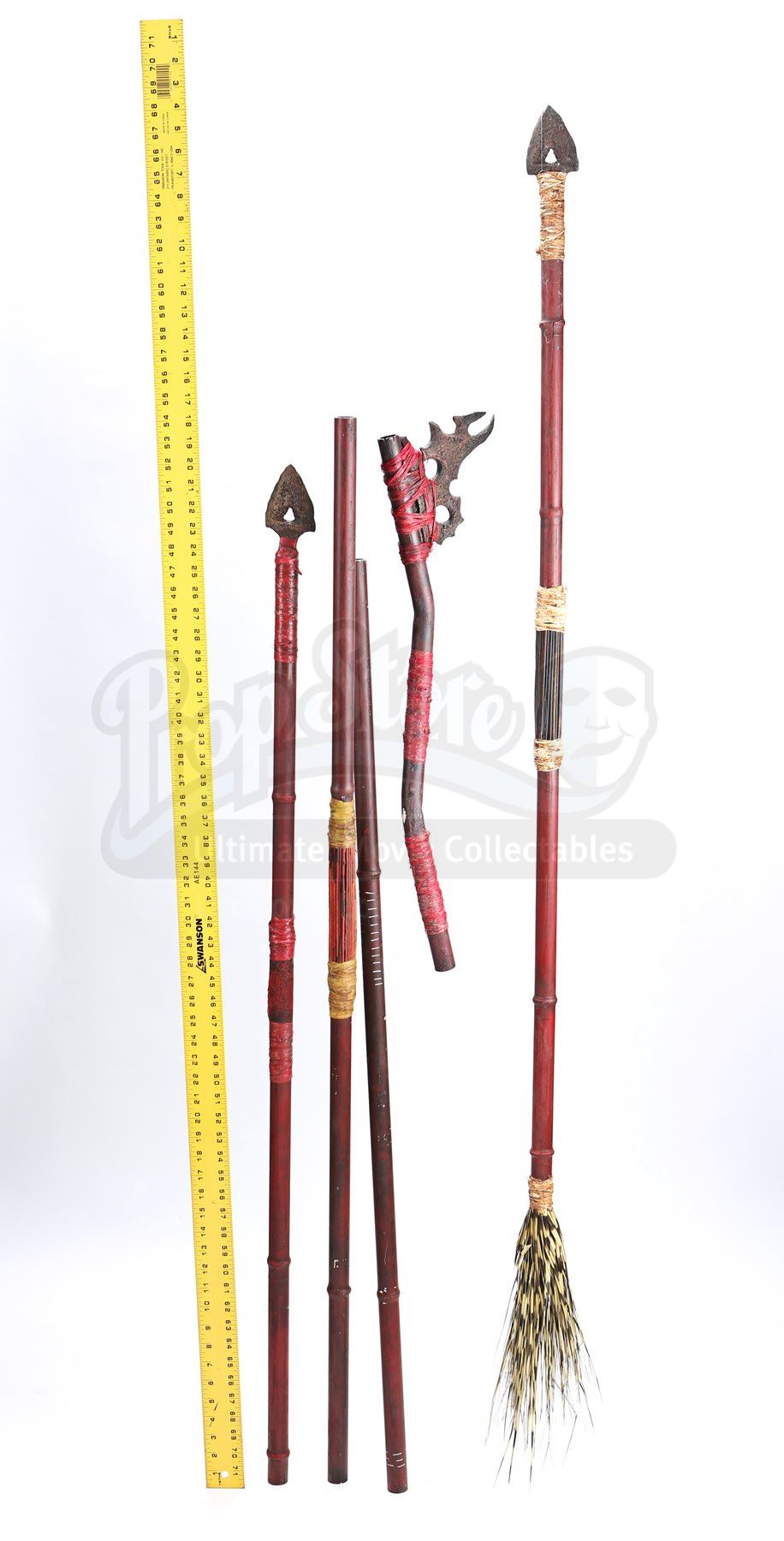A Nibiran prop weapon assortment from Star Trek Into Darkness. Nibirans threw spears at Captain Kirk and Dr. 'Bones' McCoy as they pursued them through the jungle. The lot includes two spears, two staffs and a makeshift axe. The prop weapons are made of resin with cords tied around the grips and beneath the arrowheads. The two spears and the axe include soft urethane blade tips for stunt purposes. Dimensions: 67" x 6 ½" x 3" (170 cm x 16.5 cm x 8 cm)Estimate: $800 - 1000*Estimated sale price; sold without reserve.
