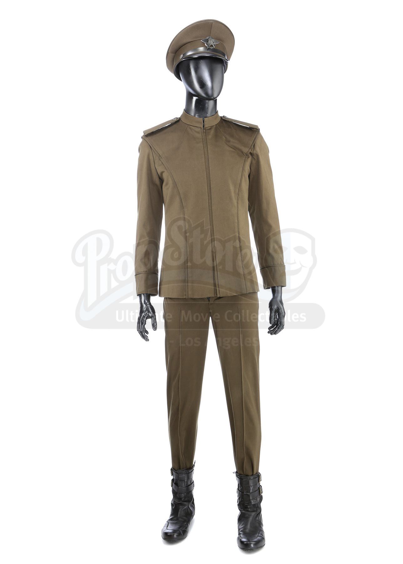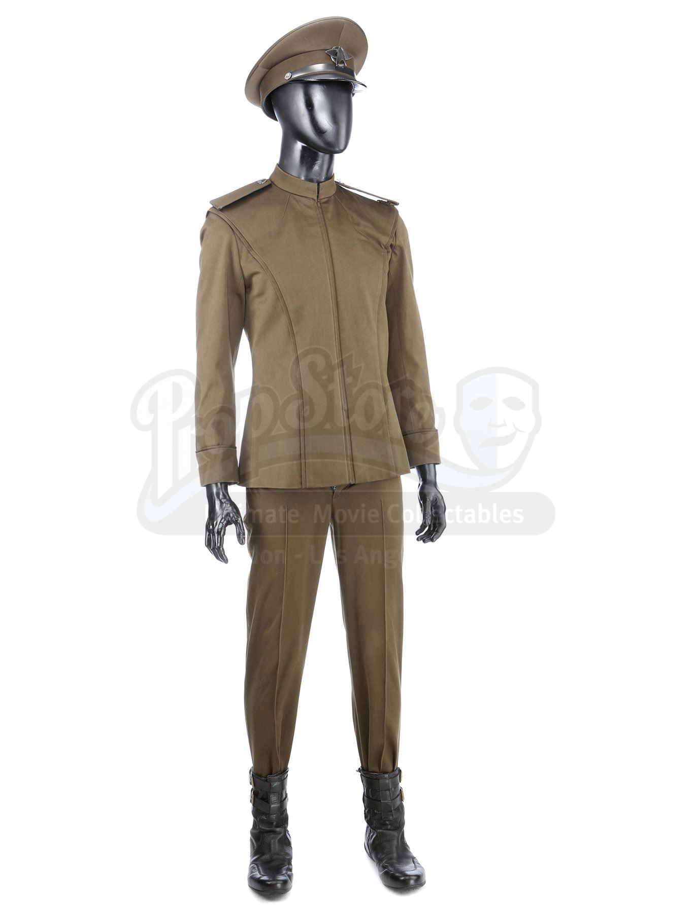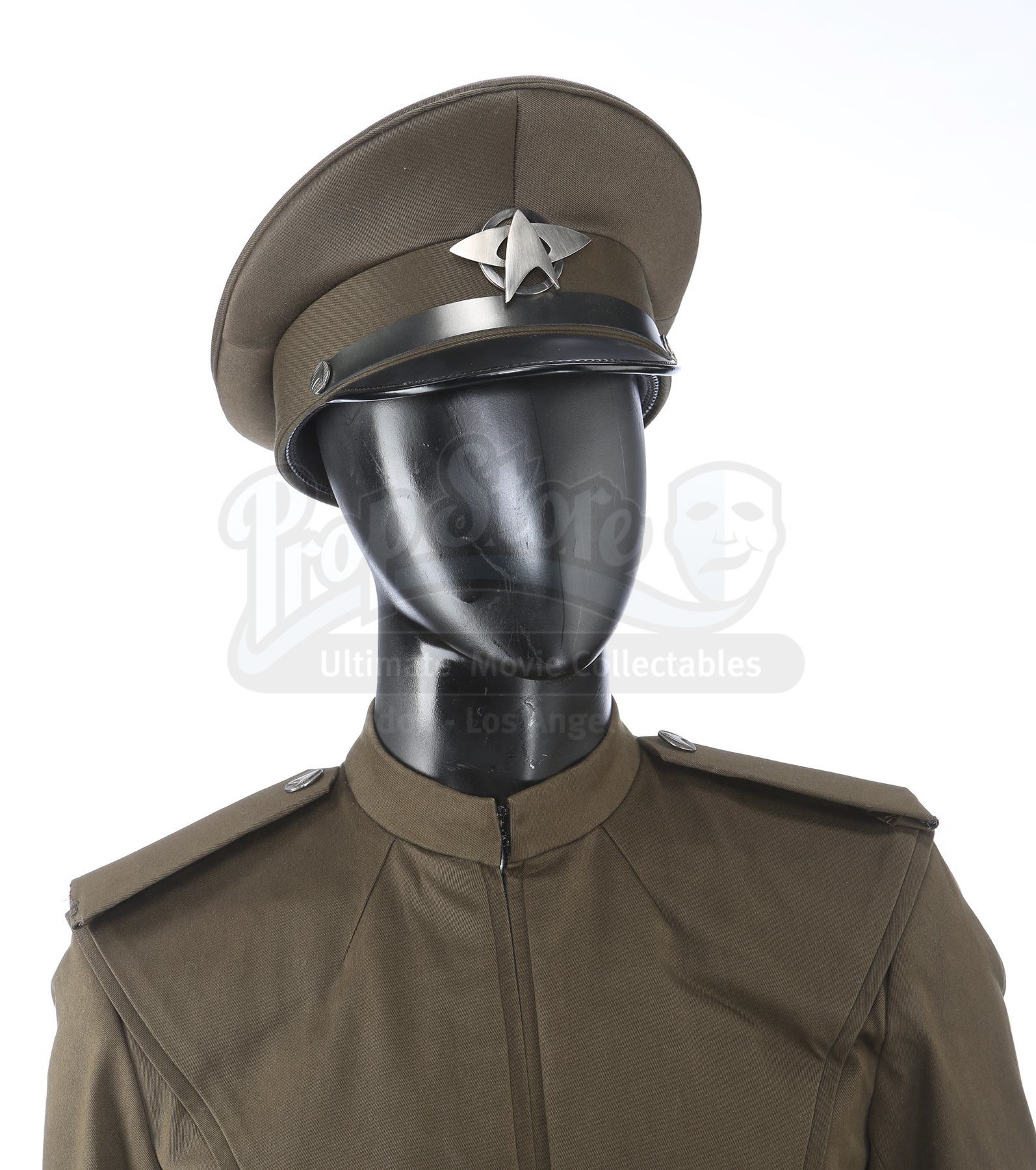 The military caps (one size extra large, one size large) are made of cotton with metal Starfleet pins attached to the front. The jackets (one size 40, one approximate size small) zip up in front and have a satin lining. The pocket-free pants (approximate size small) have a zipper fly and stirrups at the heels. The skirt (approximate size small) features a zipper at the waist. The men's ankle boots (size 12) are made of leather with rubber soles, while the women's calf-length boots (size 7) are made of faux leather.