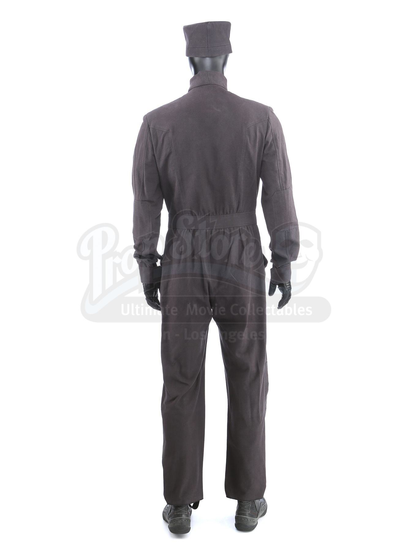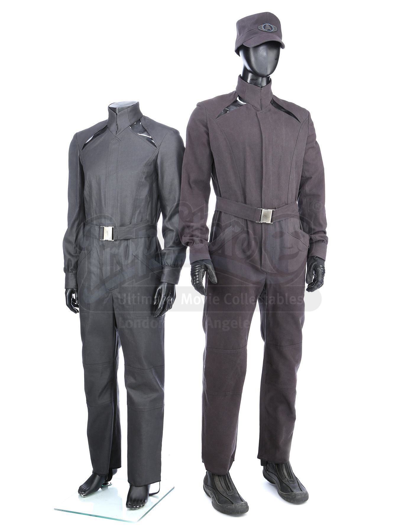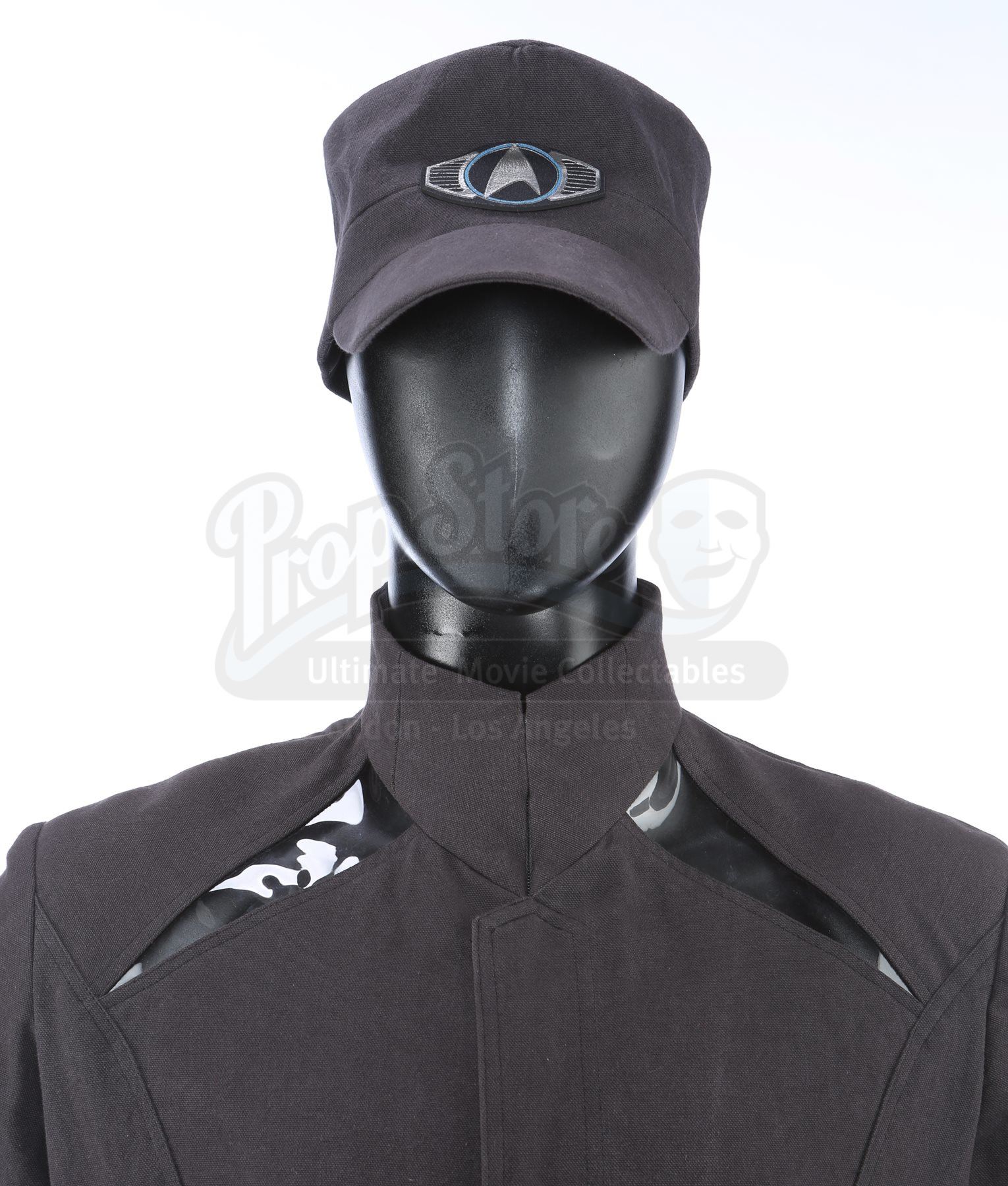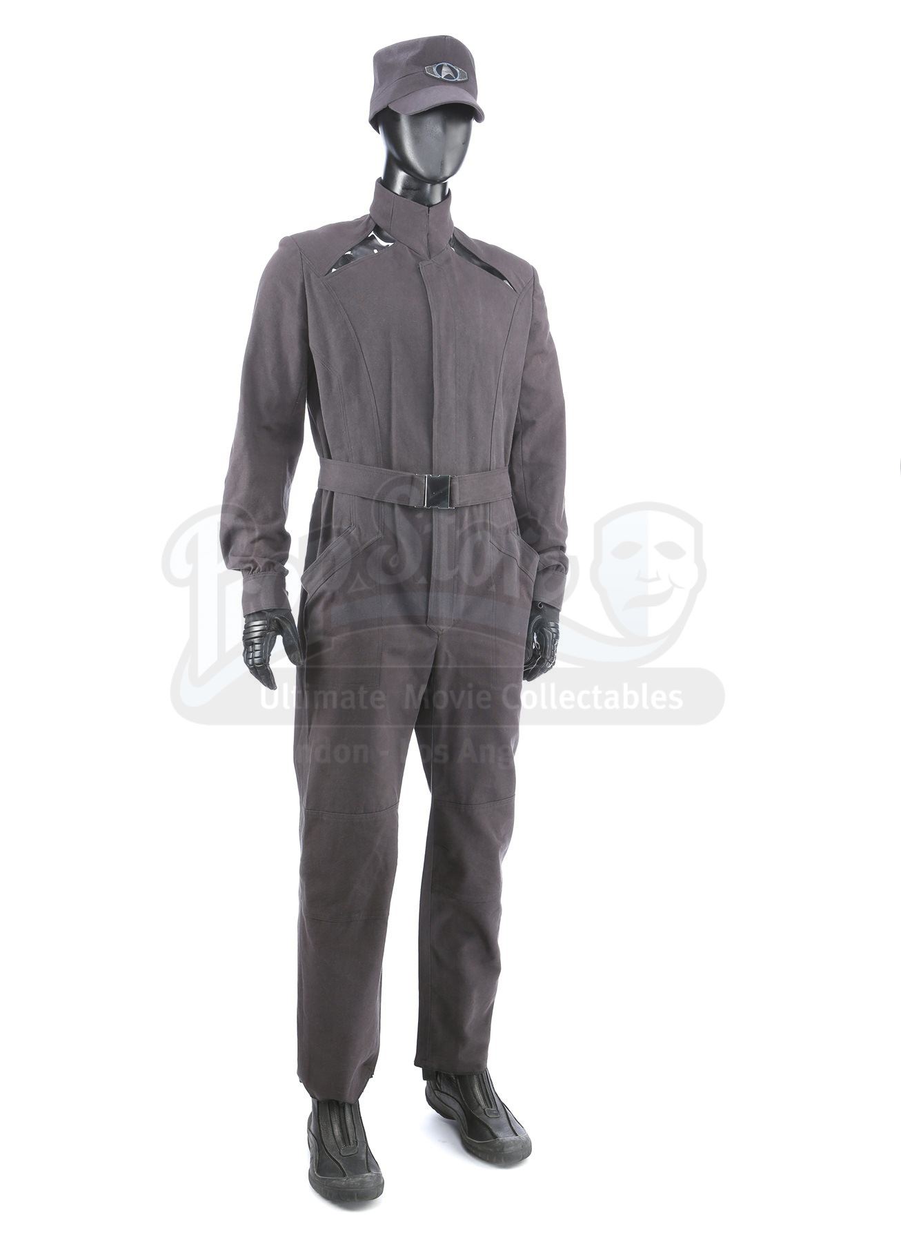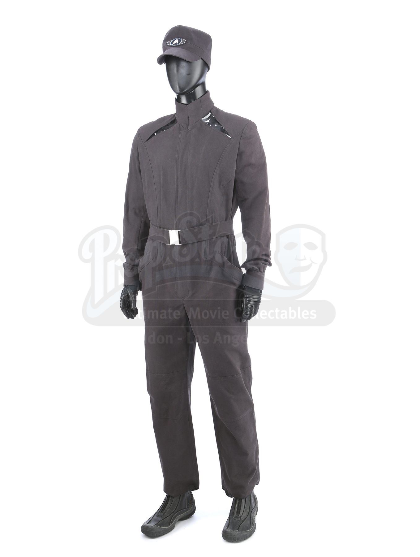 A pair of Starfleet loader uniforms from Star Trek Into Darkness. Loaders worked in the Section 31 base beneath the Kelvin Memorial Library before it was destroyed in a massive explosion. The lot includes two jumpsuits (size 44 and 42), a military cap, a pair of gloves, and a pair of shoes (10M). The cap is made of nylon with a foam Starfleet patch stitched to the front. The custom-made jumpsuits are made of heavy nylon with a zipper at the front and include a built-in belt at the waists. Both the gloves and the shoes are made of nylon and leather, with the shoes featuring a zipper closure. Estimate: $800 - 1200*Estimated sale price; sold without reserve.