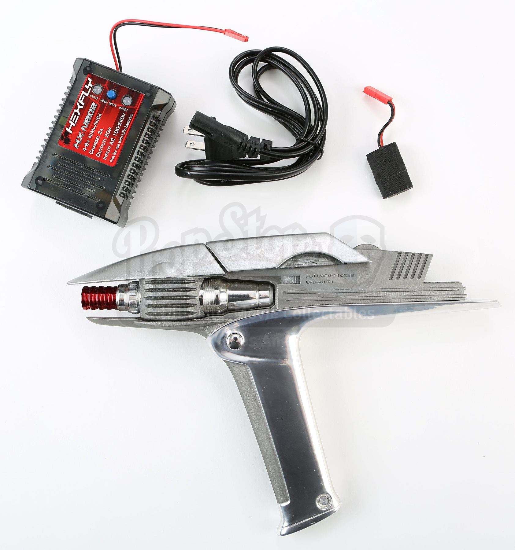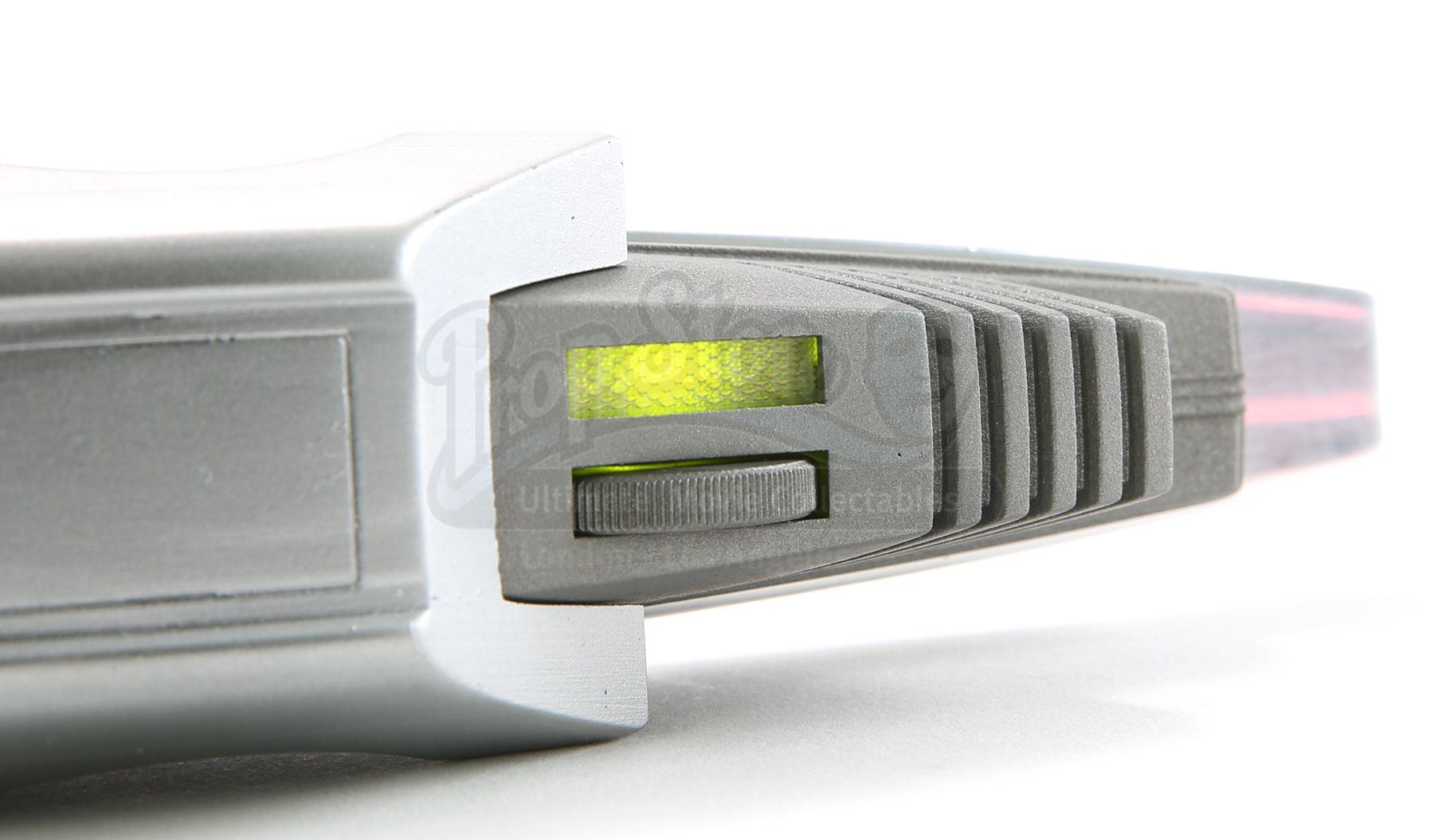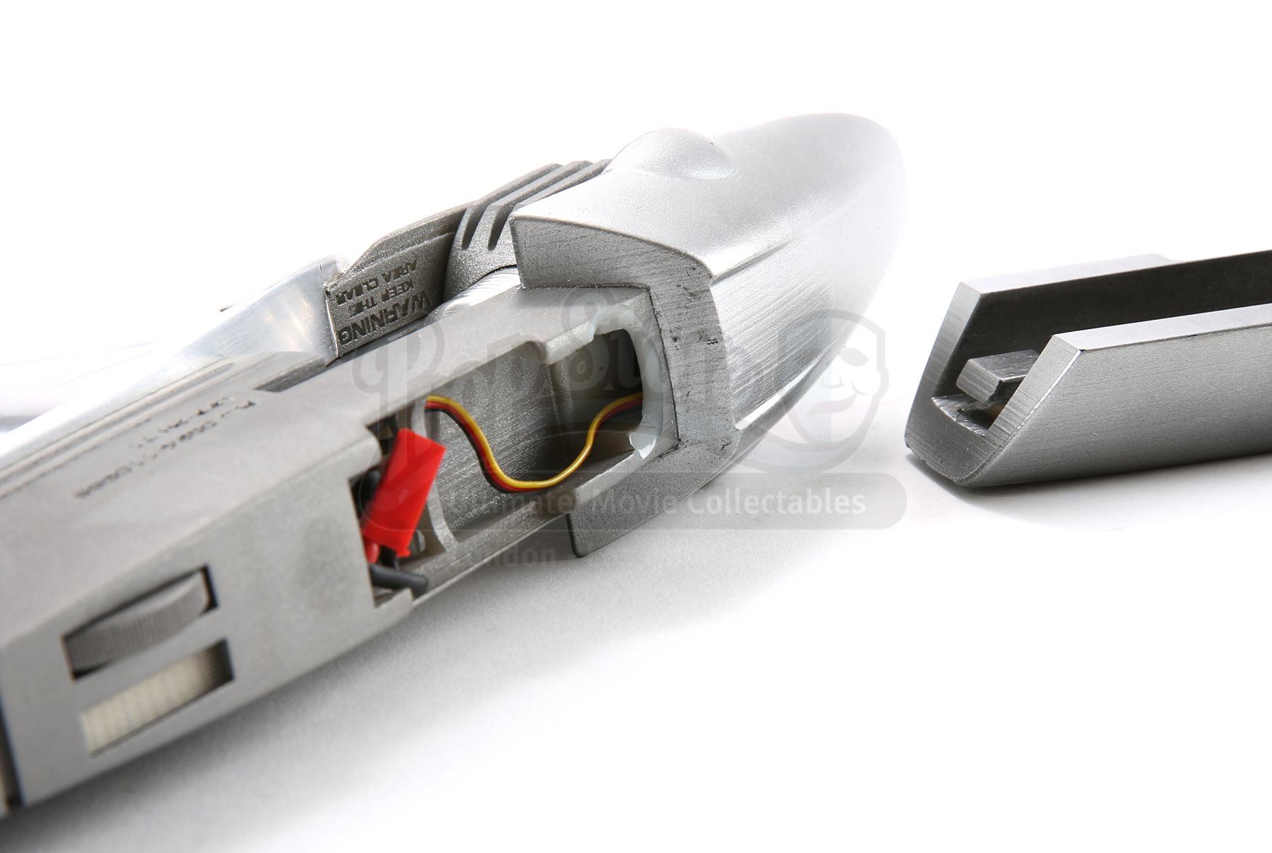 The resin phaser features an electronic rotating emitter at the front of the device, which is controlled by a button on the grip, alternating between the red "kill" barrel and silver "stun" barrel. The prop also features an LED light panel on the top of the body that can be set to illuminate green or red via the adjacent scroll wheel. The battery compartment is designed to hold a small rechargeable battery and the battery cover attaches via magnets Included are a charger and battery which have been added to the lot to the make piece functional and are not from the production. Dimensions: 10 ½" x 2 ¼" x 7 ½" (27 cm x 6 cm x 19 cm)