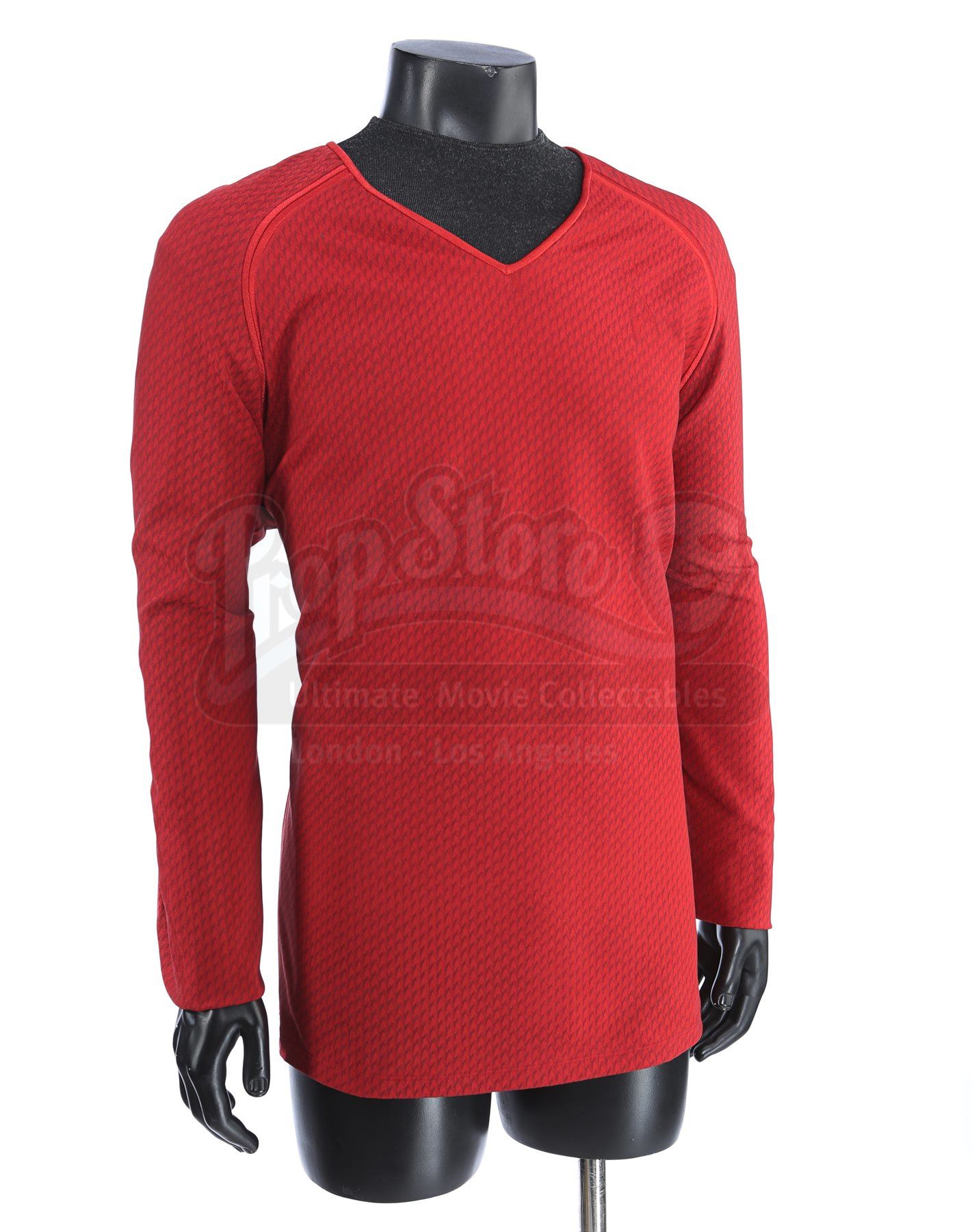 Made specifically for the sequel, the red tunic is made of Spandex and features a printed optical repeat Starfleet insignia pattern. The long-sleeved shirt has piping around the collar and a hidden zipper at the left shoulder. The undershirt consists of a grey polyester collar that is stitched to the top of a modified Spandex sport shirt.