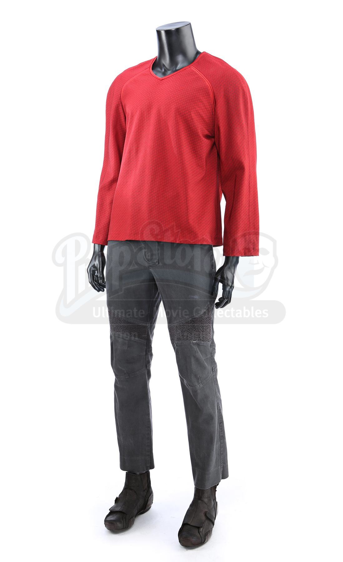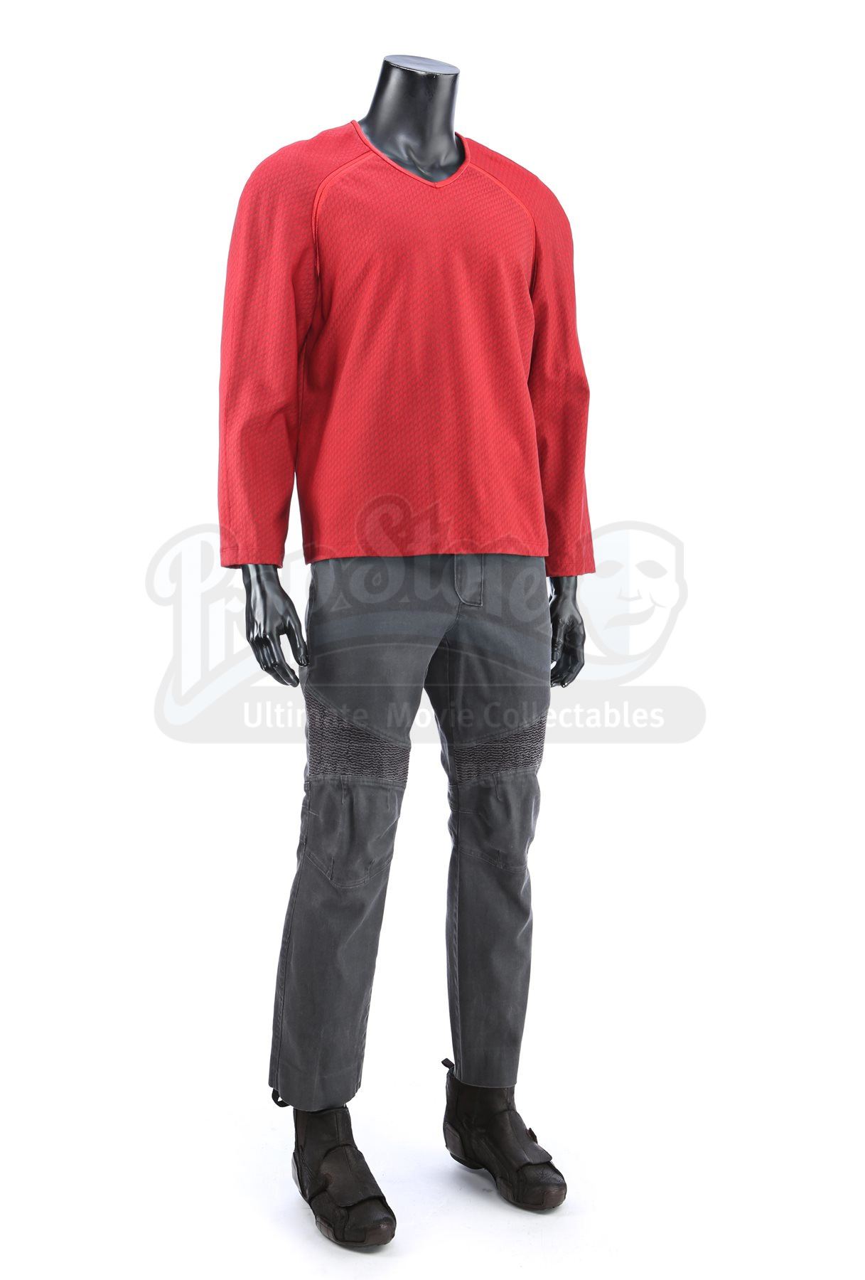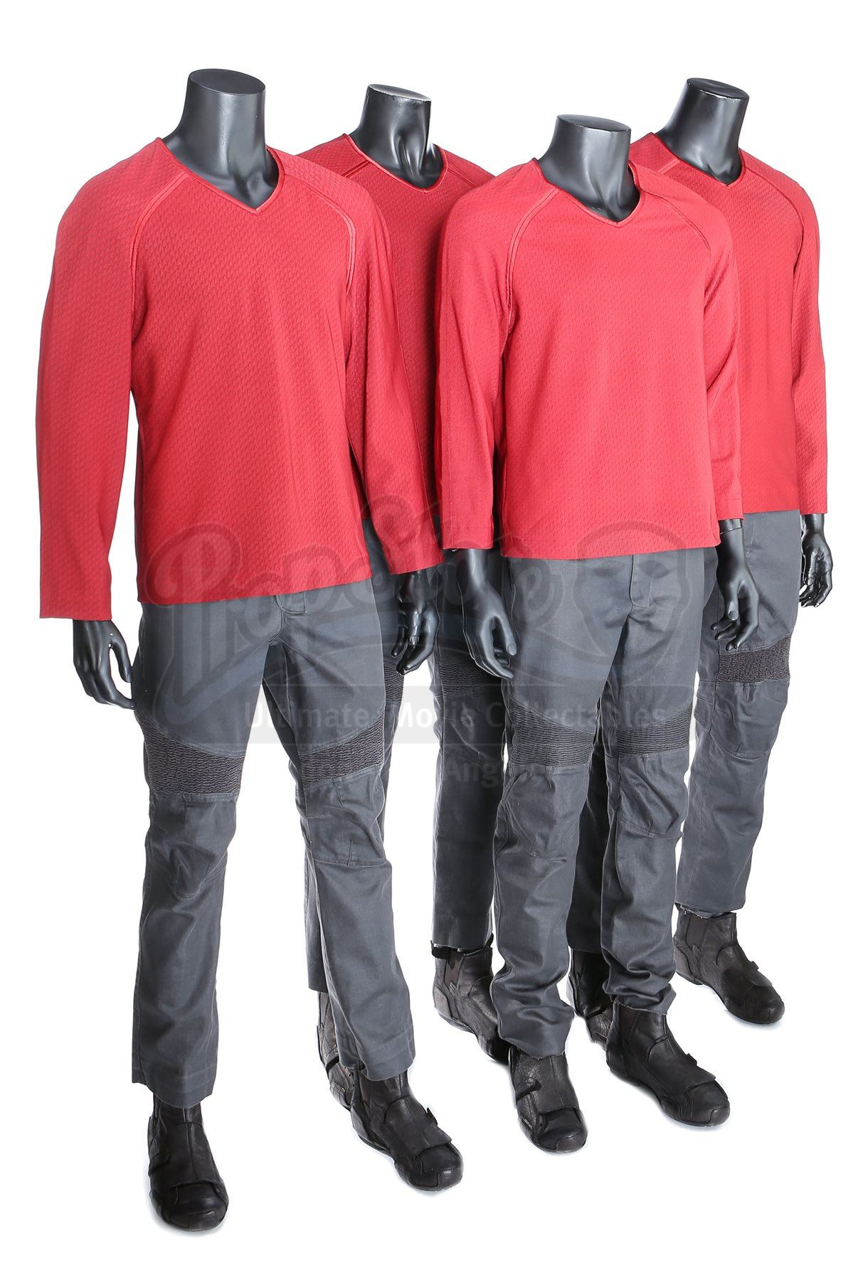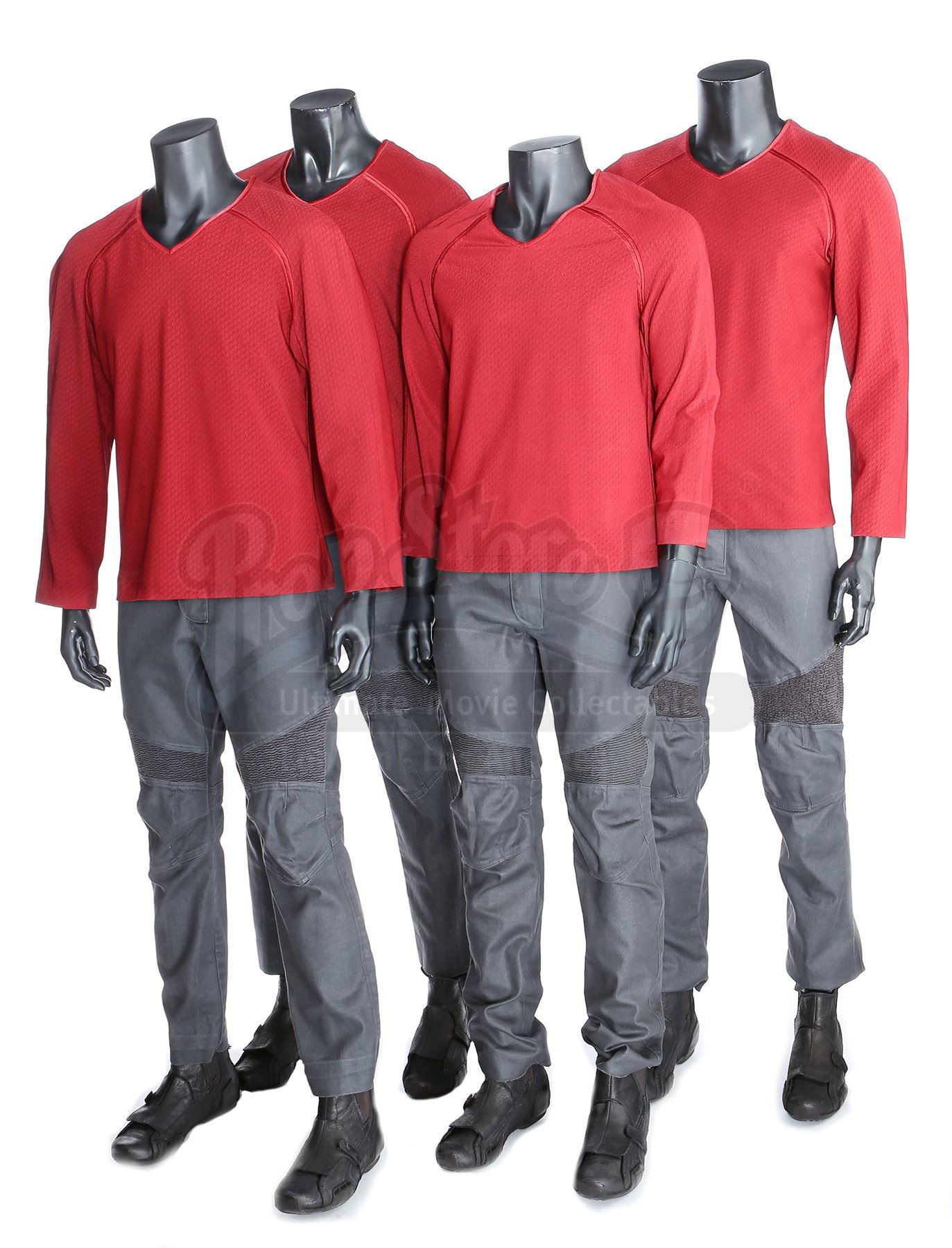 A set of men's operations uniforms from Star Trek Into Darkness. Enterprise staff in the operations division wore their uniforms while aboard the Enterprise. The set includes four tunics (one marked size 42, two marked size 44, and one approximate size large), four pairs of pants (one marked size 34, three marked size 36) and four pairs of boots (marked U.S. sizes 10, 11, 11.5 and 12). Made specifically for the sequel, the red tunics are made of Spandex, have piping around the collar and feature a printed optical repeat Starfleet insignia pattern. The long-sleeved shirts also have hidden zippers at the left shoulders. The grey twill pants were made specifically for the sequel and have ribbed fabric diagonally above the knees. Also included are four pairs of black leather boots with rubber soles.The lot also includes a wardrobe tag with hand-written notes about the costume.Estimate: $3000 - 5000*Estimated sale price; sold without reserve.
