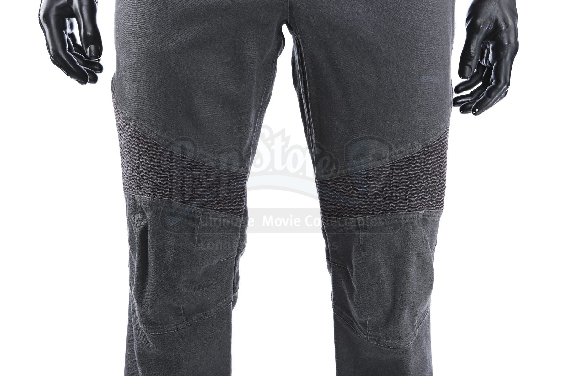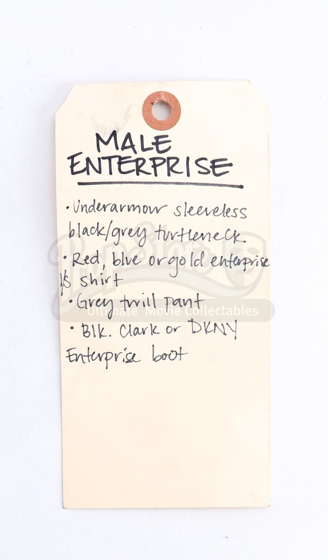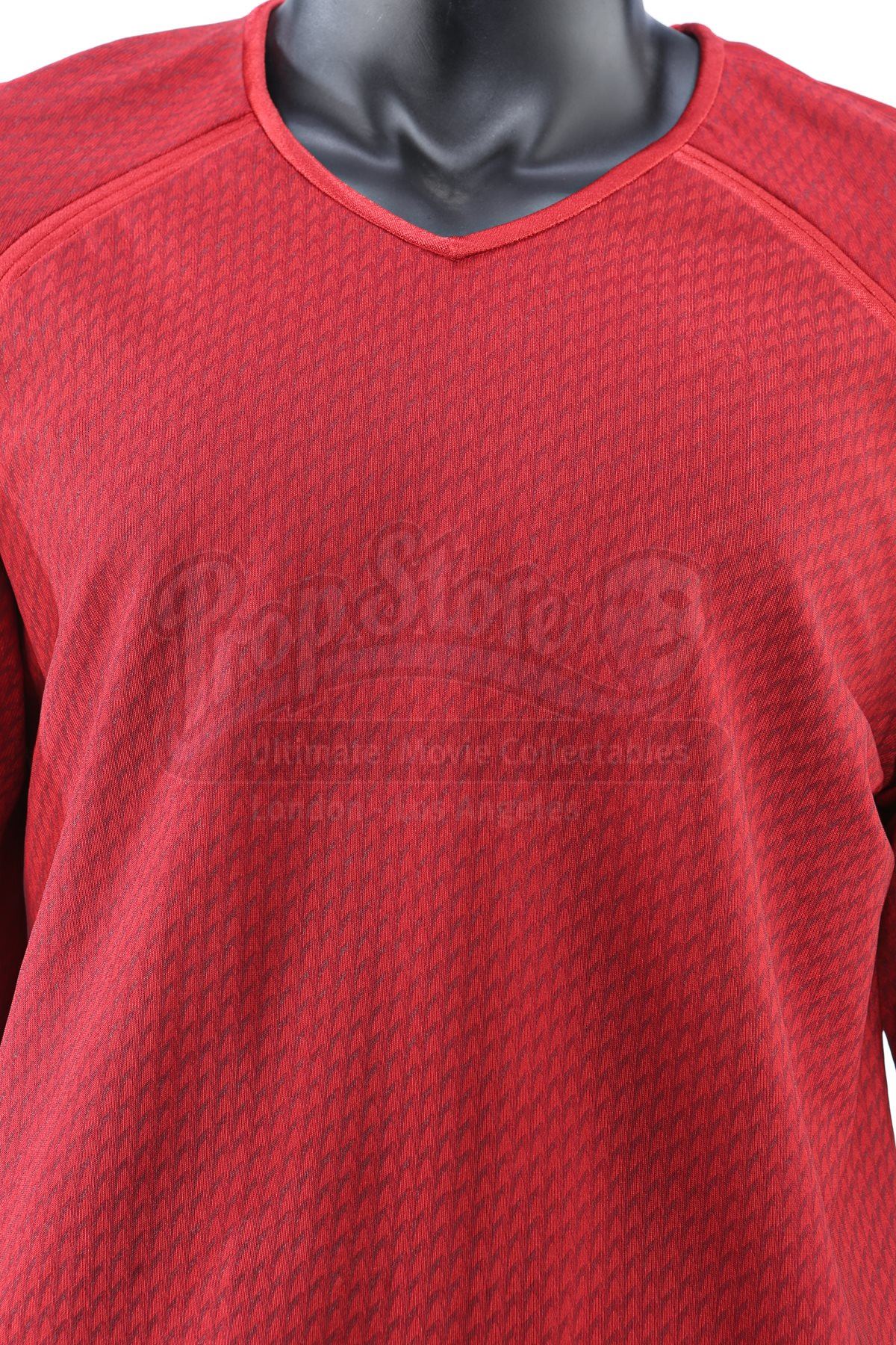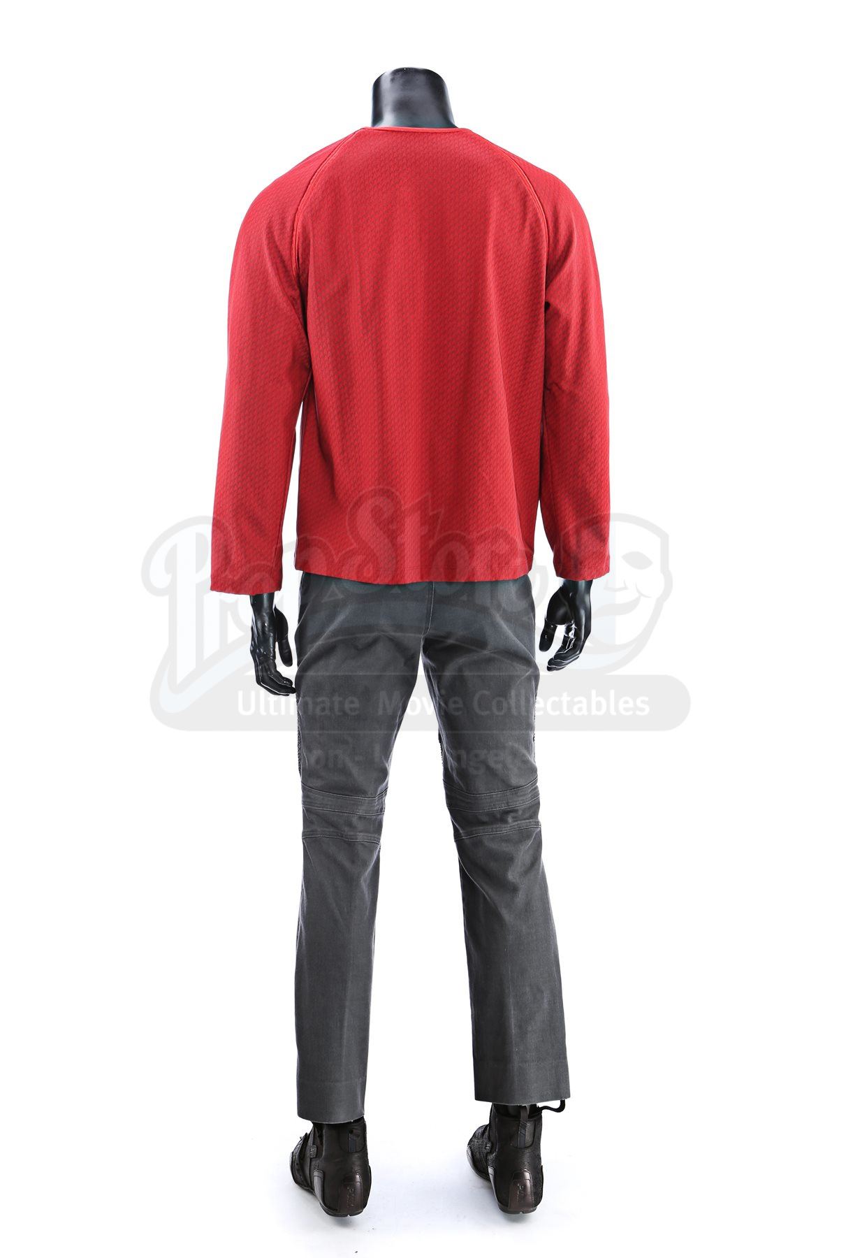 A set of men's operations uniforms from Star Trek Into Darkness. Enterprise staff in the operations division wore their uniforms while aboard the Enterprise. The set includes four tunics (one marked size 42, two marked size 44, and one approximate size large), four pairs of pants (one marked size 34, three marked size 36) and four pairs of boots (marked U.S. sizes 10, 11, 11.5 and 12). Made specifically for the sequel, the red tunics are made of Spandex, have piping around the collar and feature a printed optical repeat Starfleet insignia pattern. The long-sleeved shirts also have hidden zippers at the left shoulders. The grey twill pants were made specifically for the sequel and have ribbed fabric diagonally above the knees. Also included are four pairs of black leather boots with rubber soles.The lot also includes a wardrobe tag with hand-written notes about the costume.Estimate: $3000 - 5000*Estimated sale price; sold without reserve.