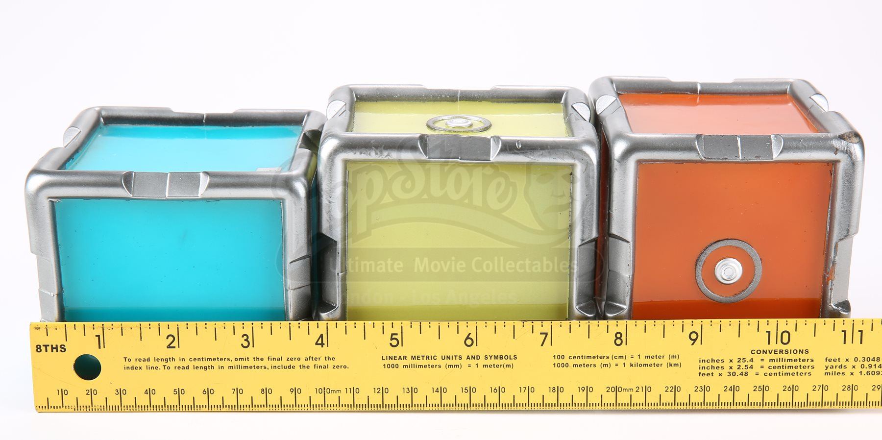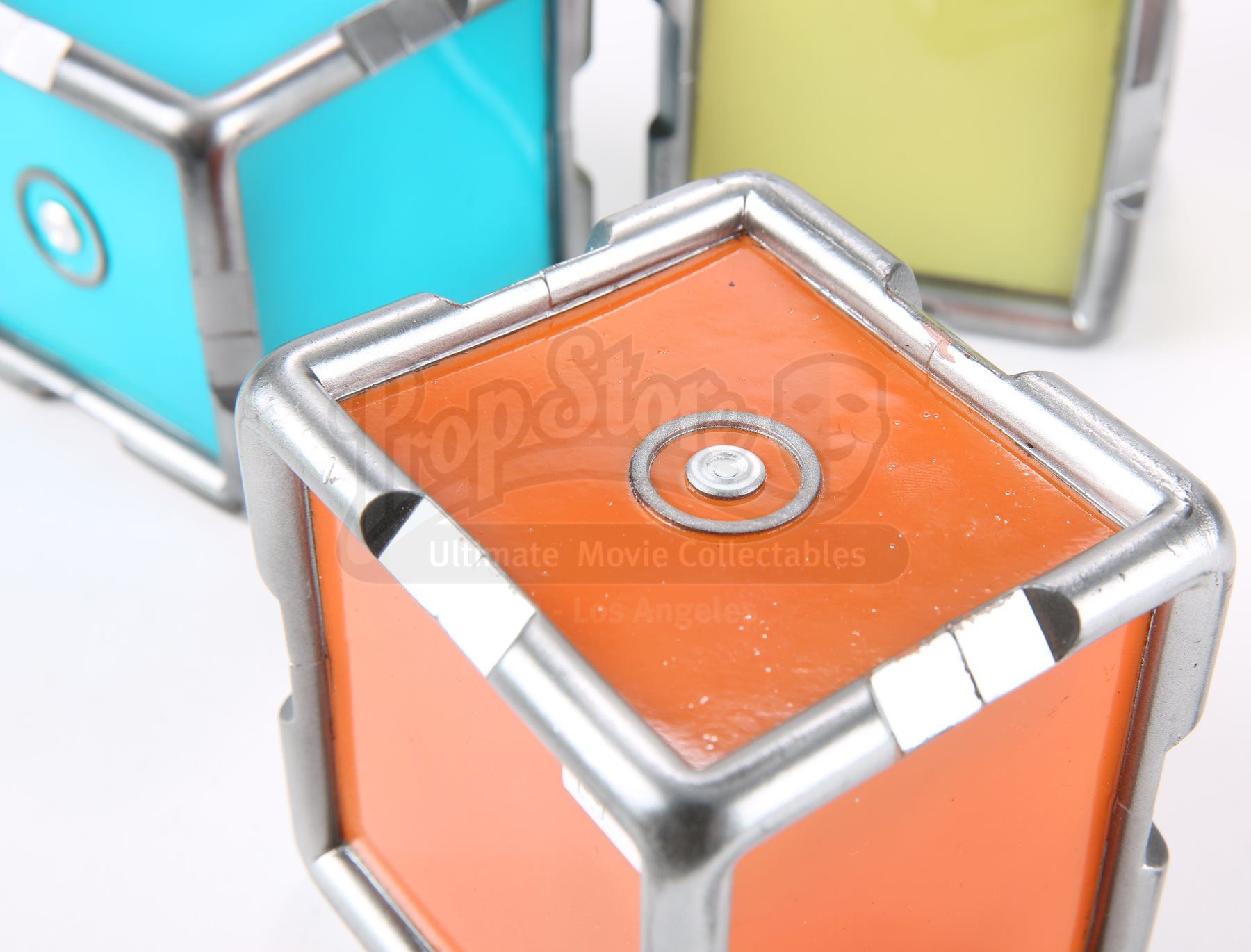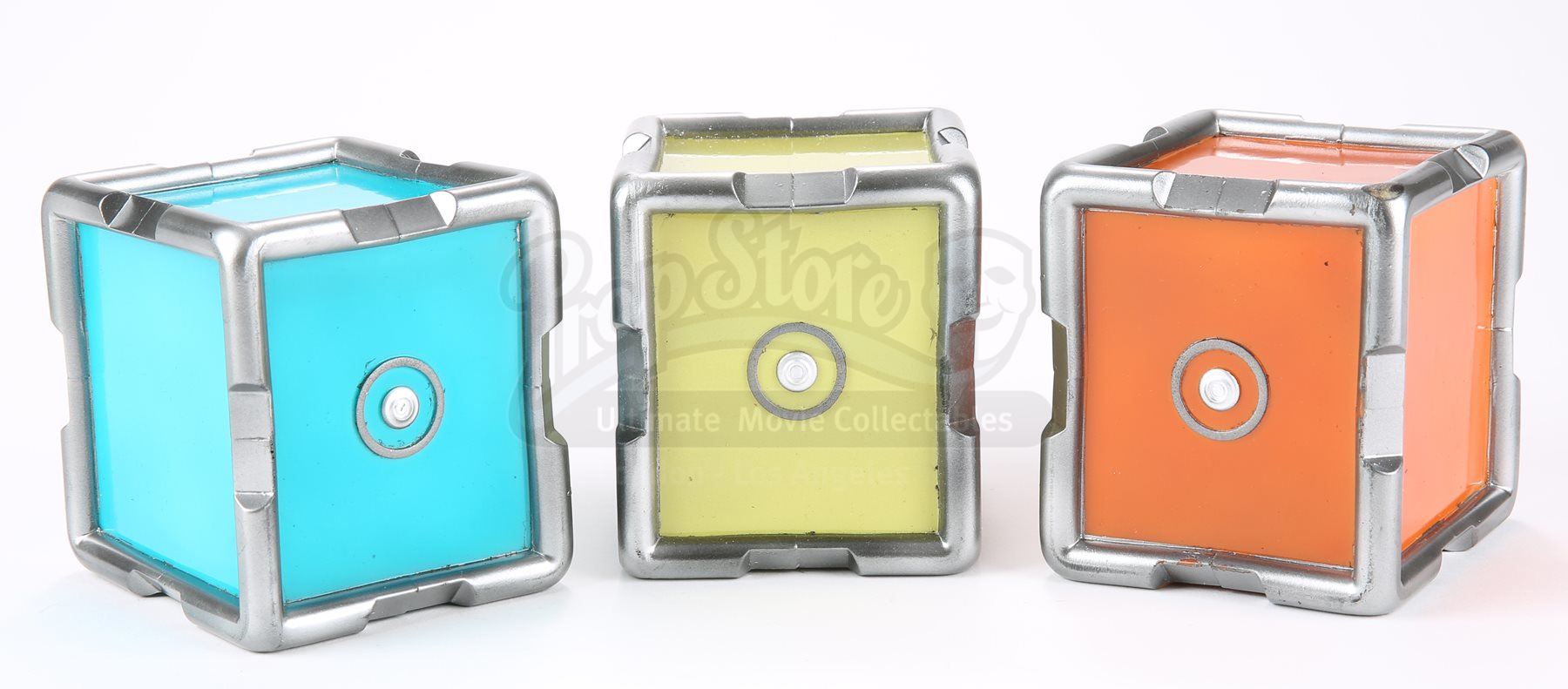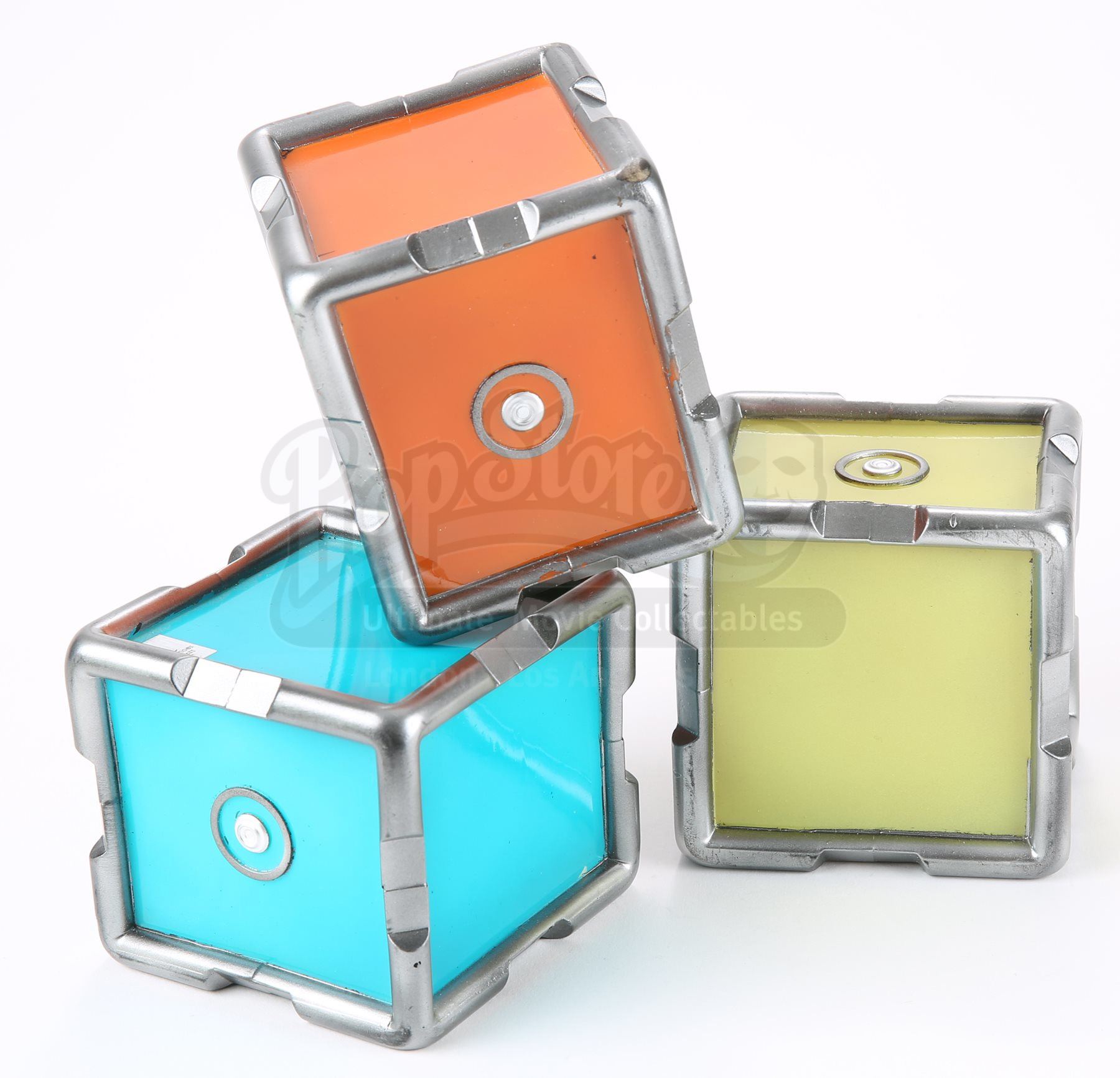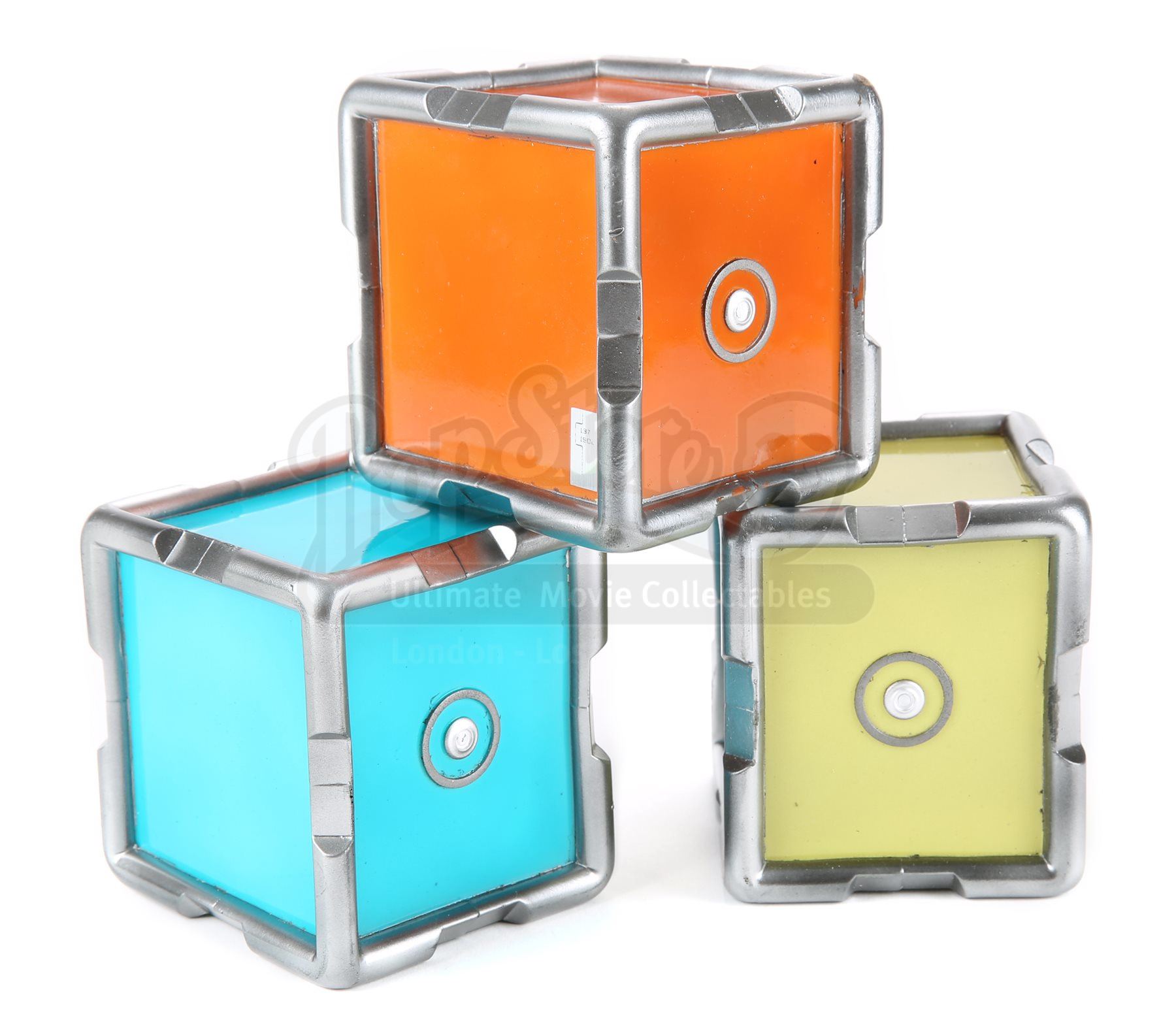 A set of three stunt cold fusion device cubes from Star Trek Into Darkness. Three cubes fit inside the cold fusion device that Mr. Spock rigged to detonate within an erupting volcano on the M-class planet Nibiru. The cubes are made of dense urethane and are painted in neon shades of blue, yellow and orange, with the casing painted metallic silver. Dimensions: 10" x 3 ¾" x 3 ¾" (25 cm x 9.5 cm x 9.5 cm)Estimate: $800 - 1000*Estimated sale price; sold without reserve.