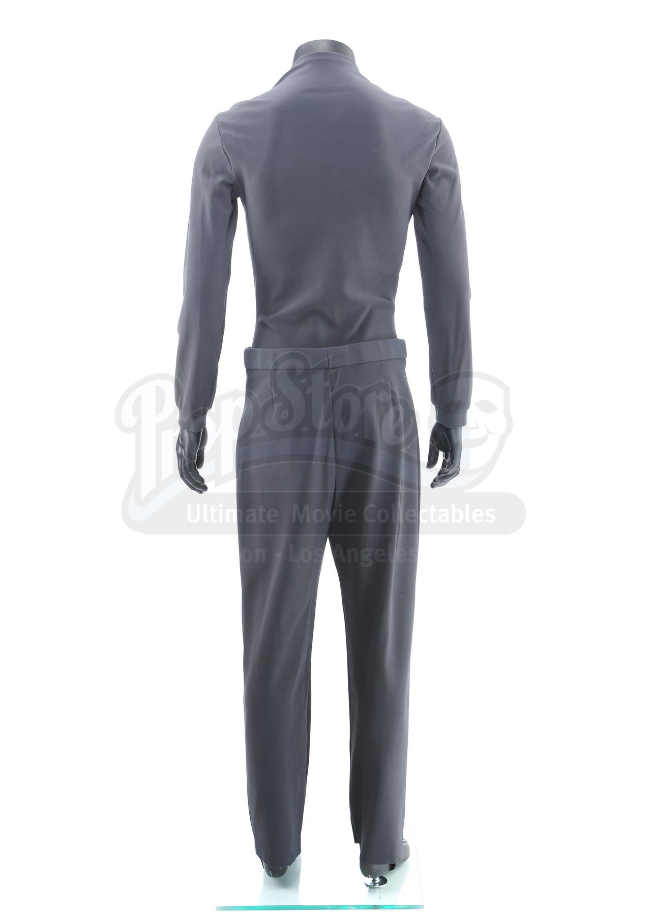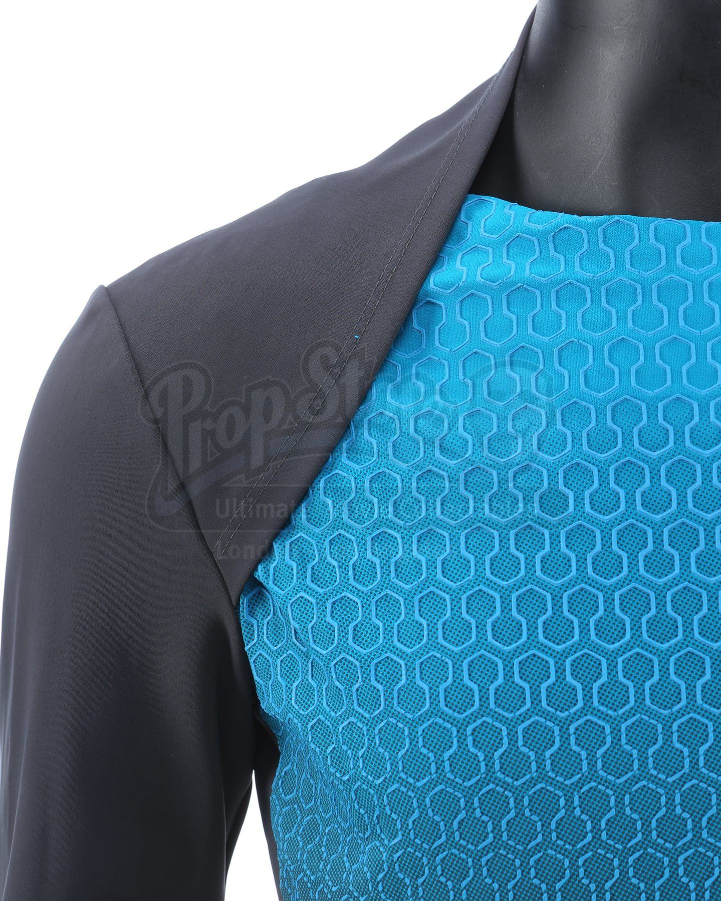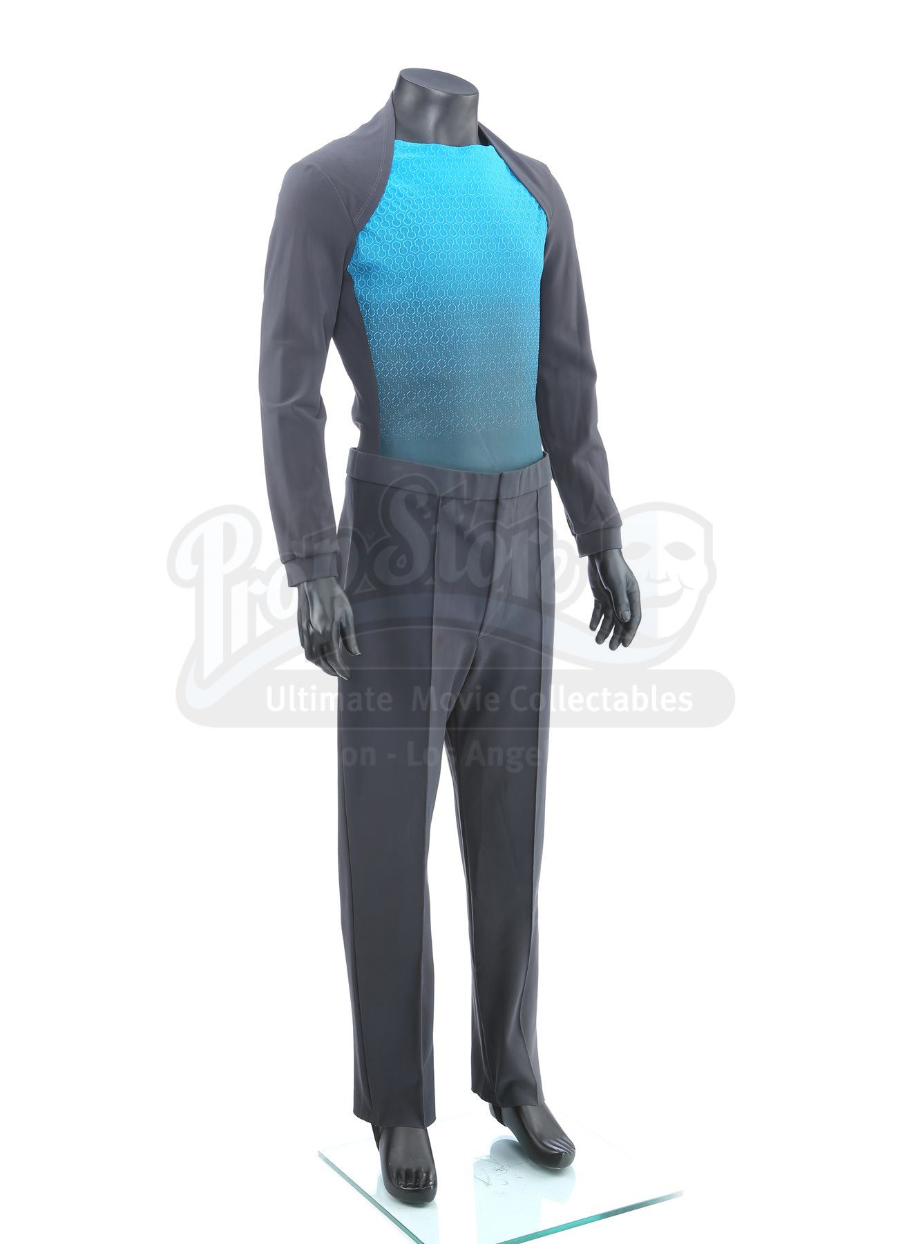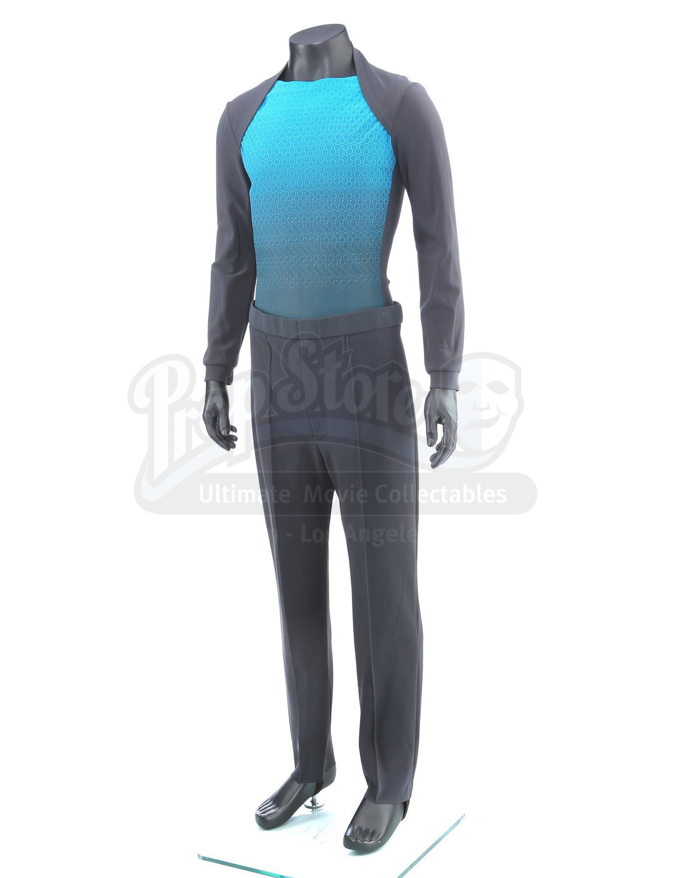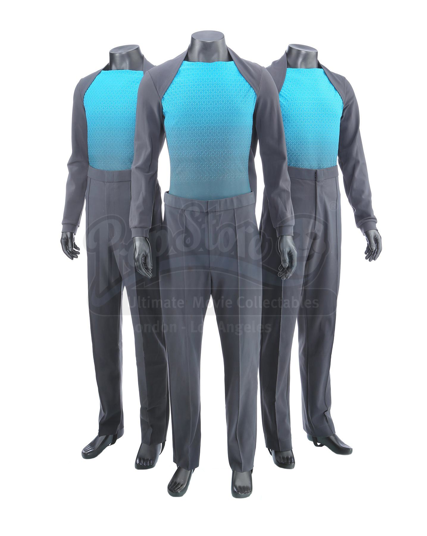 A set of three Vengeance crew member uniforms from Star Trek Into Darkness. The crew of the USS Vengeance wore their uniforms while onboard the secret vessel. The costume consists of three sets of tunics (approximate size large), undershirts (two large, one medium) and pants (approximate size large). The black tunics are made of Spandex and feature aqua front panels with a rubber honeycomb pattern. The undershirts consist of black Spandex sport shirts with shoulder pads. The dark blue pocket-free pants are made of Spandex. The costume features sewn-in wardrobe labels with the actor's name in one undershirt and one pair of pants. Estimate: $1500 - 2500*Estimated sale price; sold without reserve.