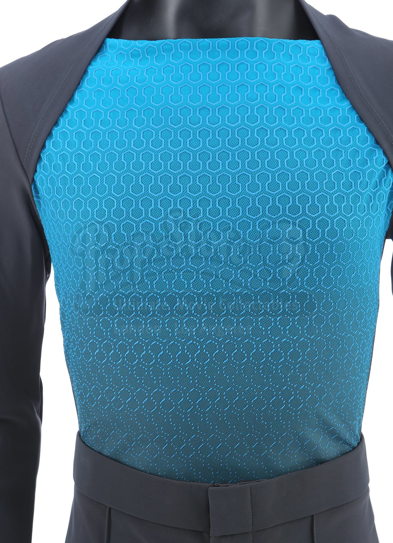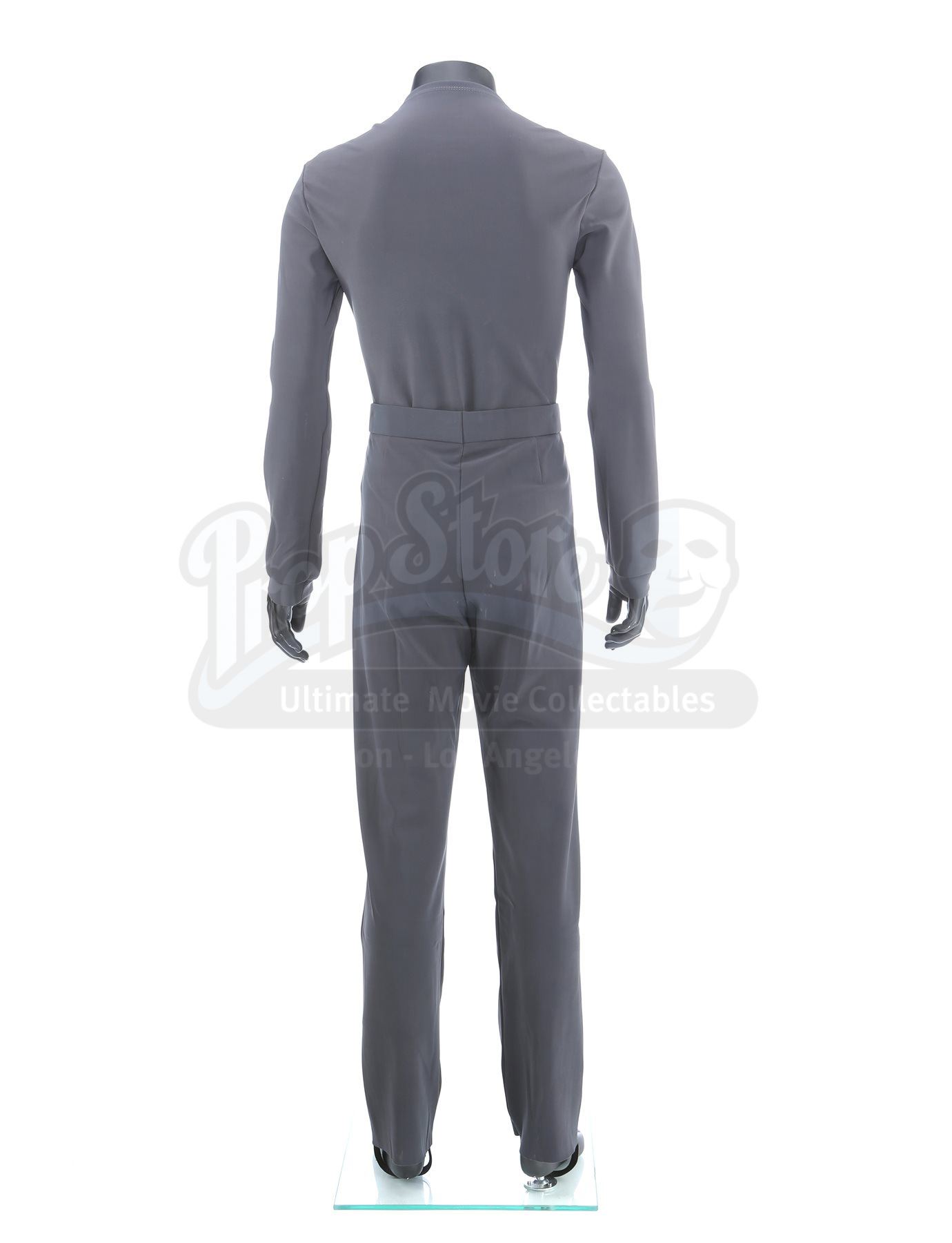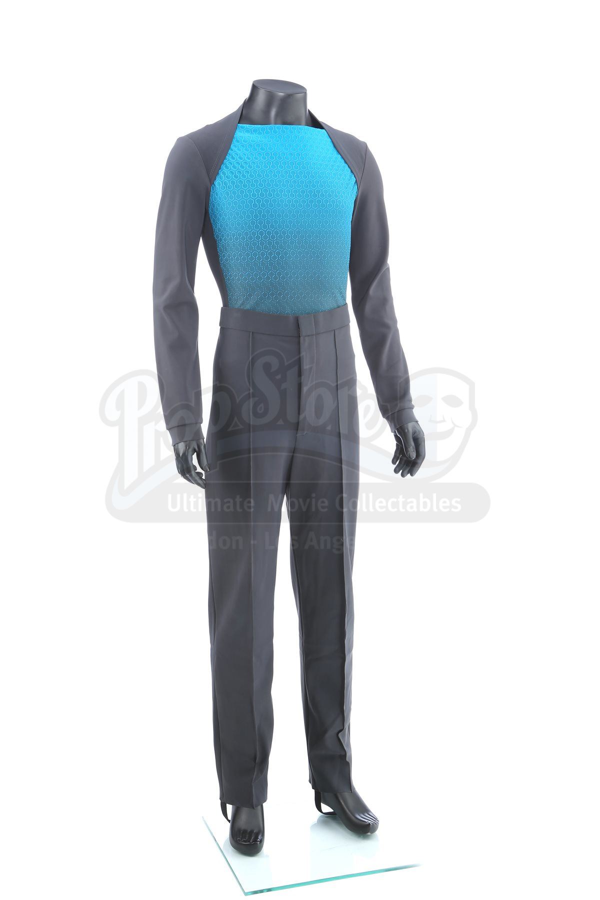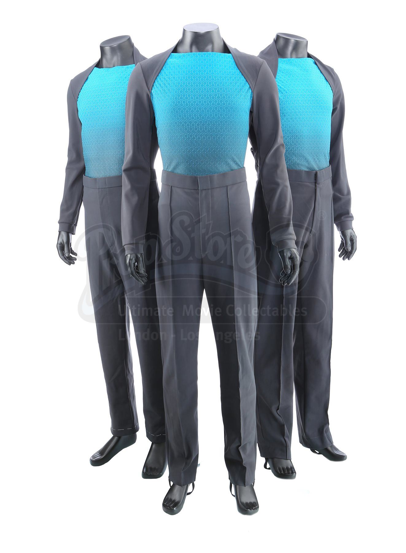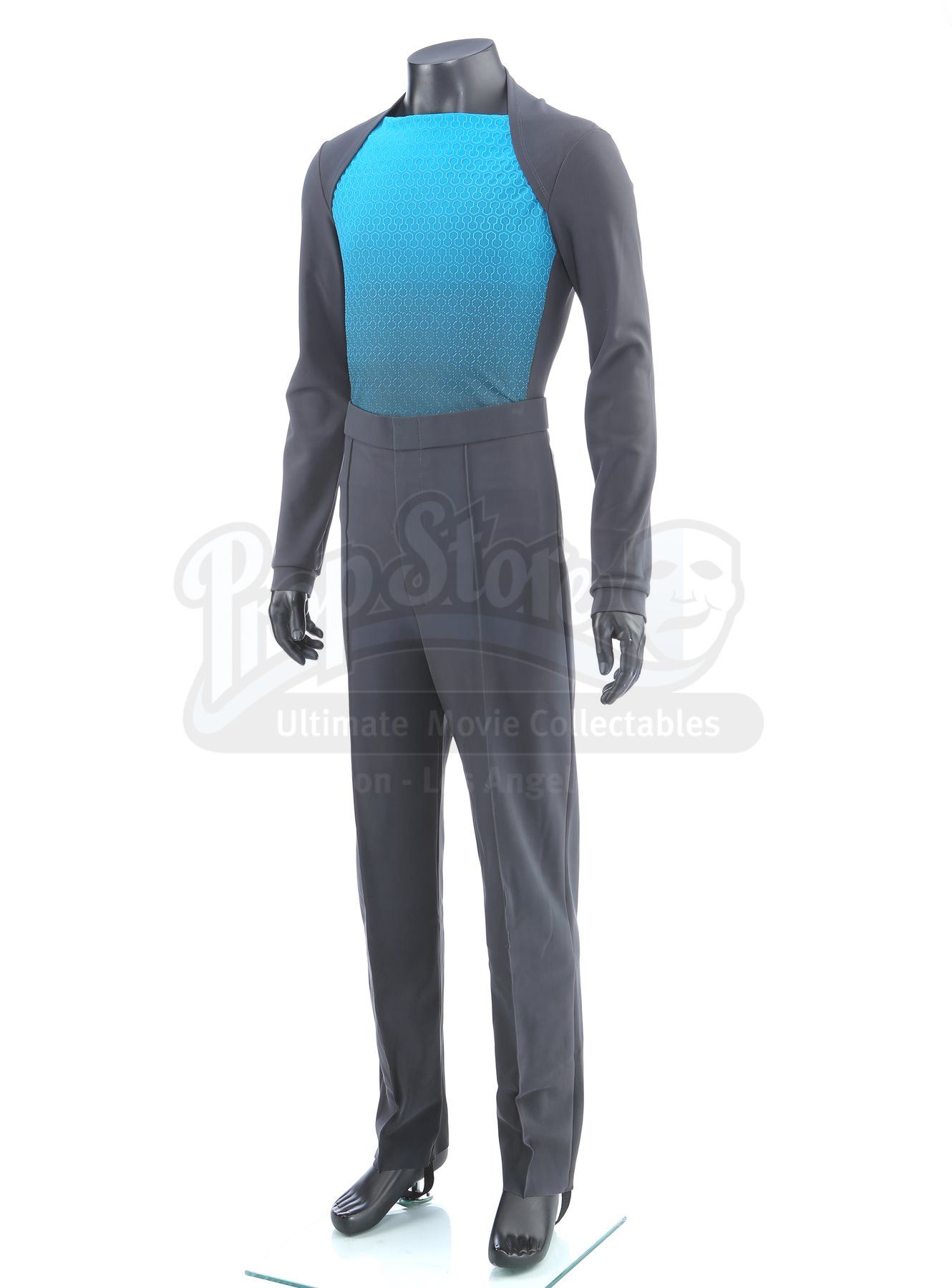 A set of three Vengeance crew member uniforms from Star Trek Into Darkness. The crew of the USS Vengeance wore their uniforms while onboard the secret vessel. The costume consists of three sets of tunics (approximate size large), undershirts (one extra large, two large) and pants (approximate size large). The black tunics are made of Spandex and feature aqua front panels with a rubber honeycomb pattern. The undershirts consist of black Spandex sport shirts with shoulder pads. The dark blue pocket-free pants are made of Spandex. The costume features sewn-in wardrobe labels with the actor's name in several components. The lot shows minor wear due to production use with the pants unfinished, but remains in otherwise very good condition.Estimate: $1500 - 2500*Estimated sale price; sold without reserve.