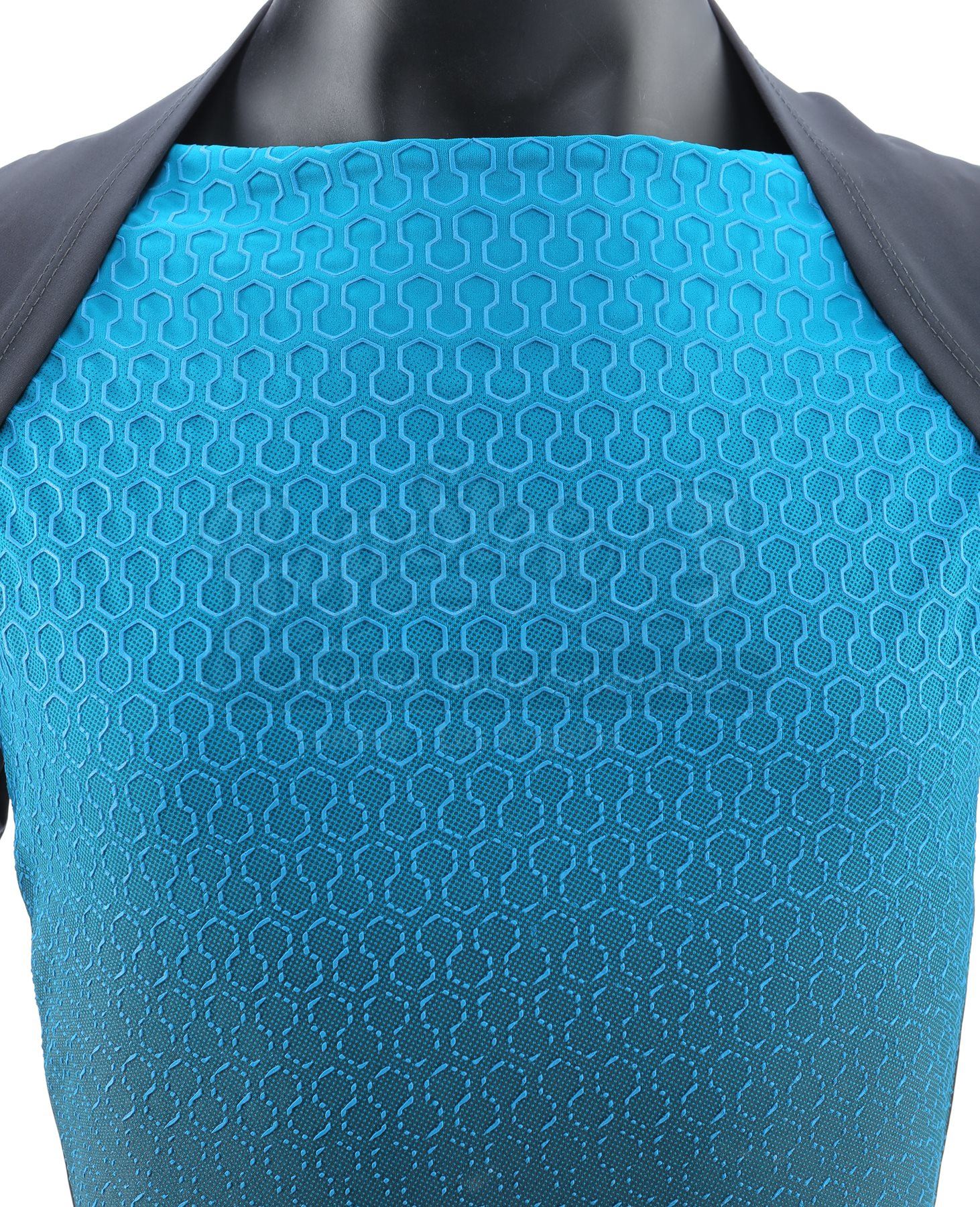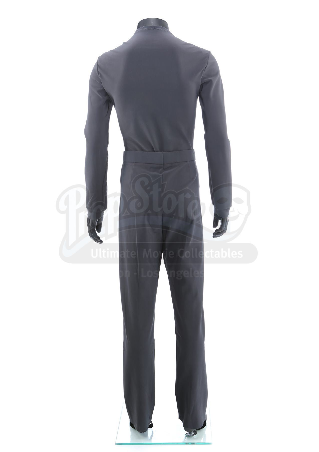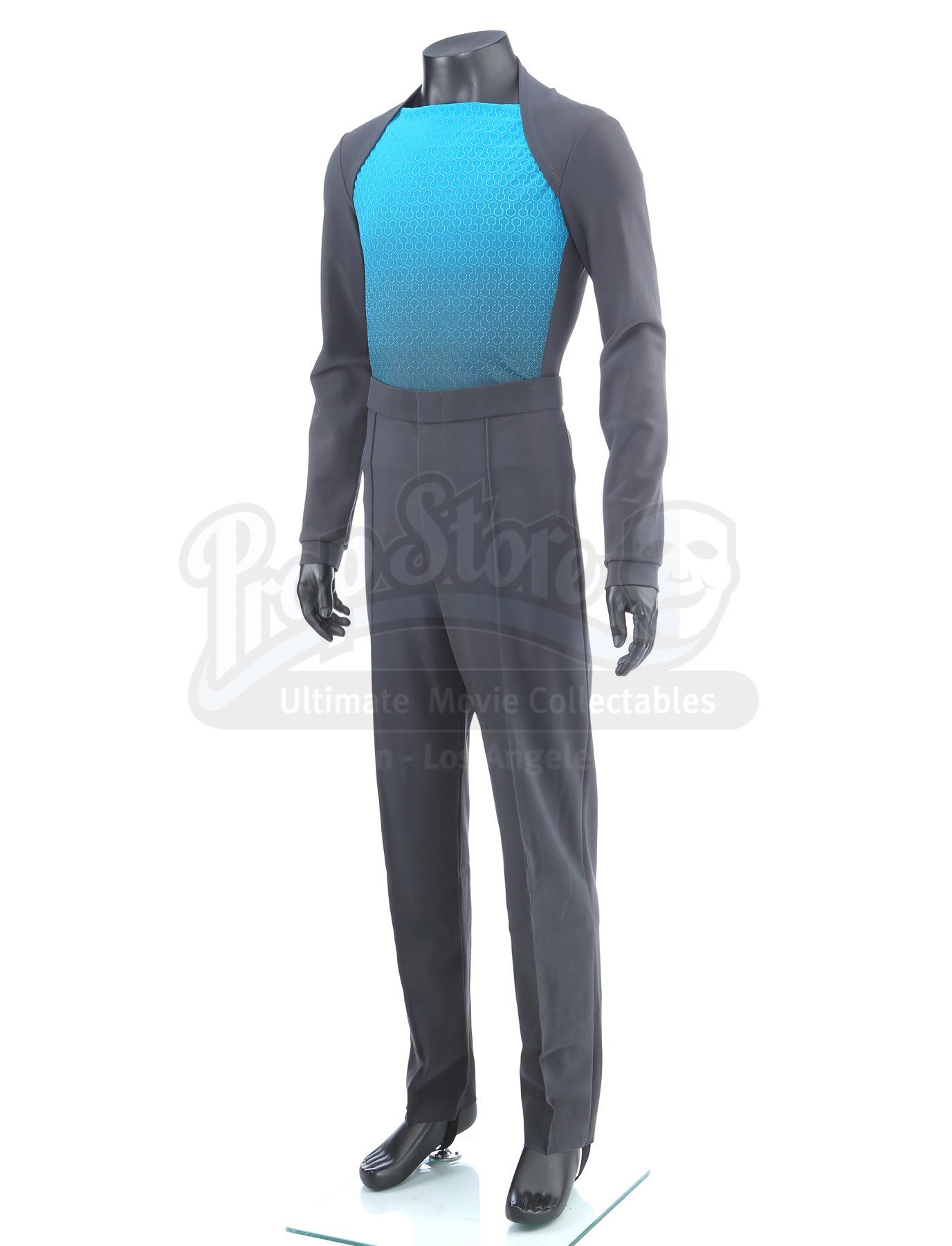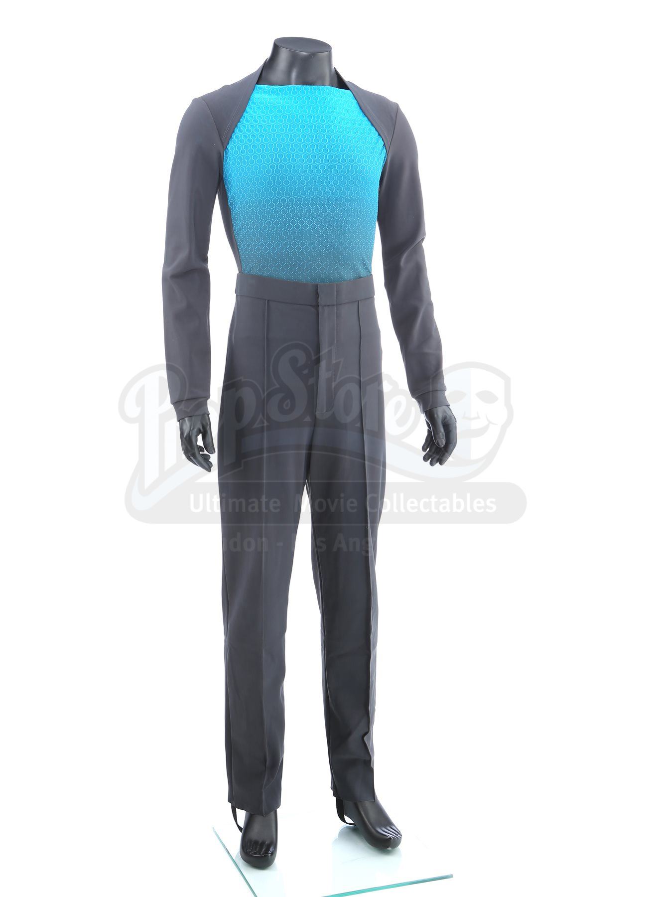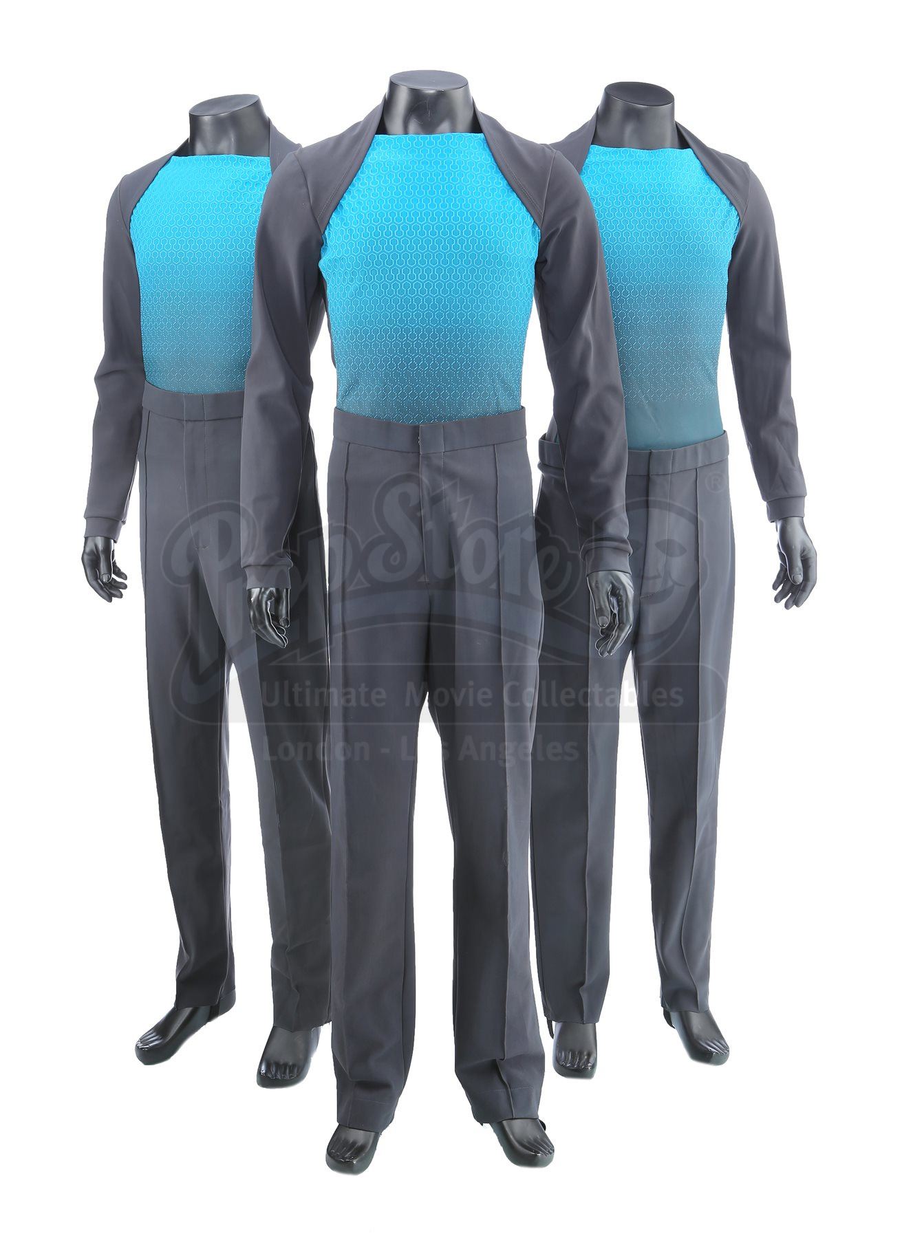 A set of three Vengeance crew member uniforms from Star Trek Into Darkness. The crew of the USS Vengeance wore their uniforms while onboard the secret vessel. The costume consists of three sets of tunics (approximate size large), undershirts (two extra large, one medium) and pants (approximate size large). The black tunics are made of Spandex and feature aqua front panels with a rubber honeycomb pattern. The undershirts consist of black Spandex sport shirts with shoulder pads. The dark blue pocket-free pants are made of Spandex. Estimate: $1500 - 2500*Estimated sale price; sold without reserve.