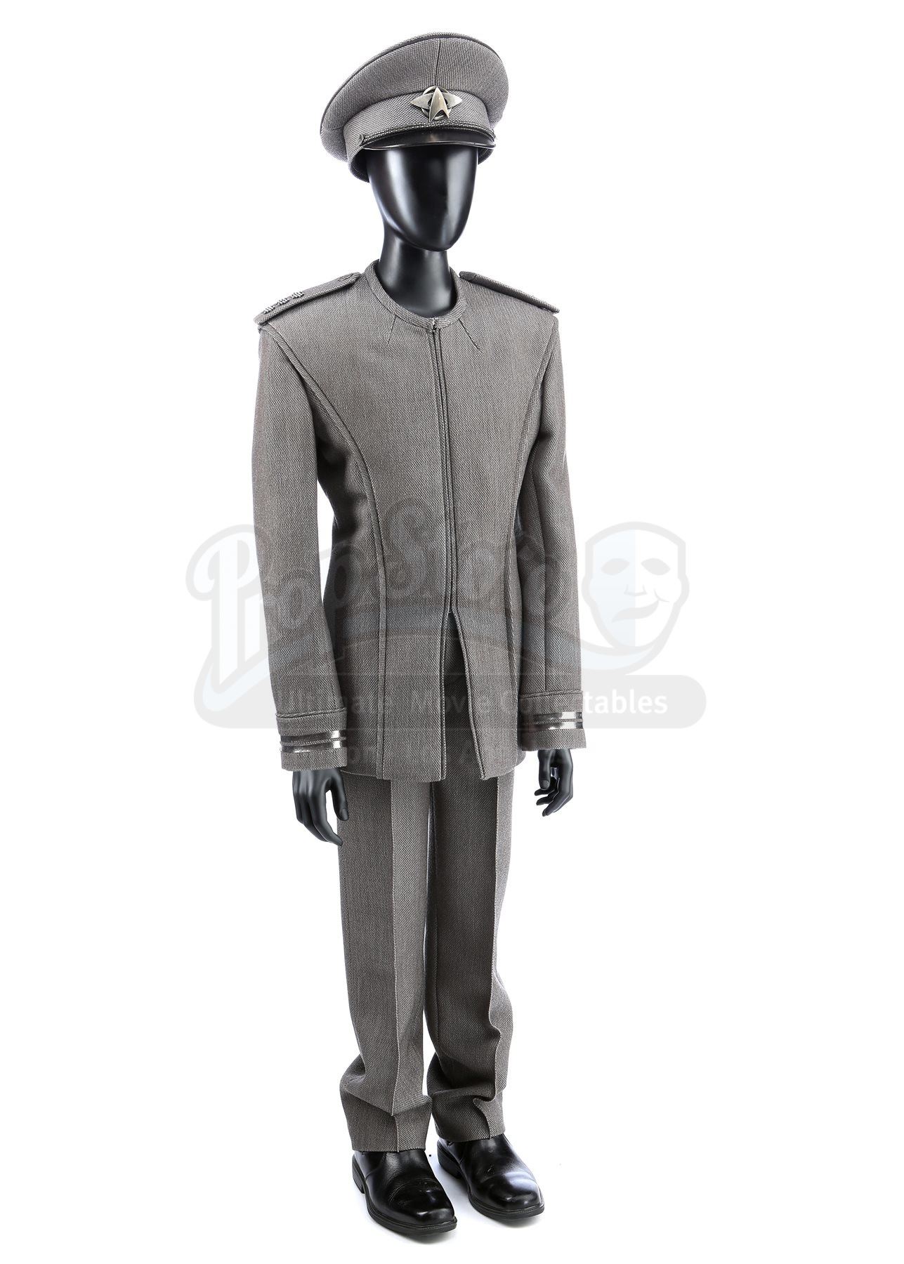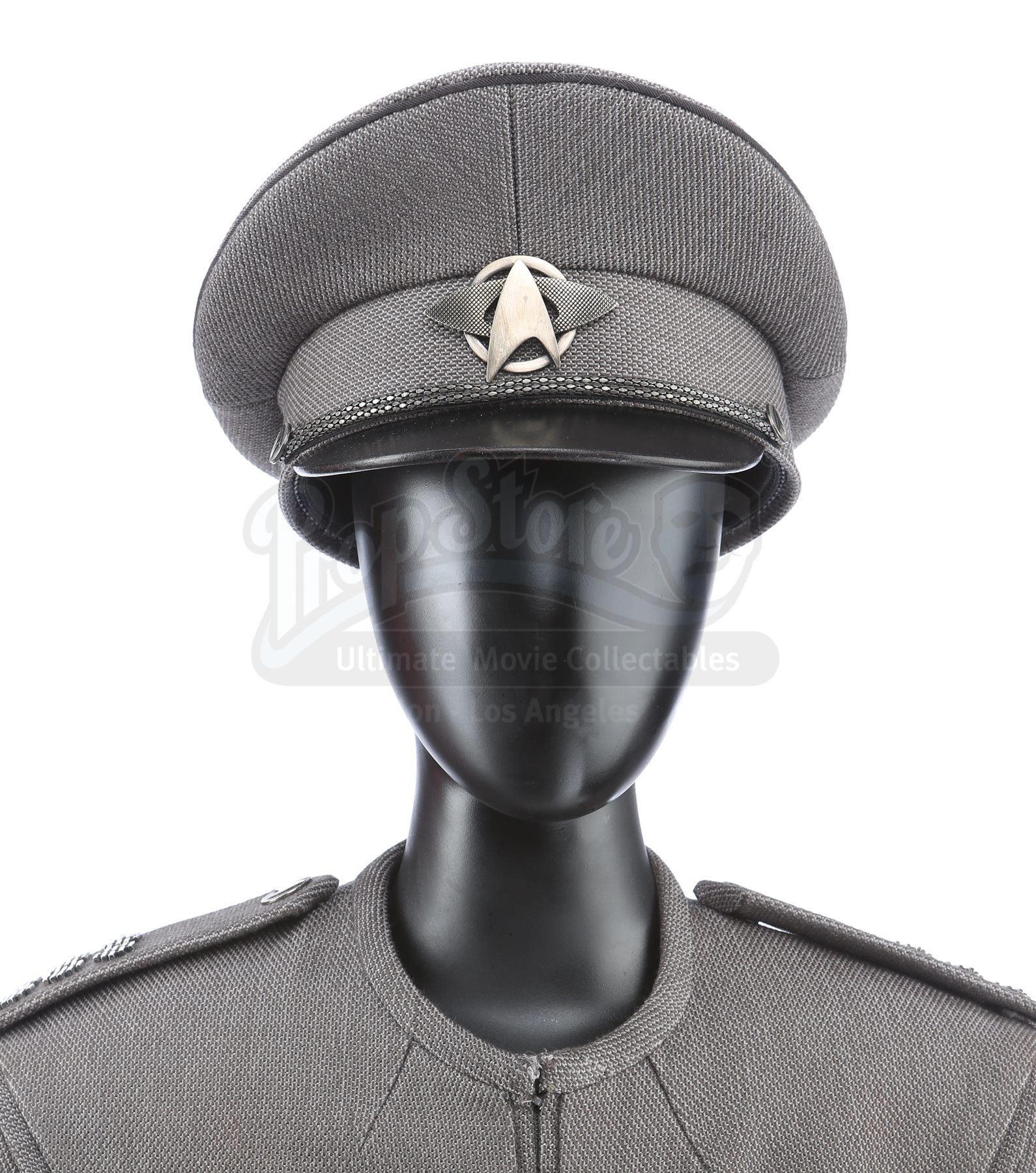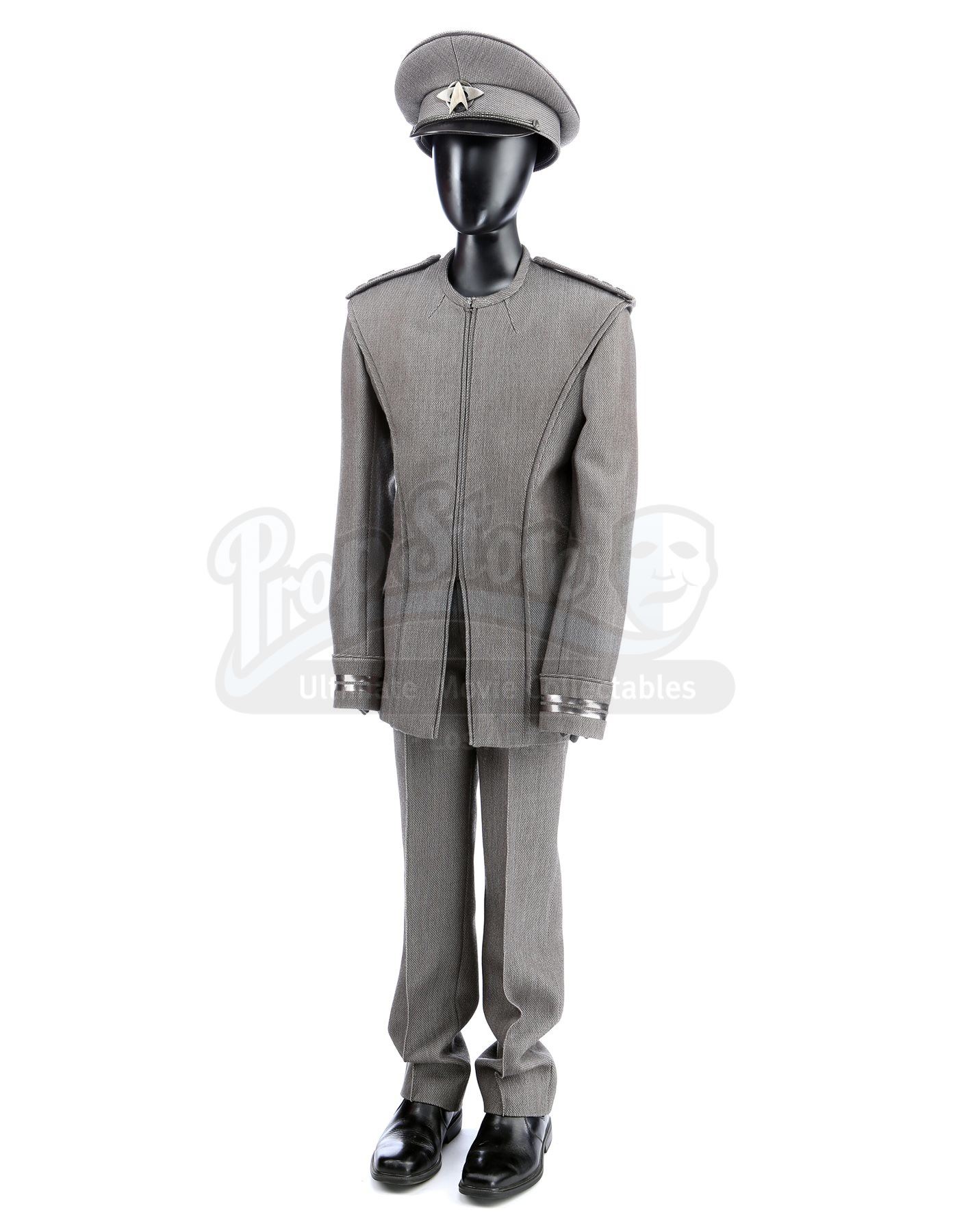 The grey jacket is made of bird's eye-patterned linen and features epaulets on each shoulder and two silver bands on the wrists. The undershirt consists of a black Spandex sport shirt. The grey pants are also made of bird's eye-patterned linen and include a pair of black elastic suspenders. The peaked-style cap is made of the same linen and features metal Starfleet pins attached to the front. Also included is a pair of black leather ankle boots with rubber soles. The boots are the proper type for the costume; they were used in the production but not specifically by this character.